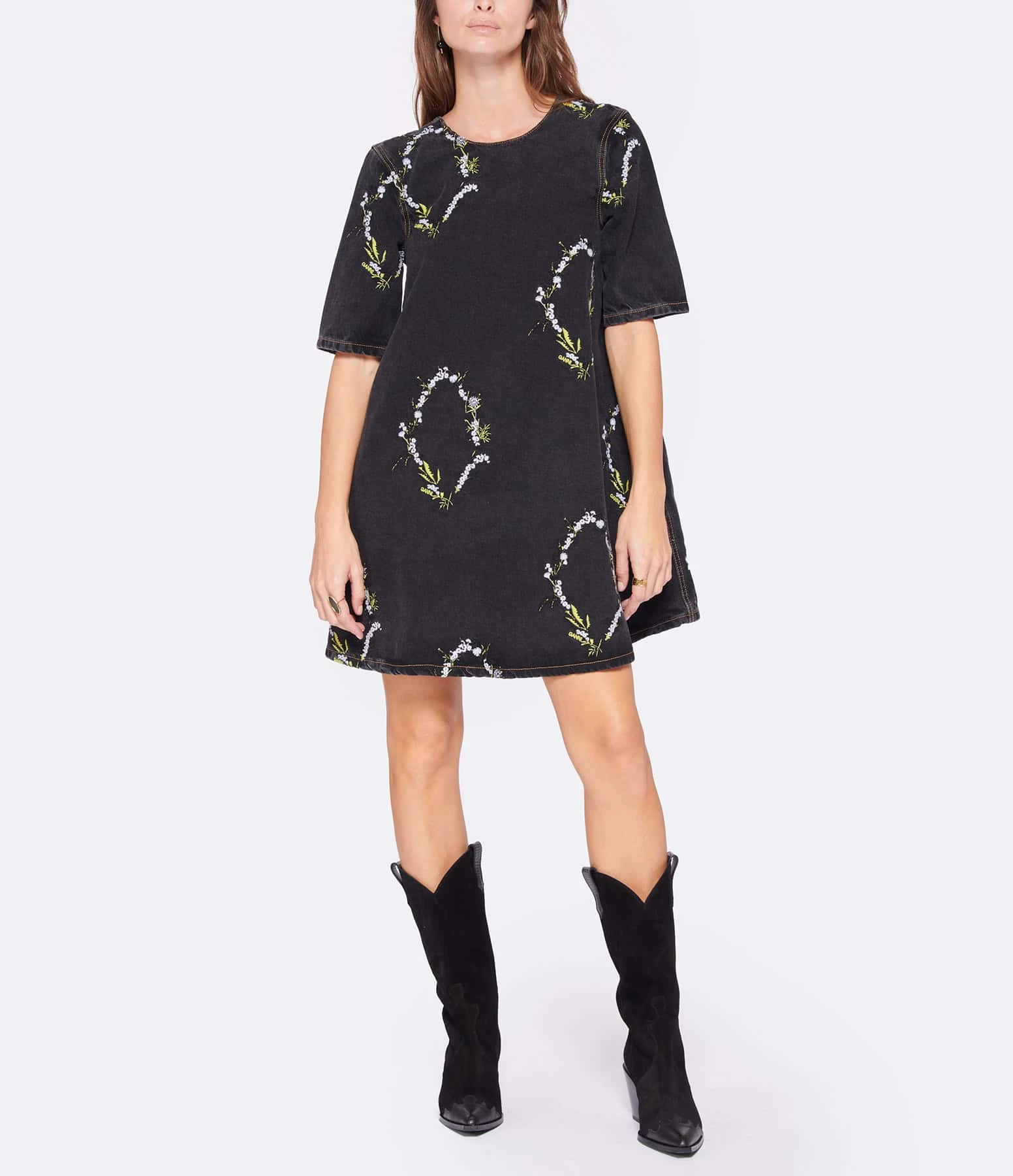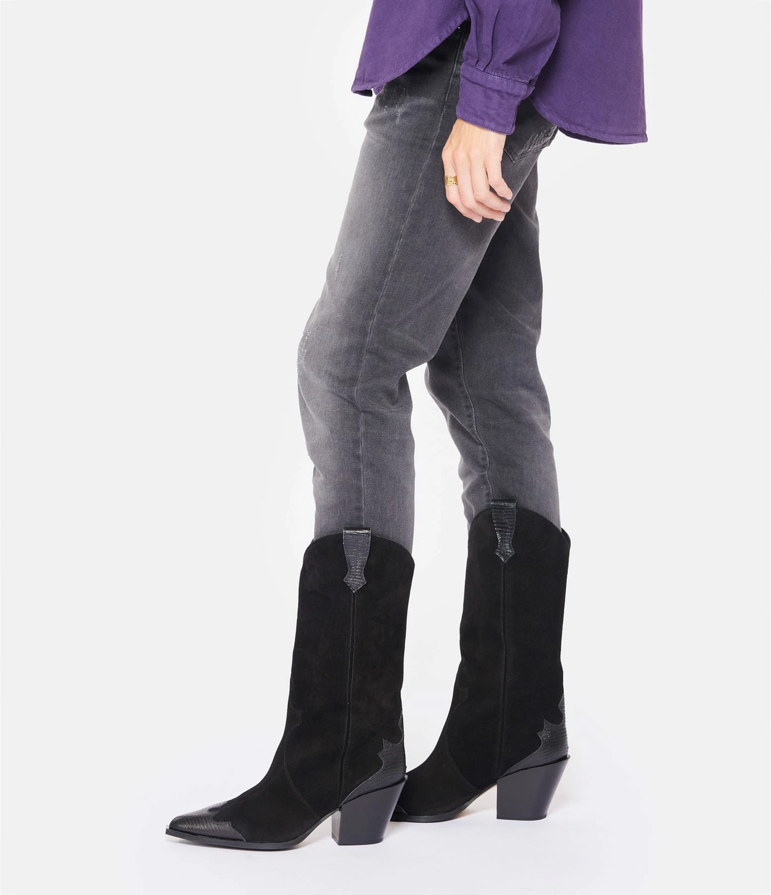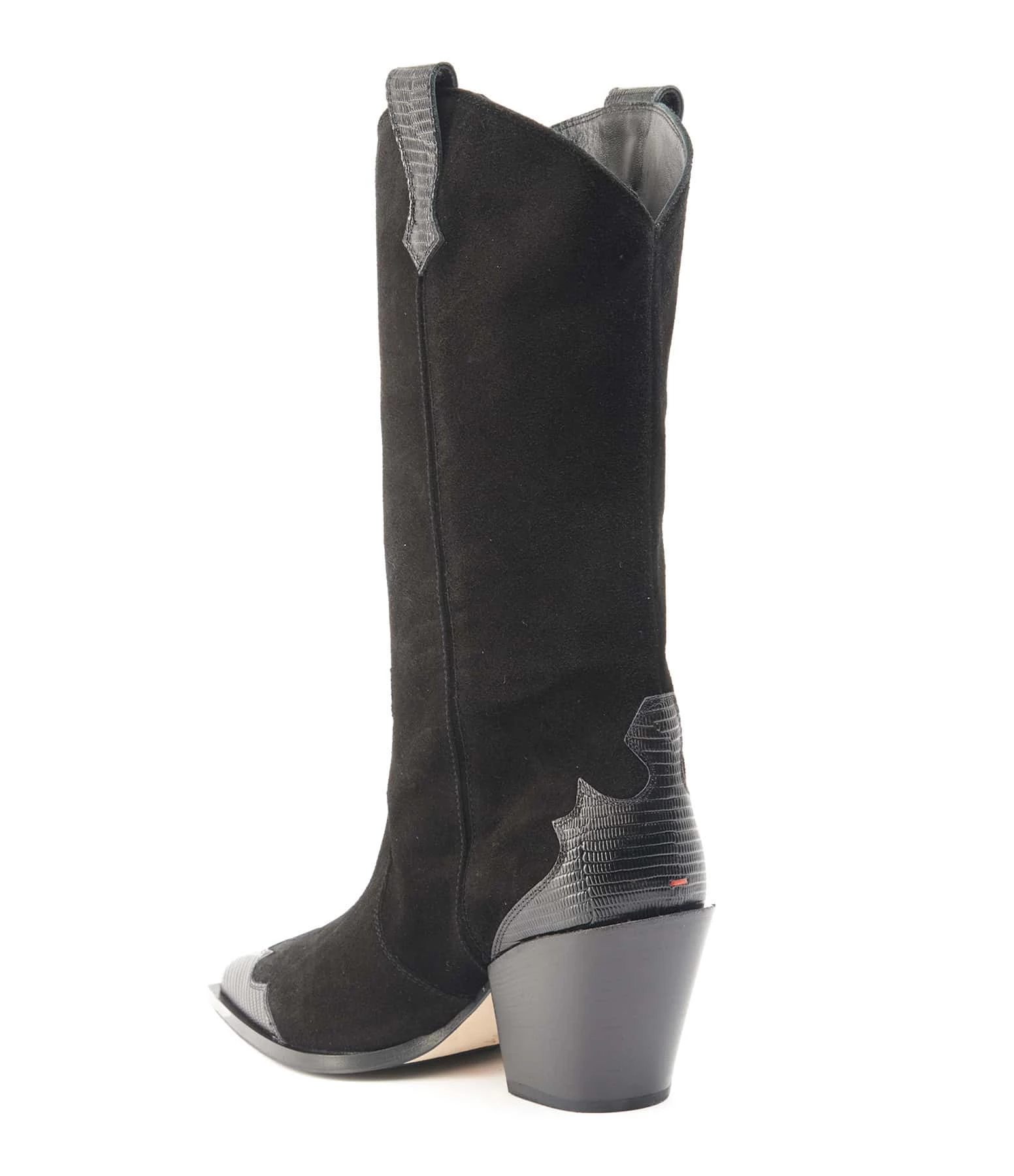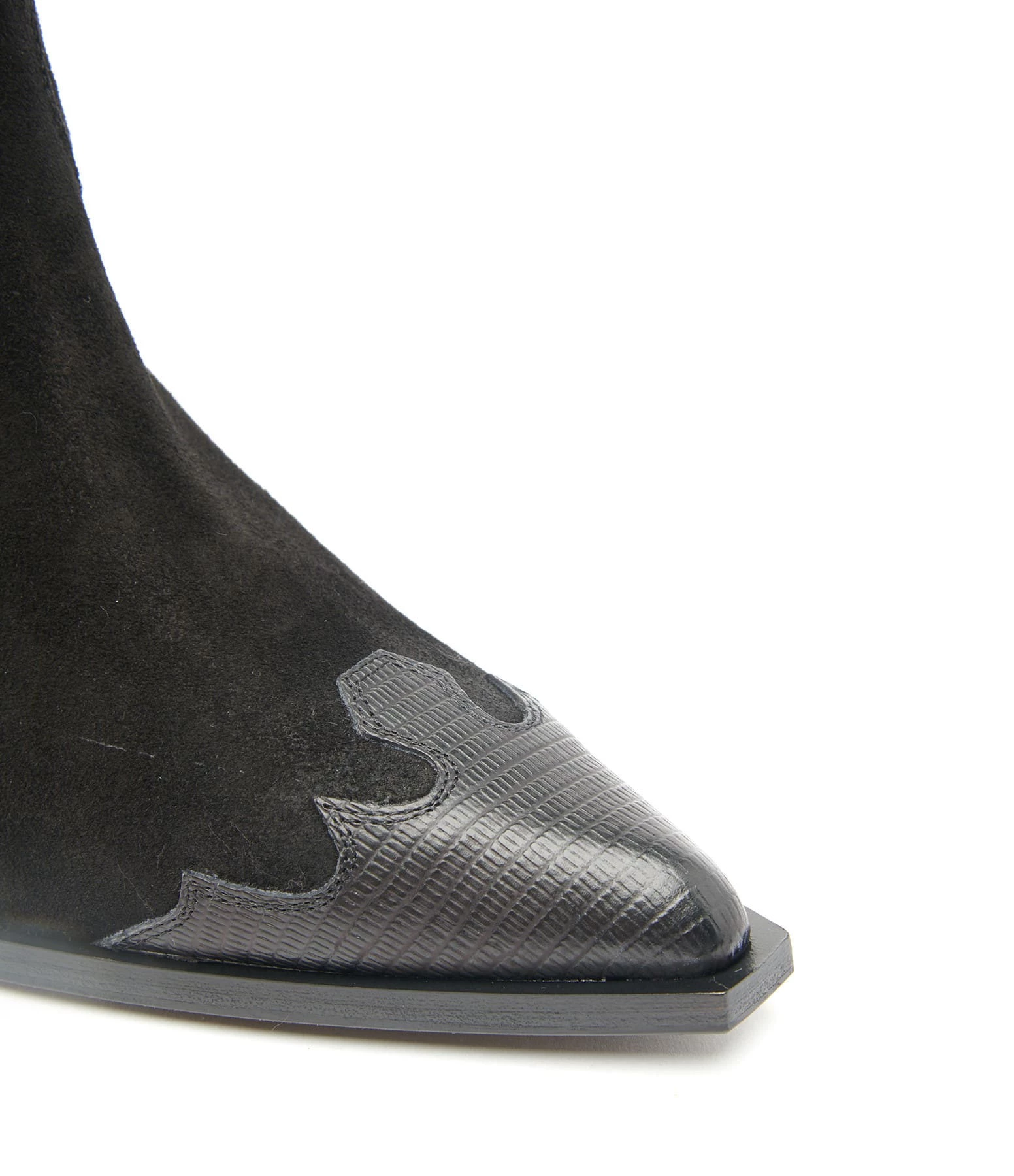 Bottines santiag à talon en cuir suédé noir. Talons blocs. Boucles latérales. Languettes latérales et empiècements sur le contrefort et la pointe en cuir imprimé lézard. Bouts pointus.