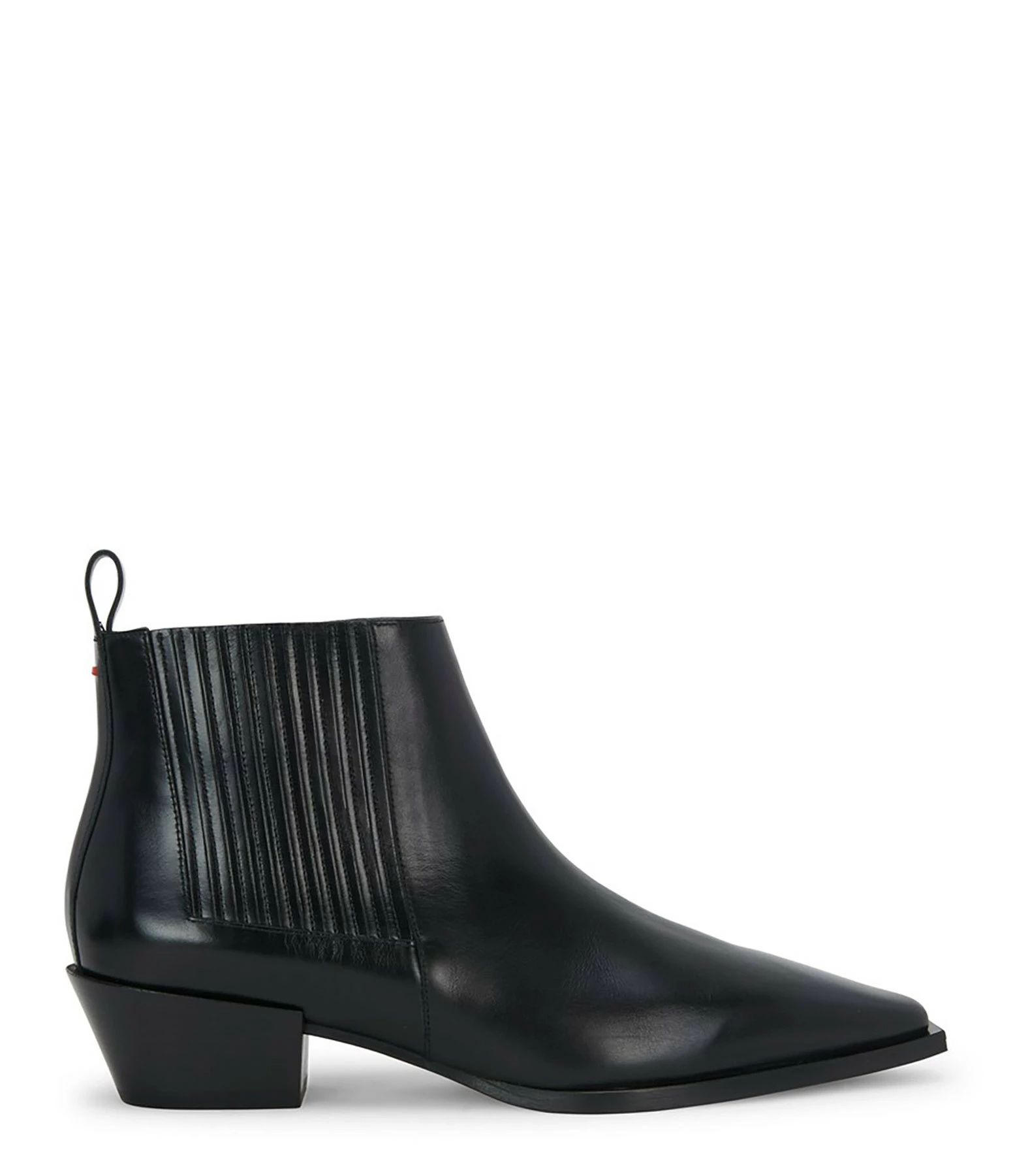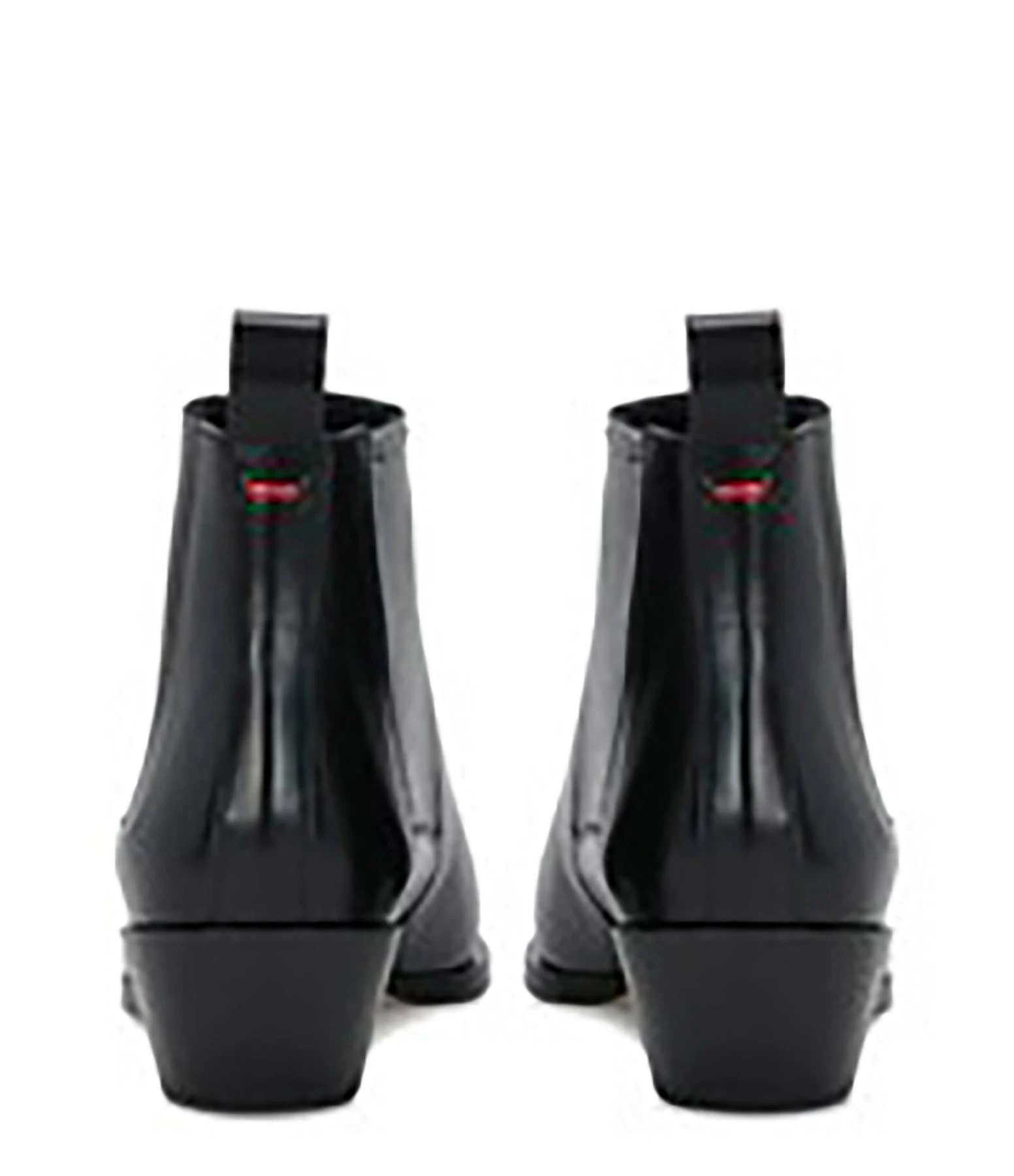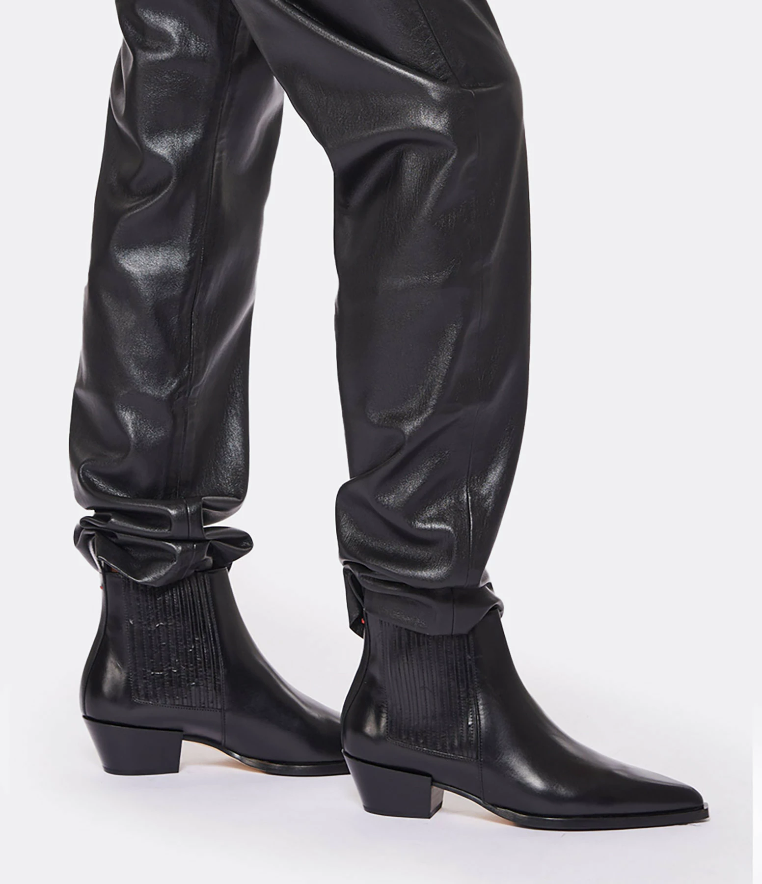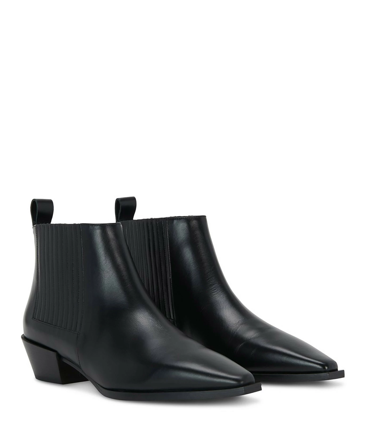Bottines en cuir lisse noir. Bout pointu. Côtés élastiqués. Passant en cuir à l’arrière. Talon bloc.