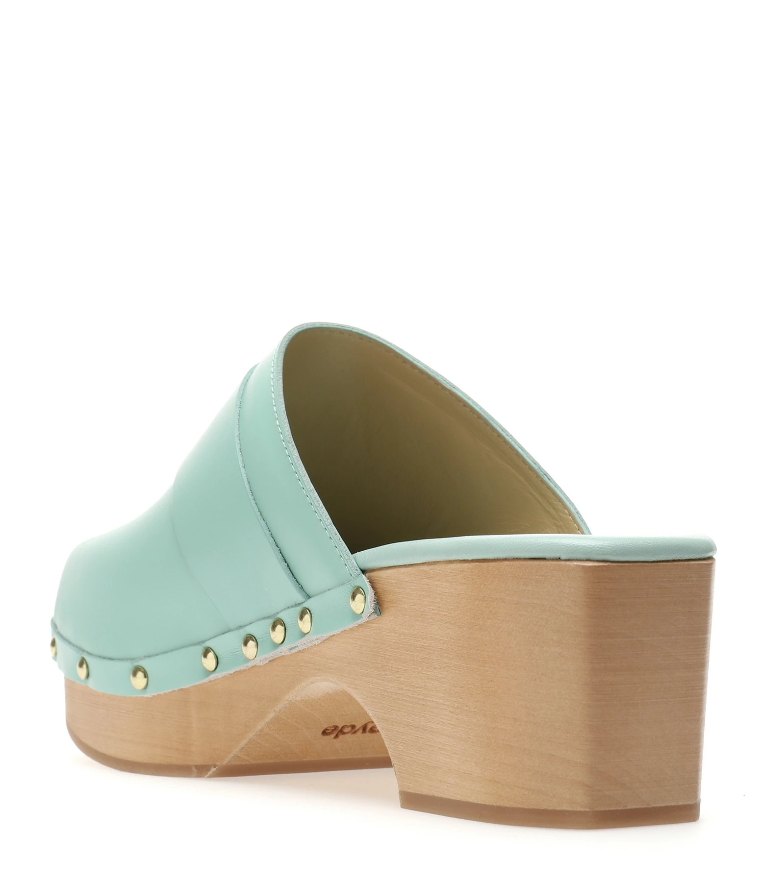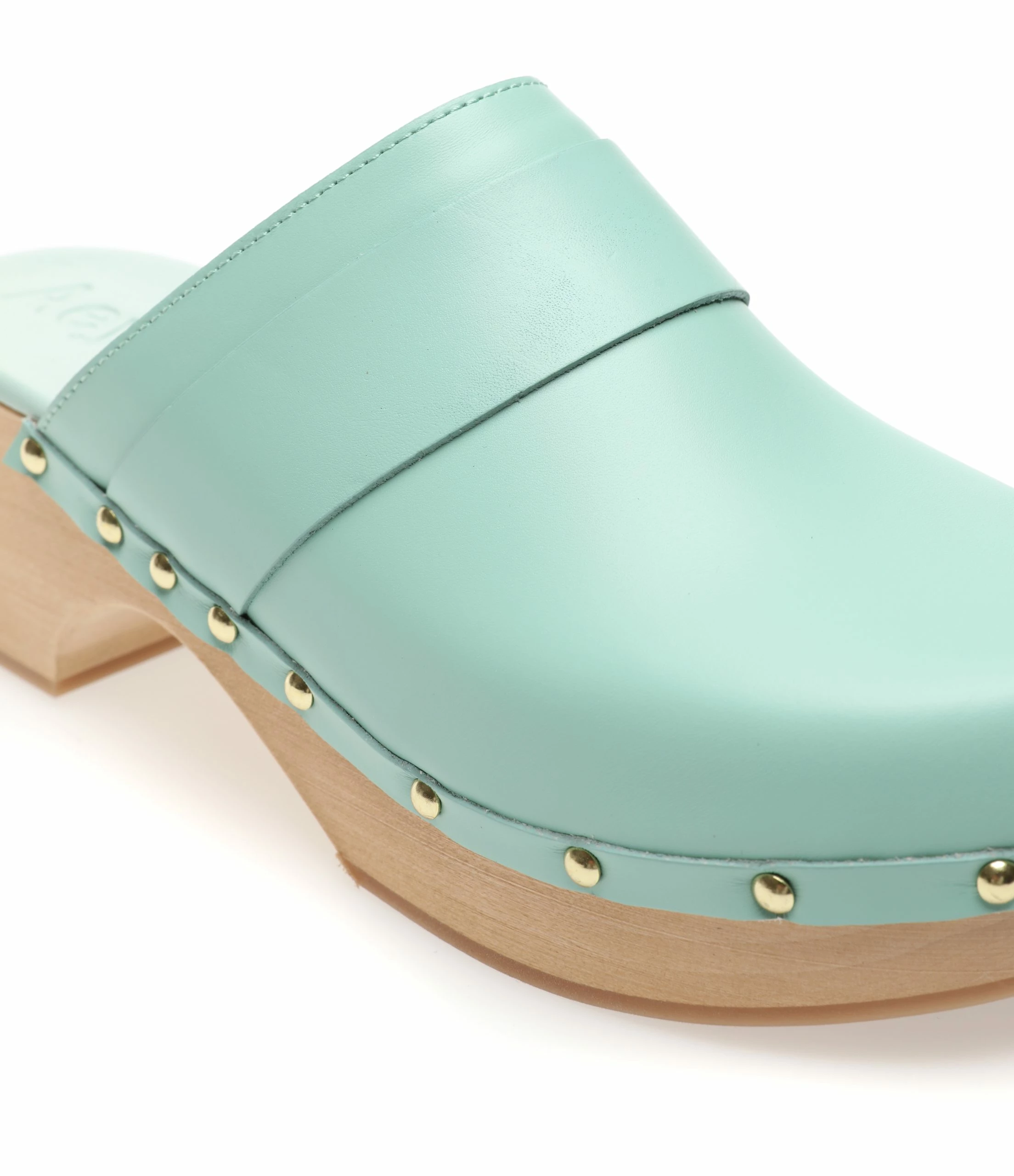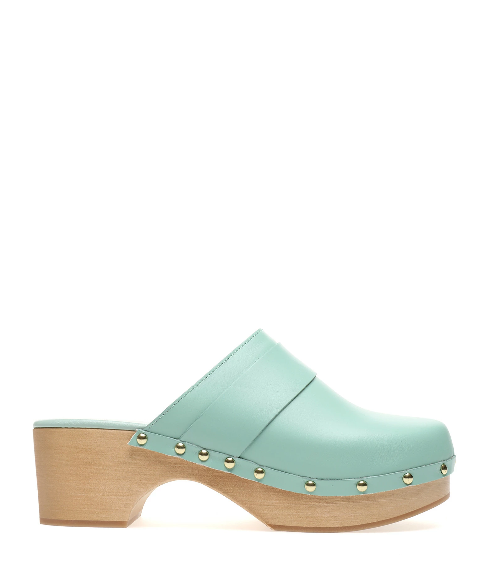 Sabots en cuir turquoise. Clous dorés sur les côtés.