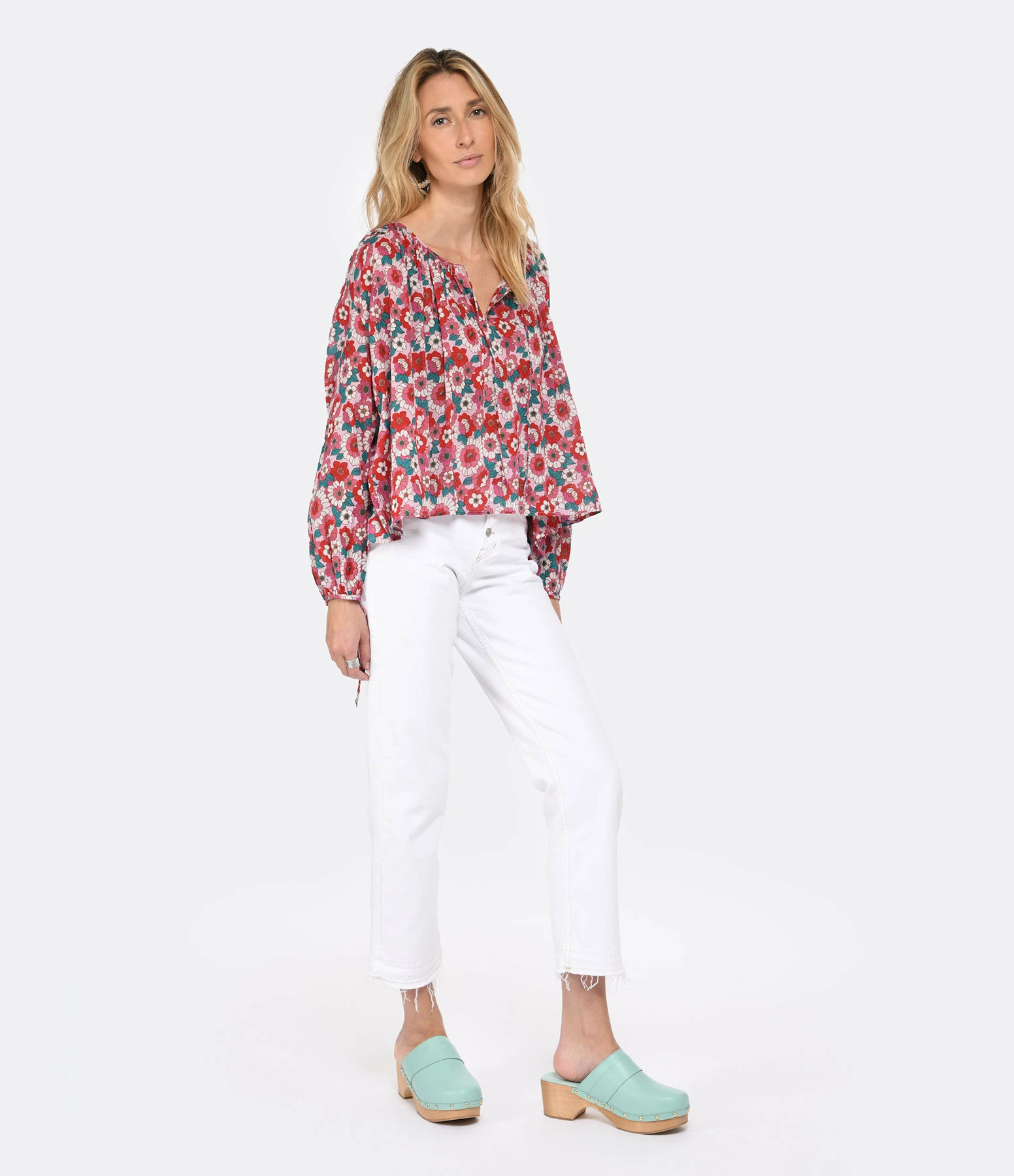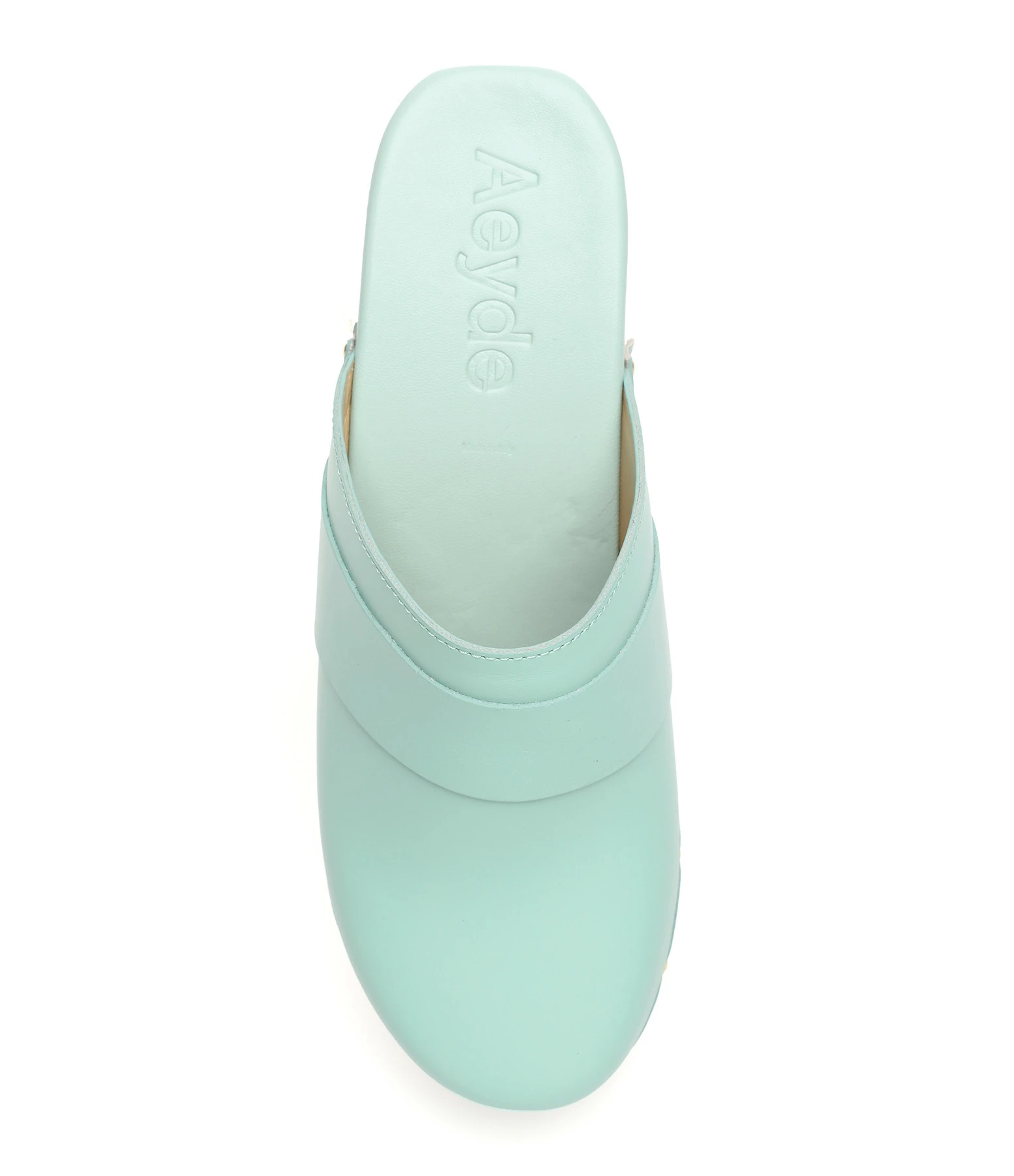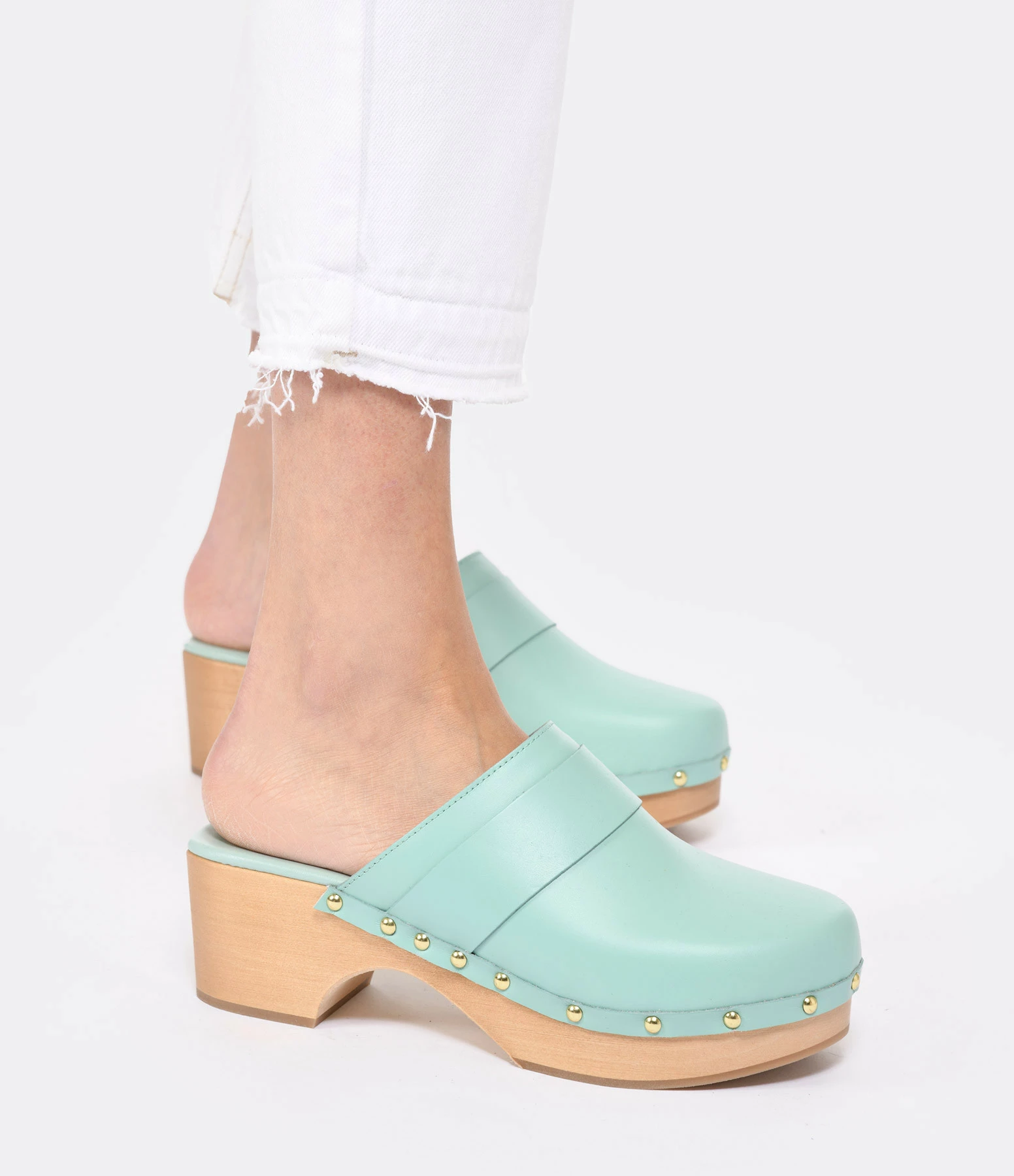 Sabots en cuir turquoise. Clous dorés sur les côtés.