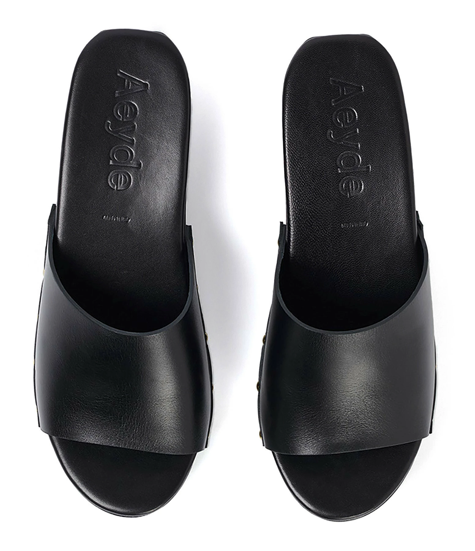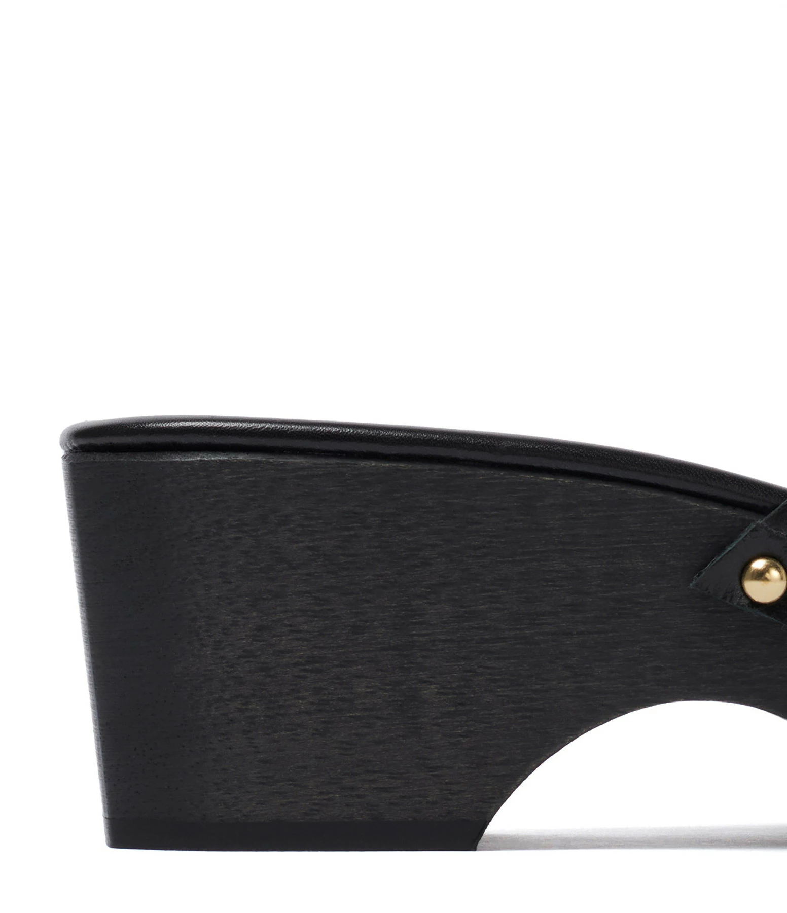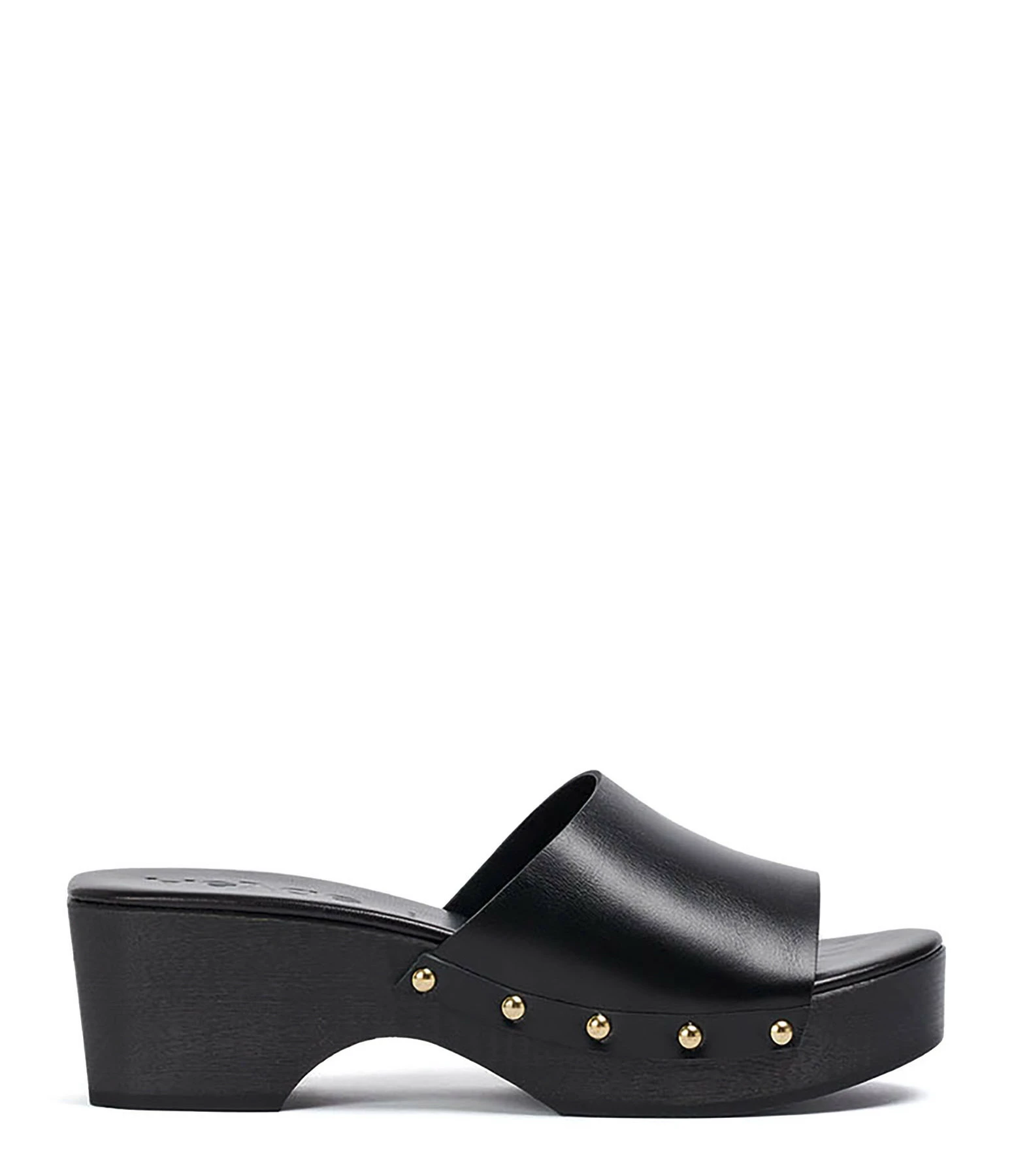 Sabots en cuir noir ouvert sur le devant. Clous dorés sur les côtés.