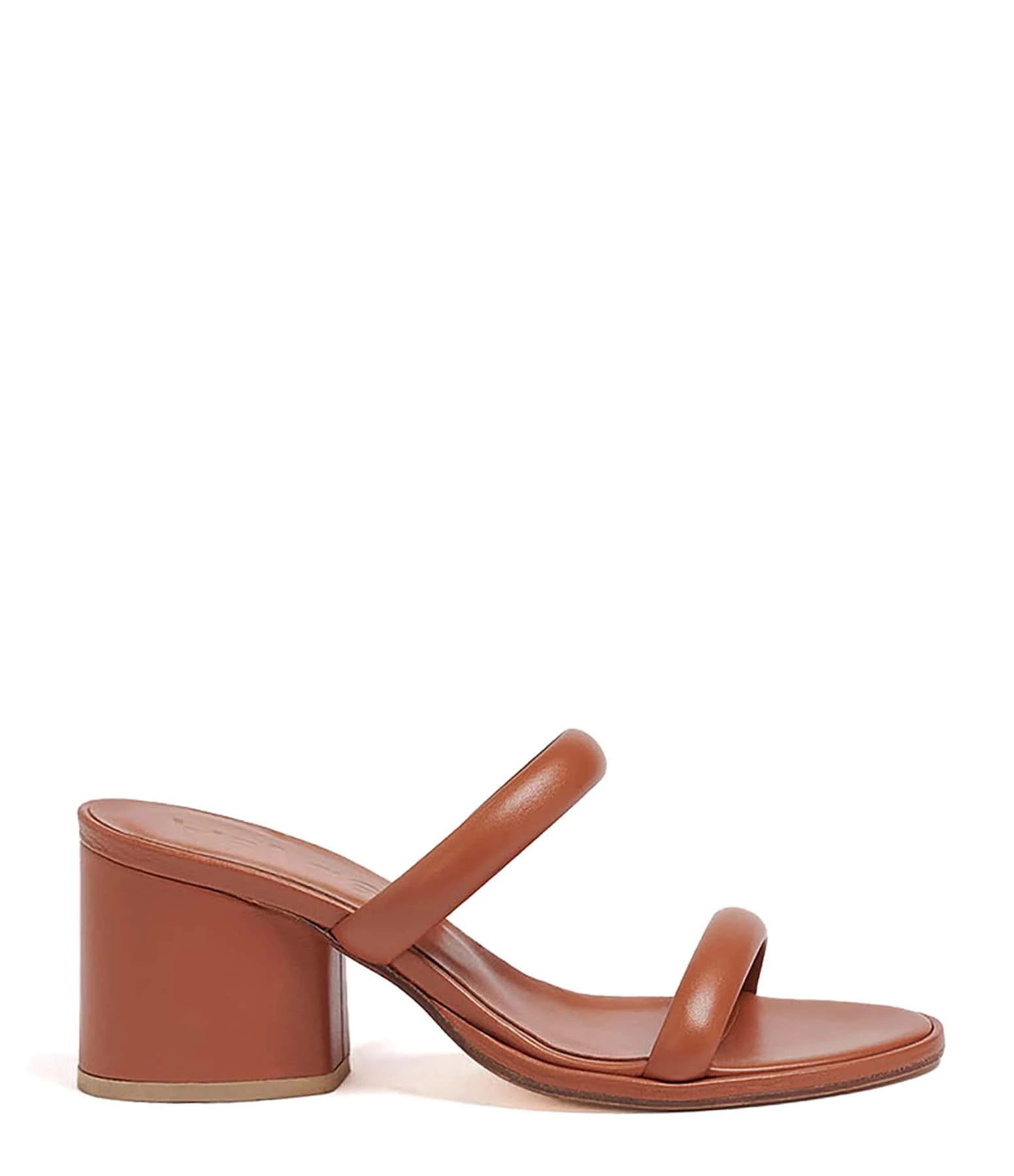 Sandales à talons en cuir marron. Deux brides sur le dessus.