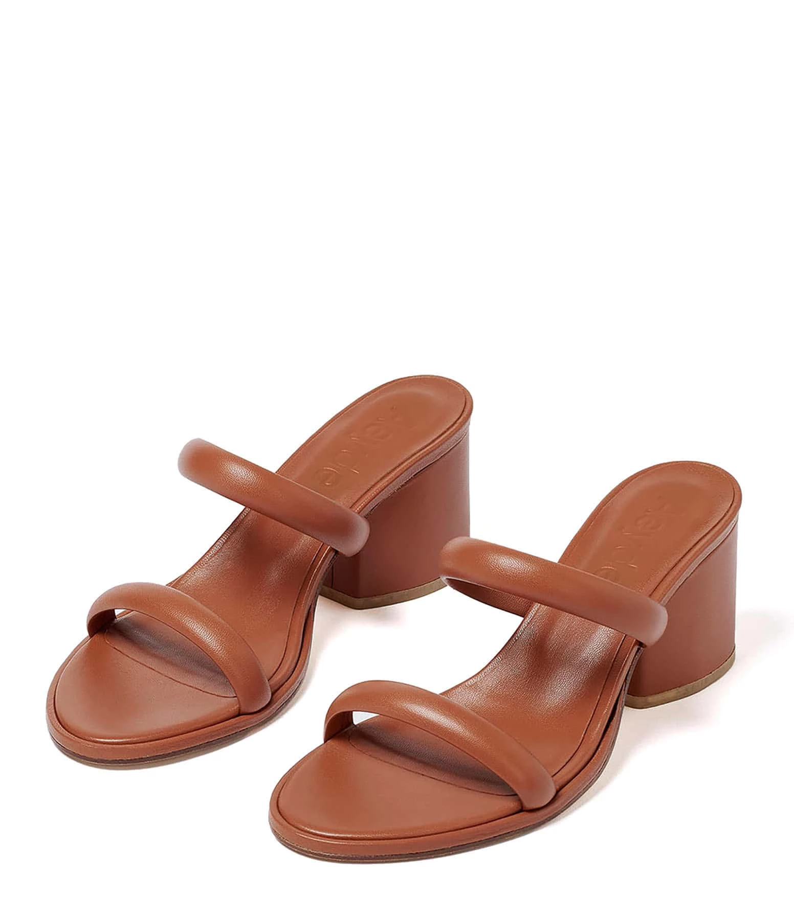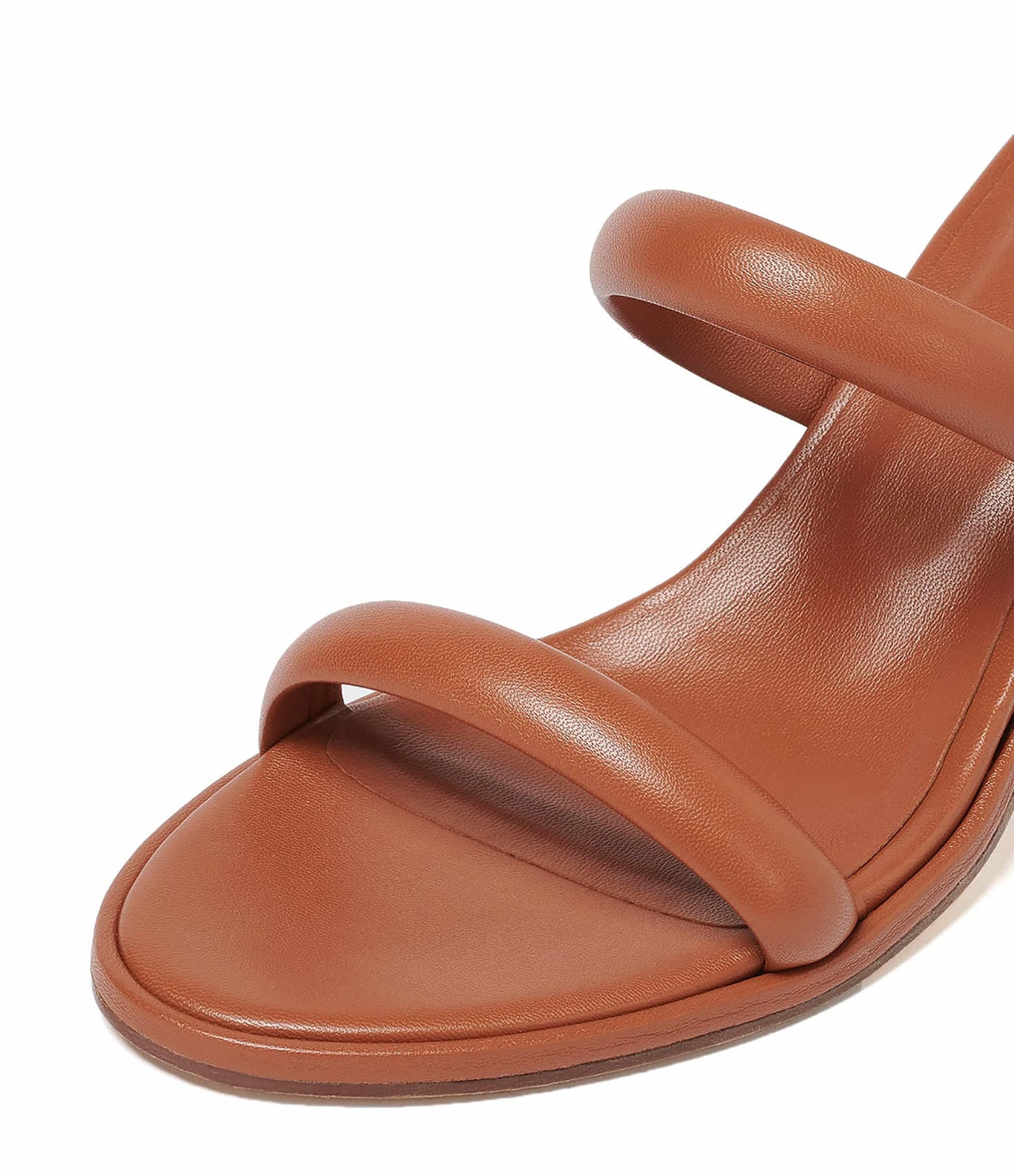 Sandales à talons en cuir marron. Deux brides sur le dessus.