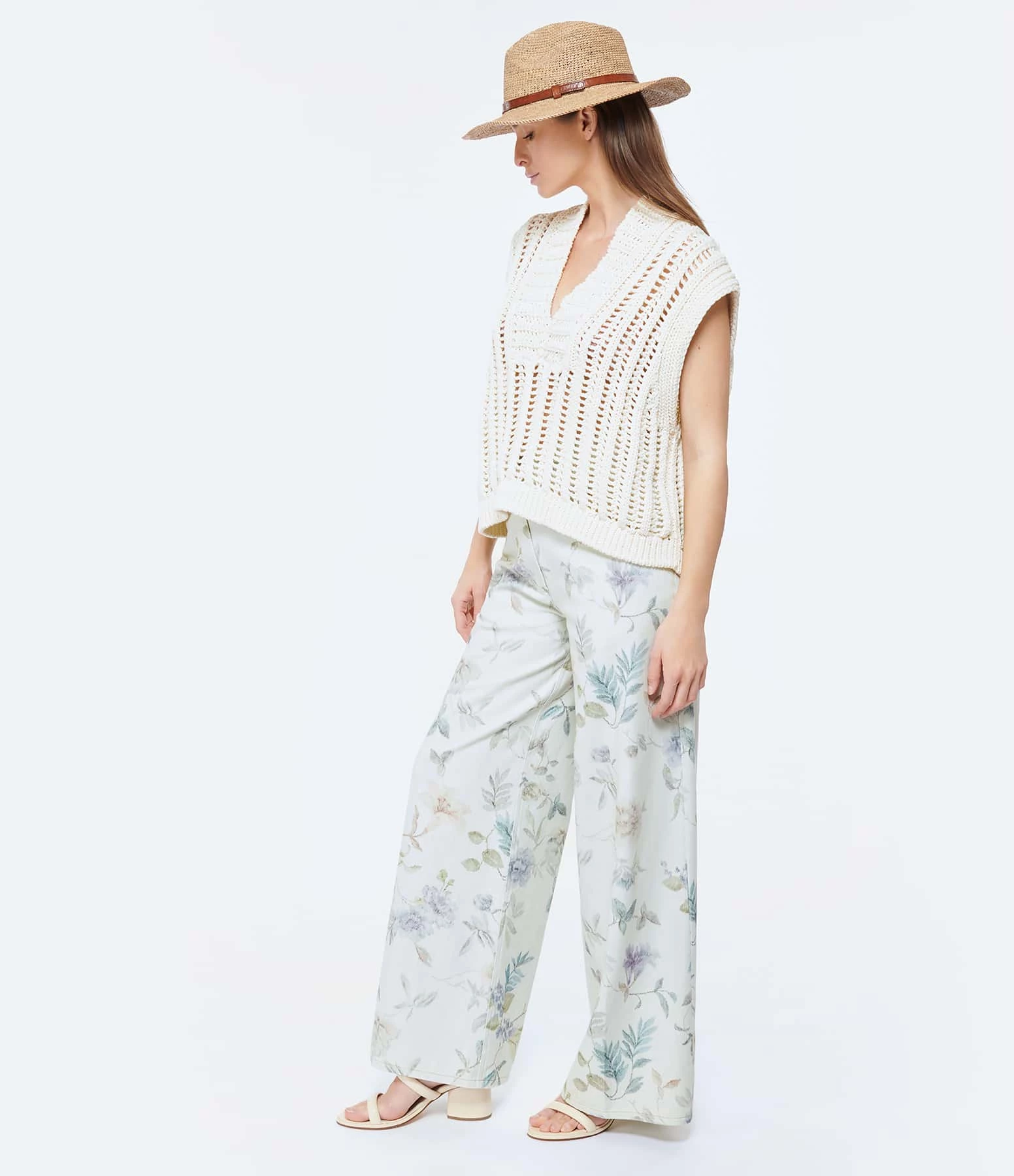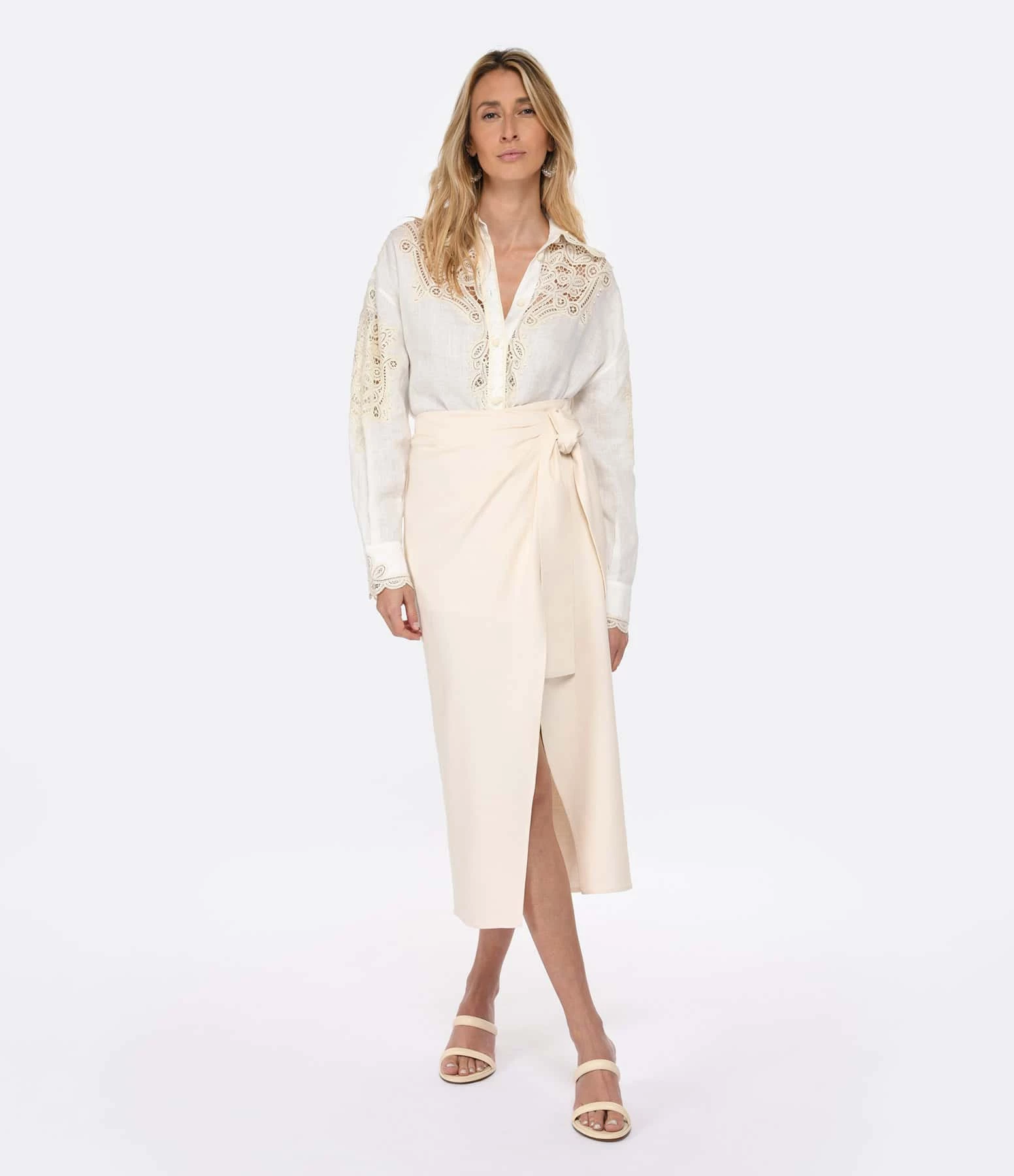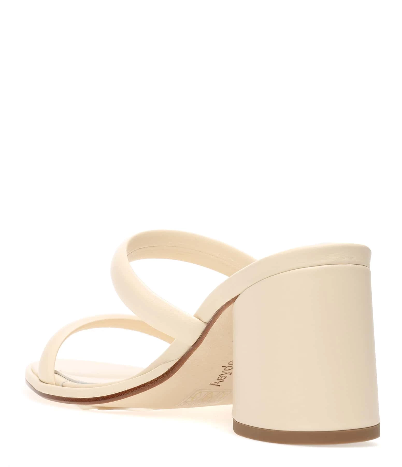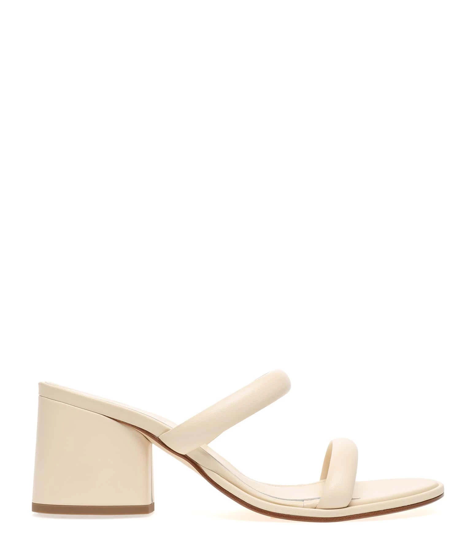 Sandales à talons en cuir crème. Deux brides sur le dessus.