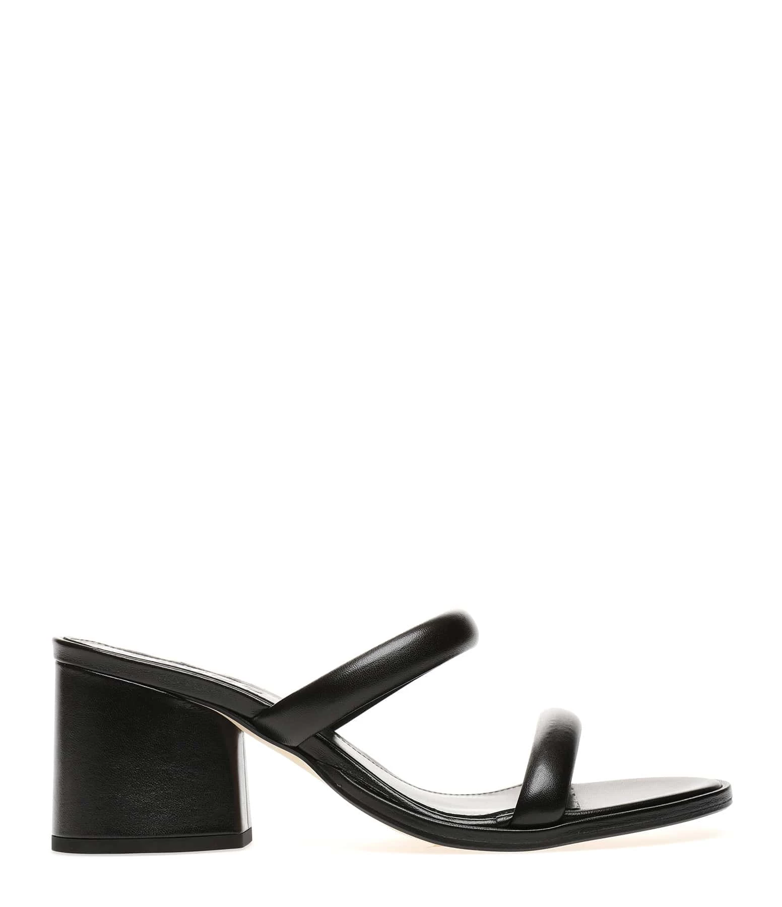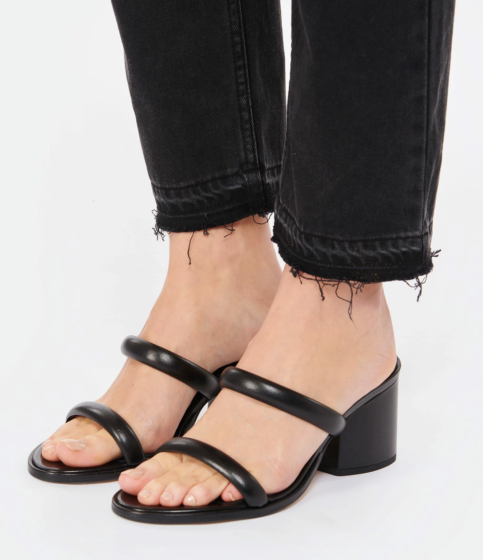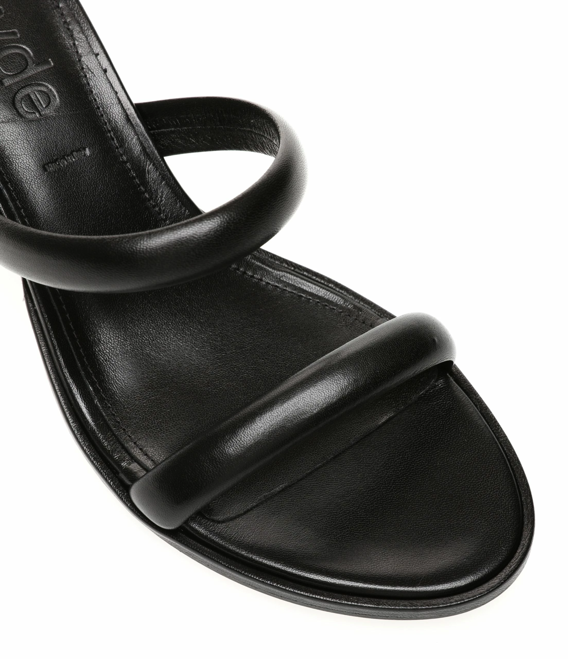 Sandales à talons en cuir noir. Deux brides sur le dessus.