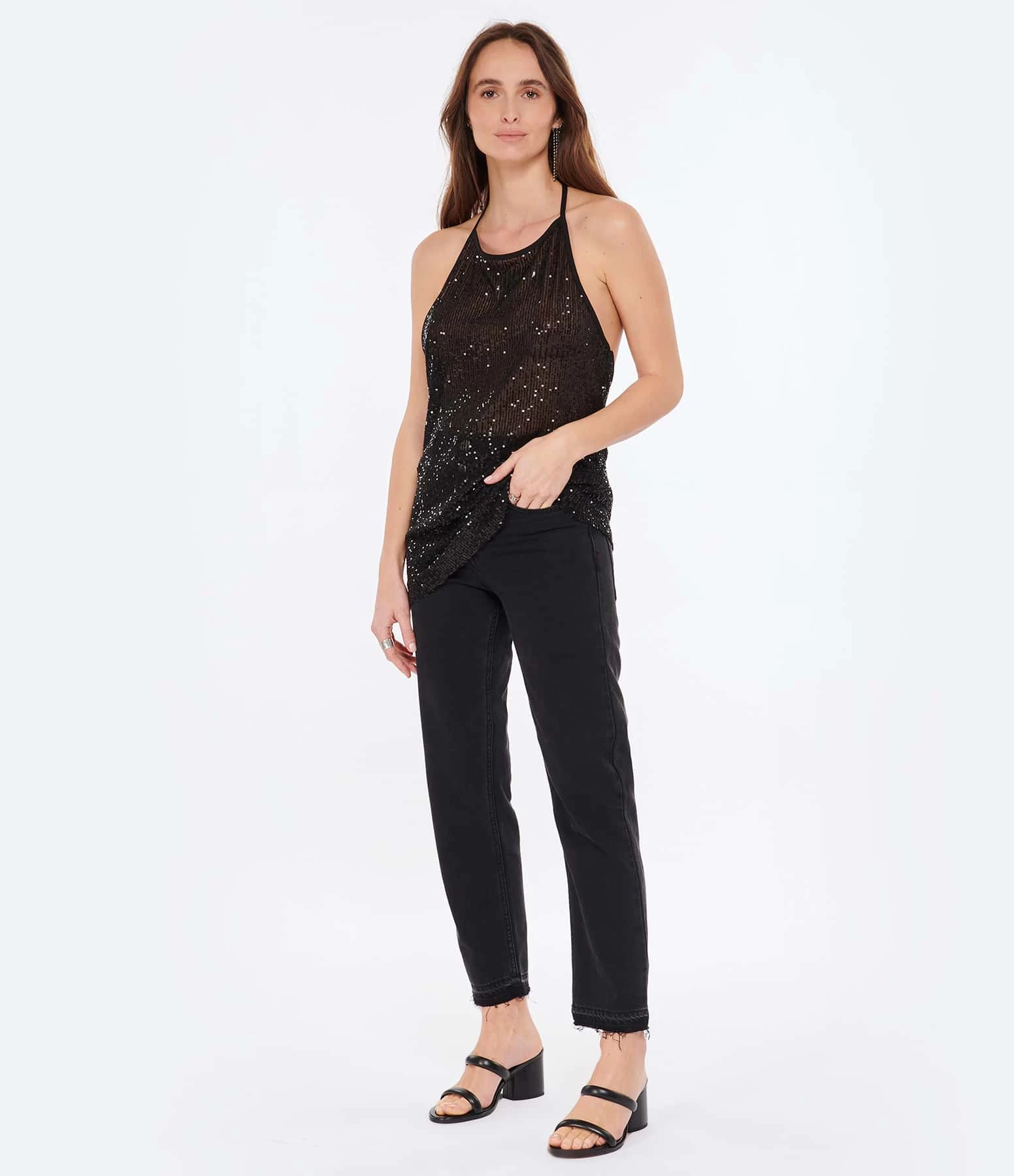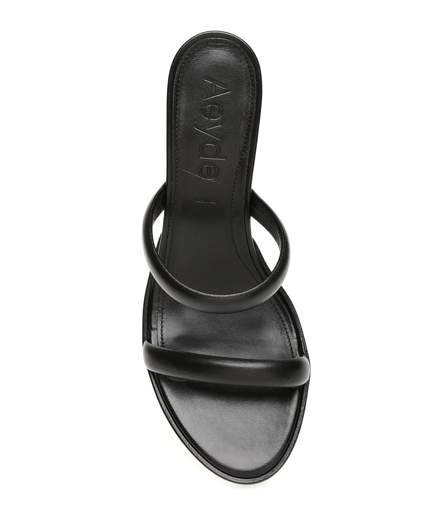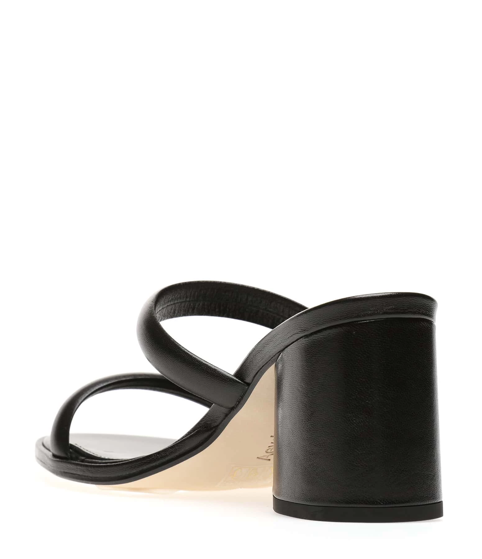 Sandales à talons en cuir noir. Deux brides sur le dessus.