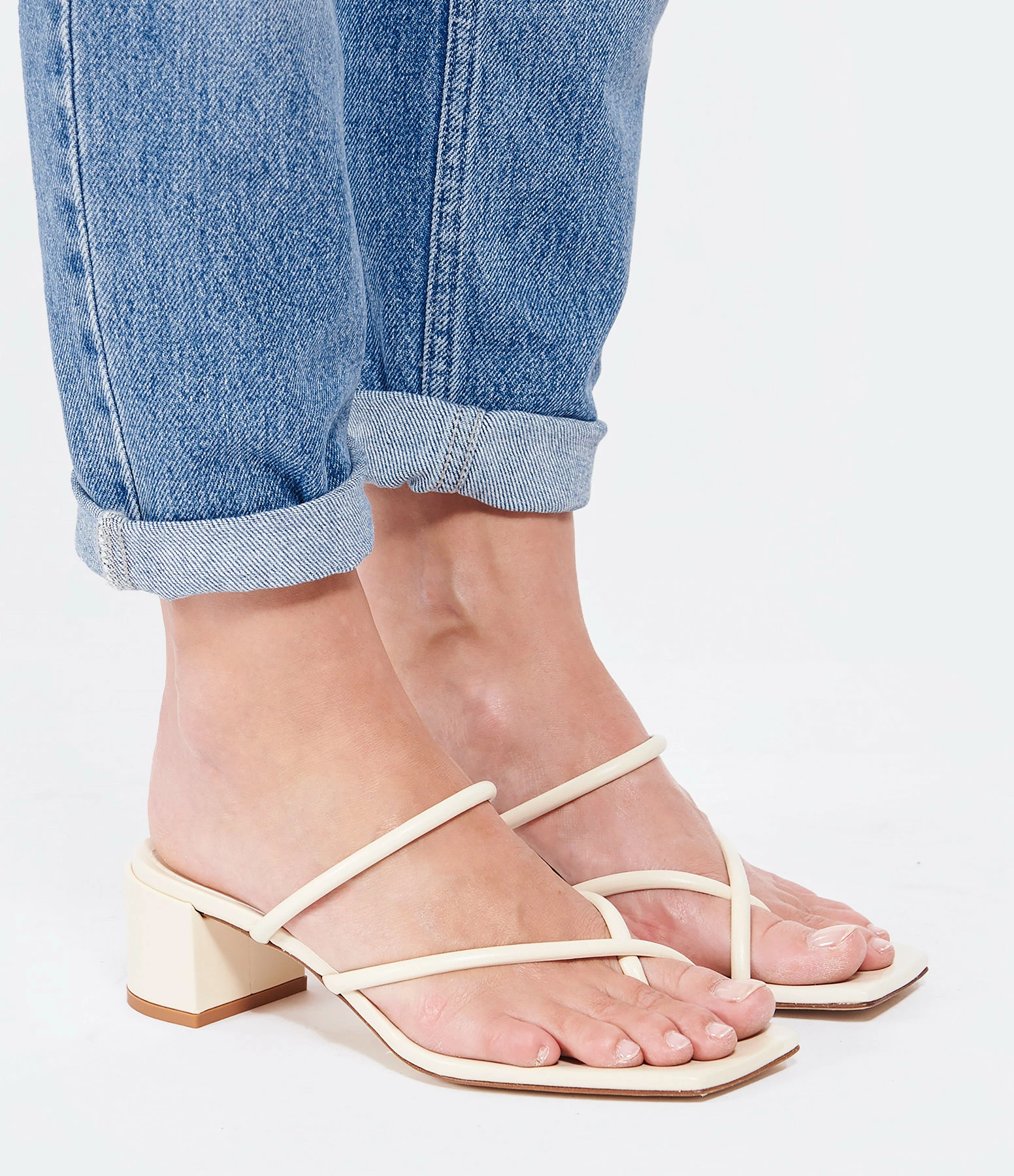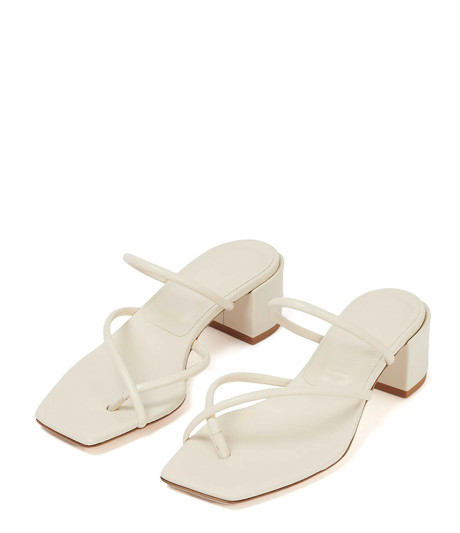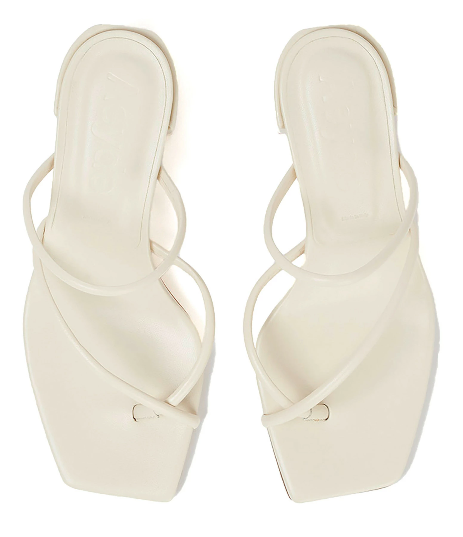 Sandales à talons en cuir écru. Deux brides croisées à l’avant et une bride à la cheville.