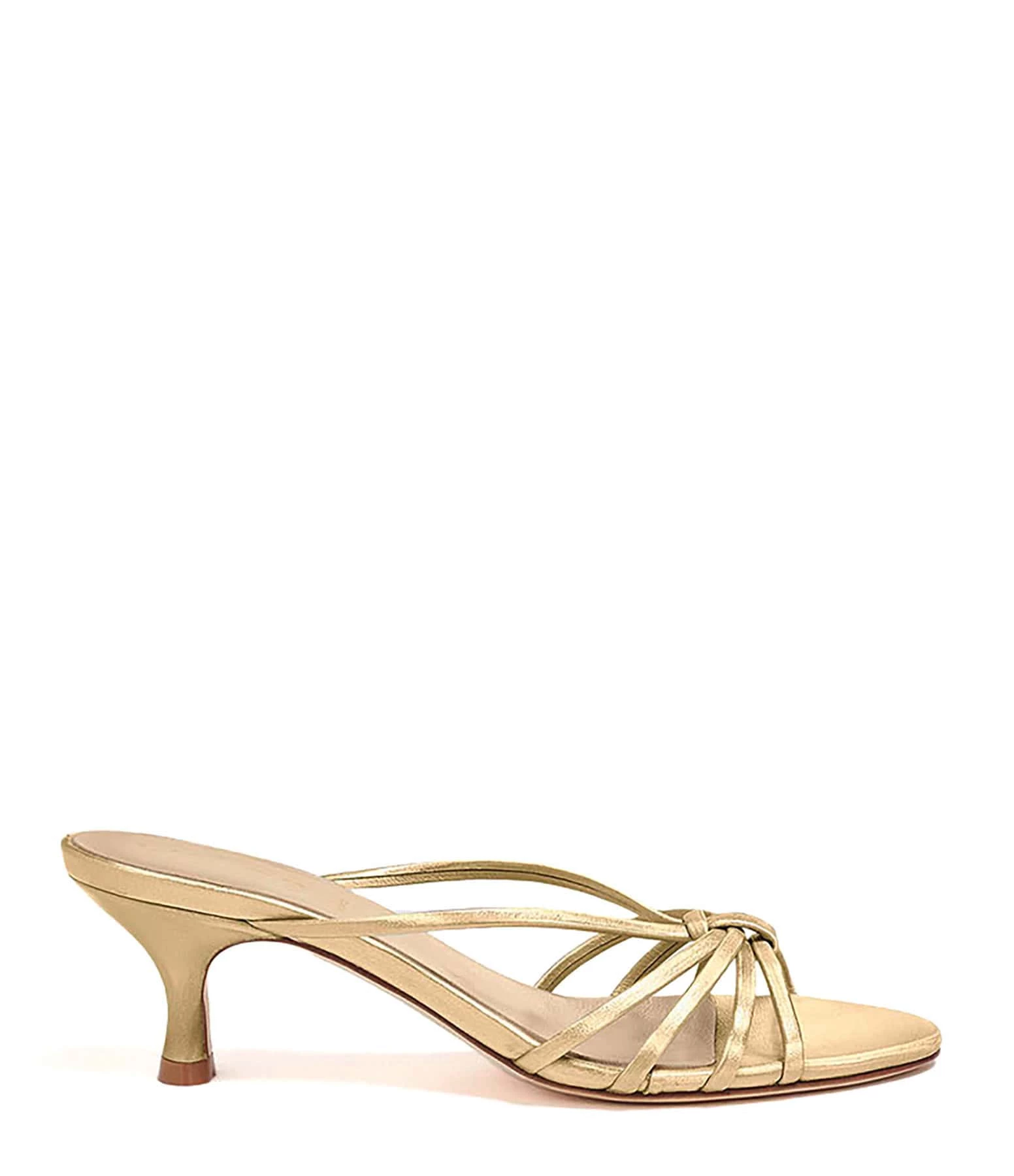 Sandales à talons en cuir doré. Multi brides croisées à l’avant.