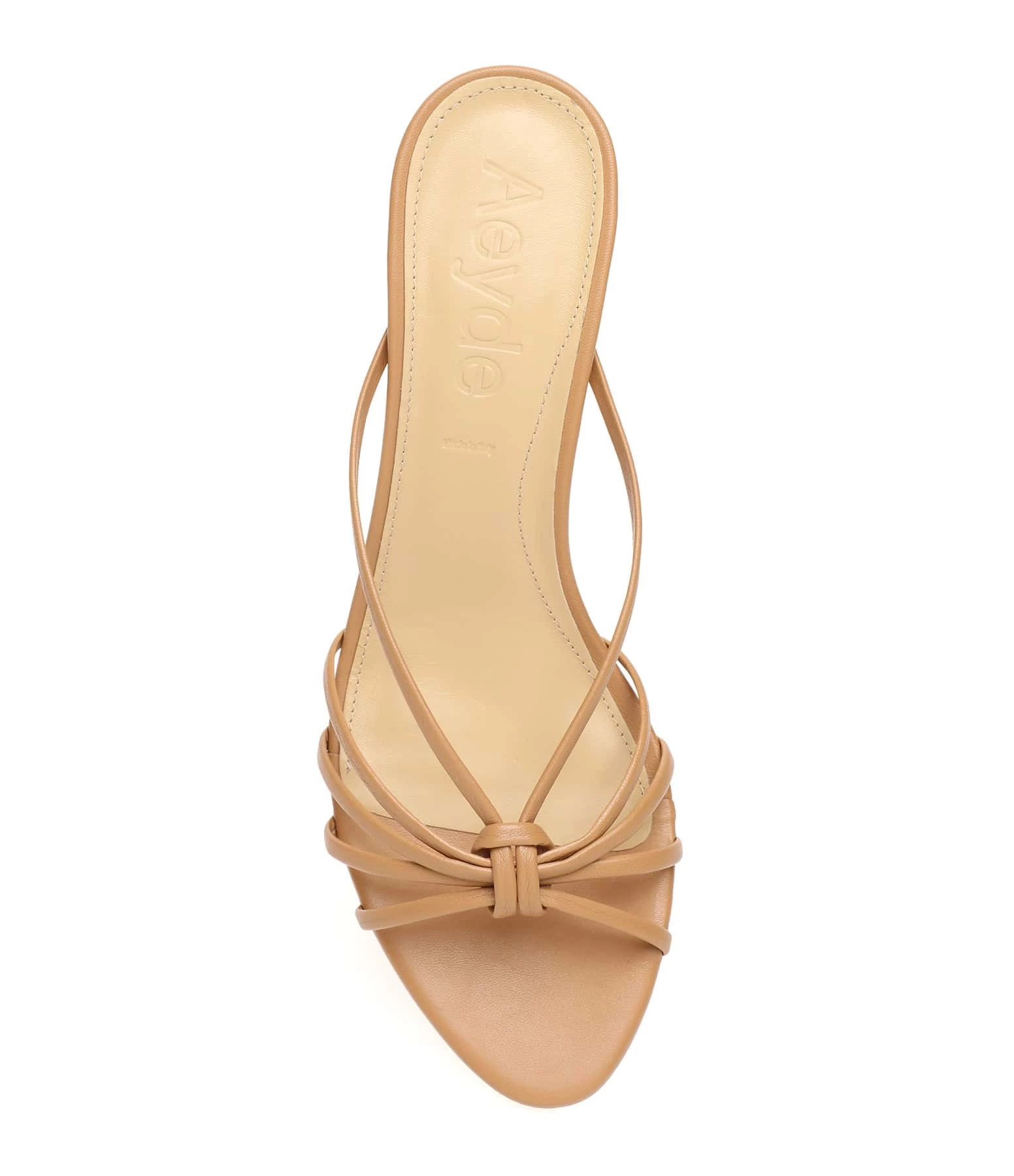 Sandales à talons en cuir marron clair. Multi brides croisées à l’avant.