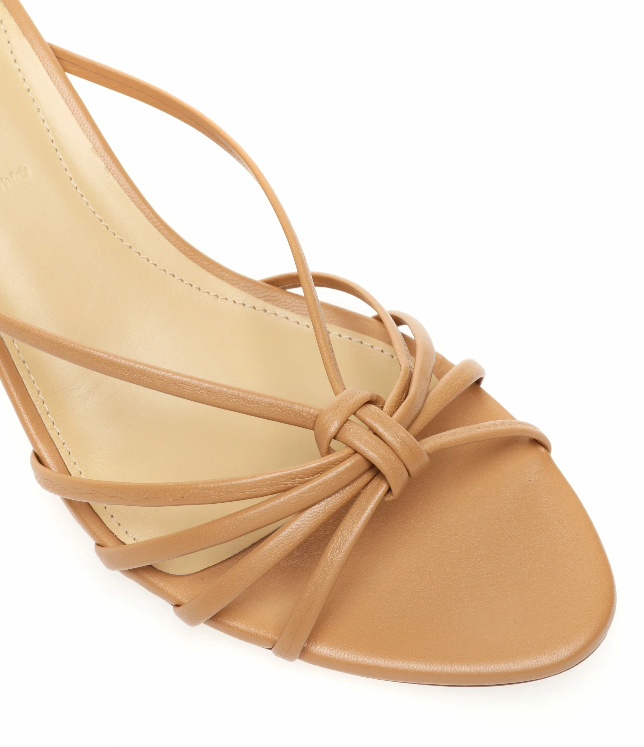 Sandales à talons en cuir marron clair. Multi brides croisées à l’avant.