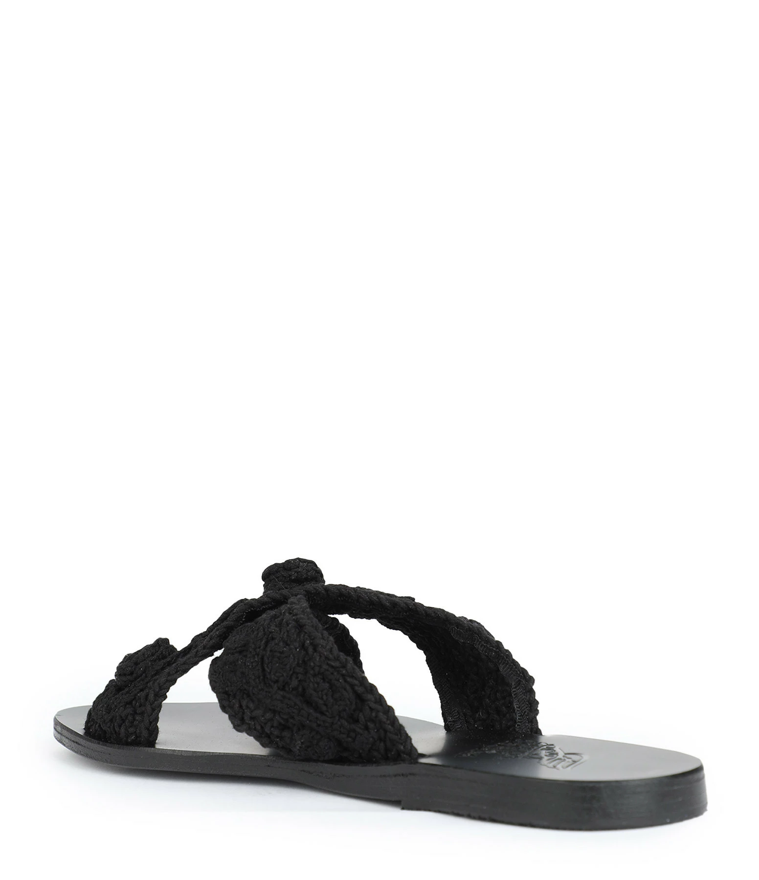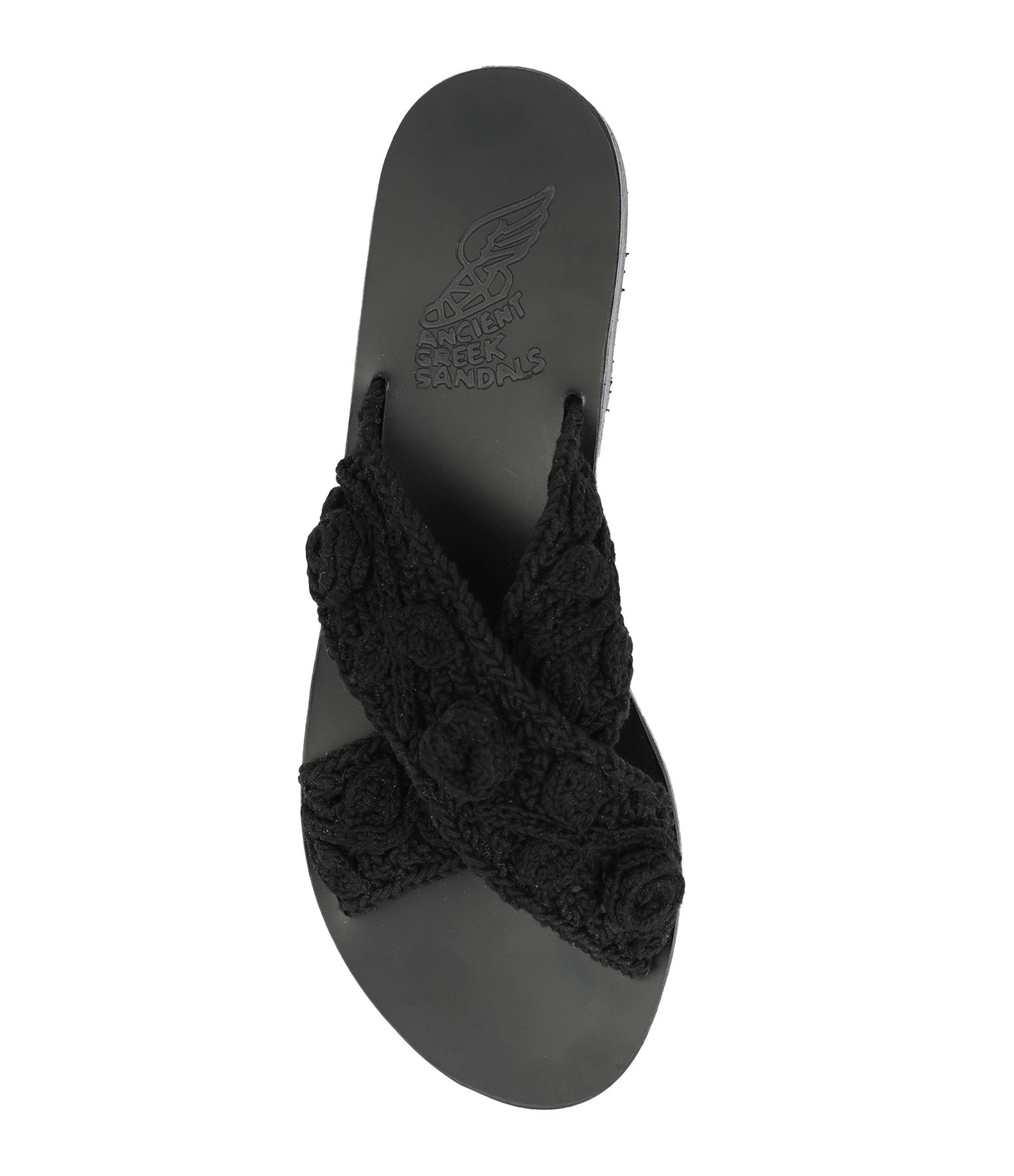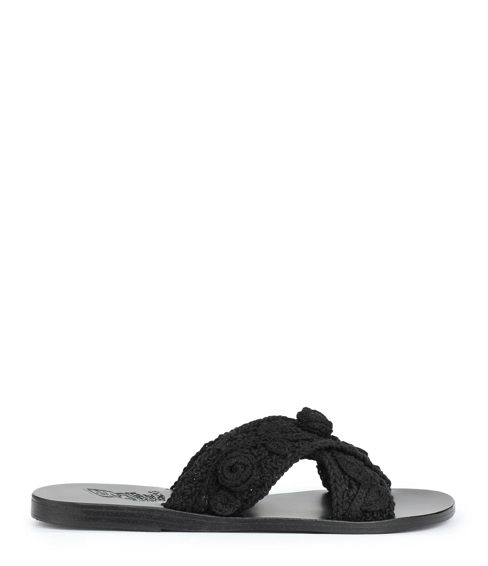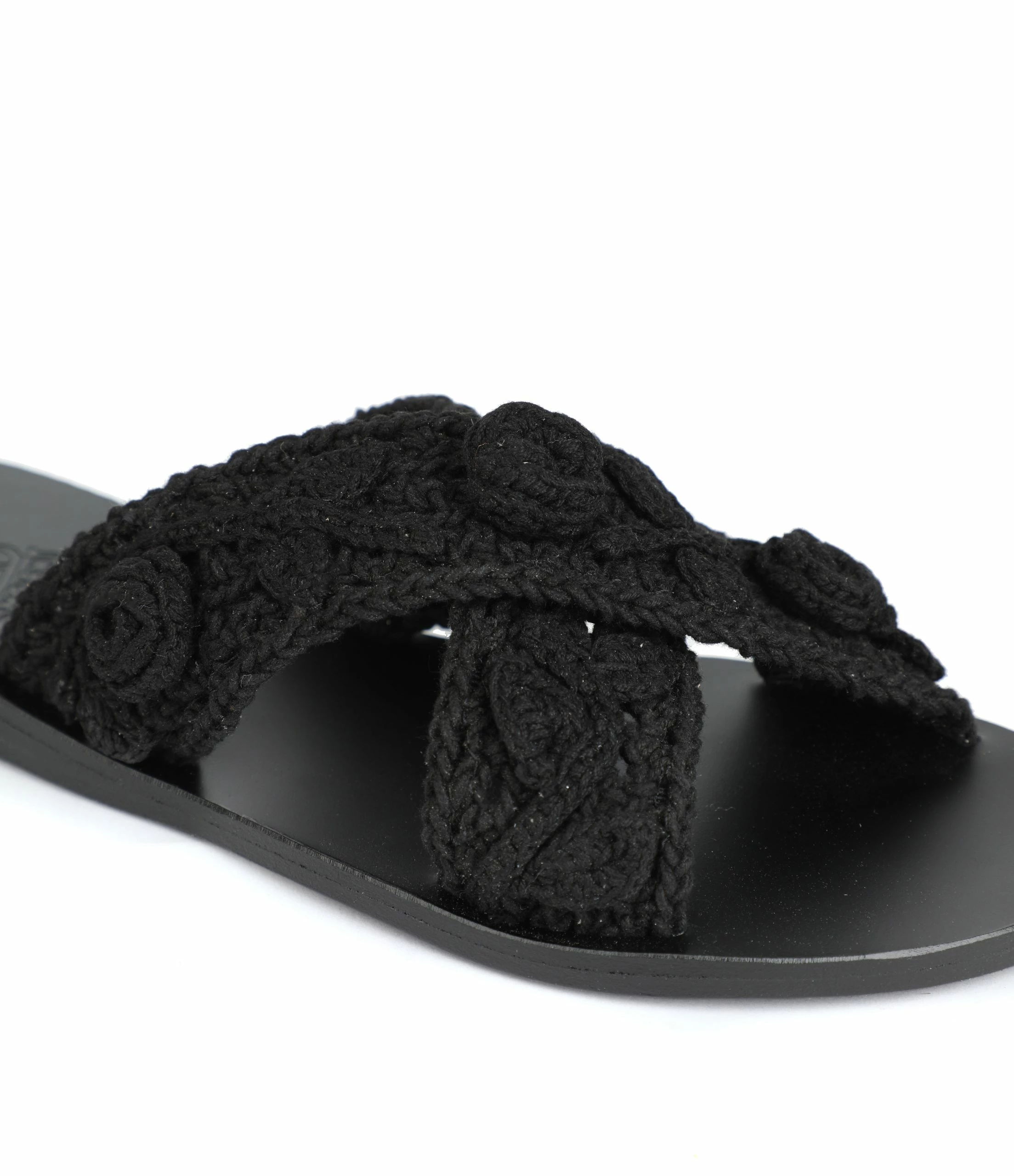 Mules en cuir végétal noir. Deux brides en dentelle noire croisées sur le dessus du pied.