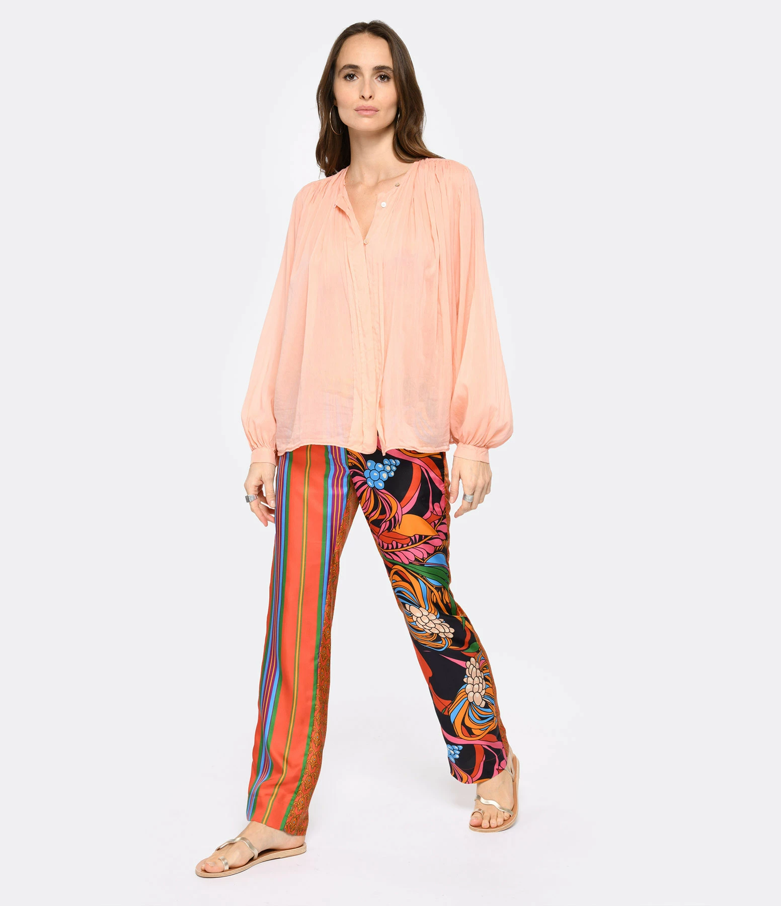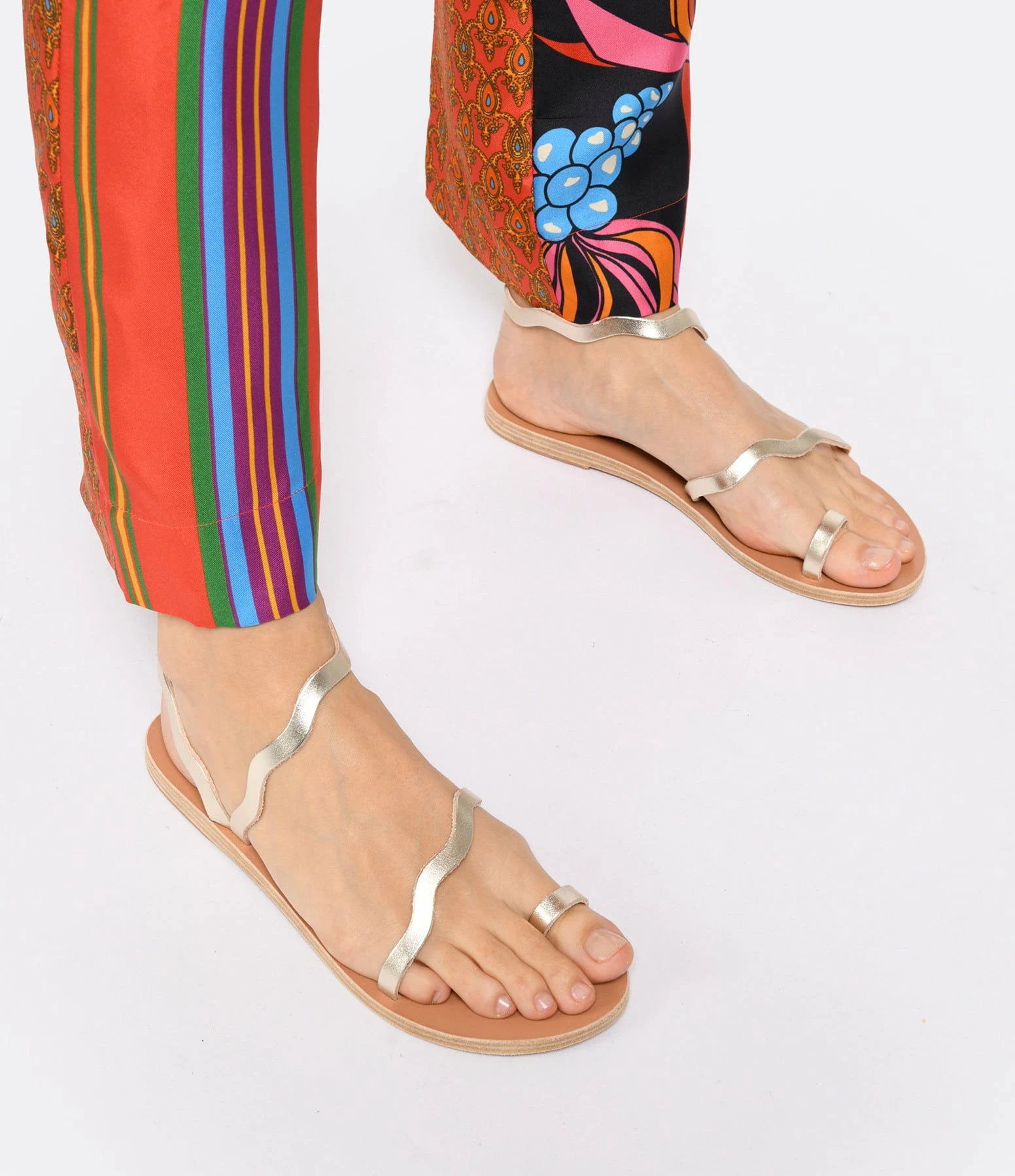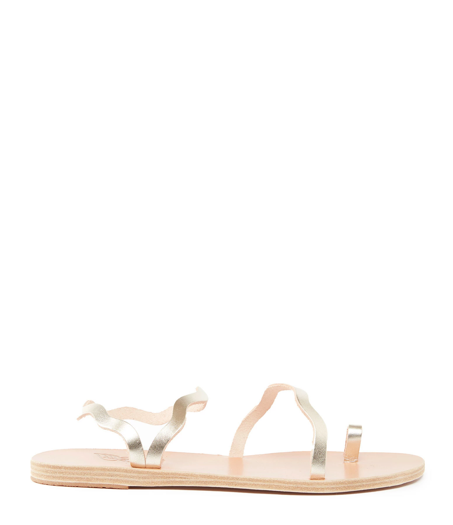Sandales en cuir doré. Une bride à l’entre-doigt, une sur le dessus du pied et une bride autour de la cheville. Les brides ne sont pas réglables.