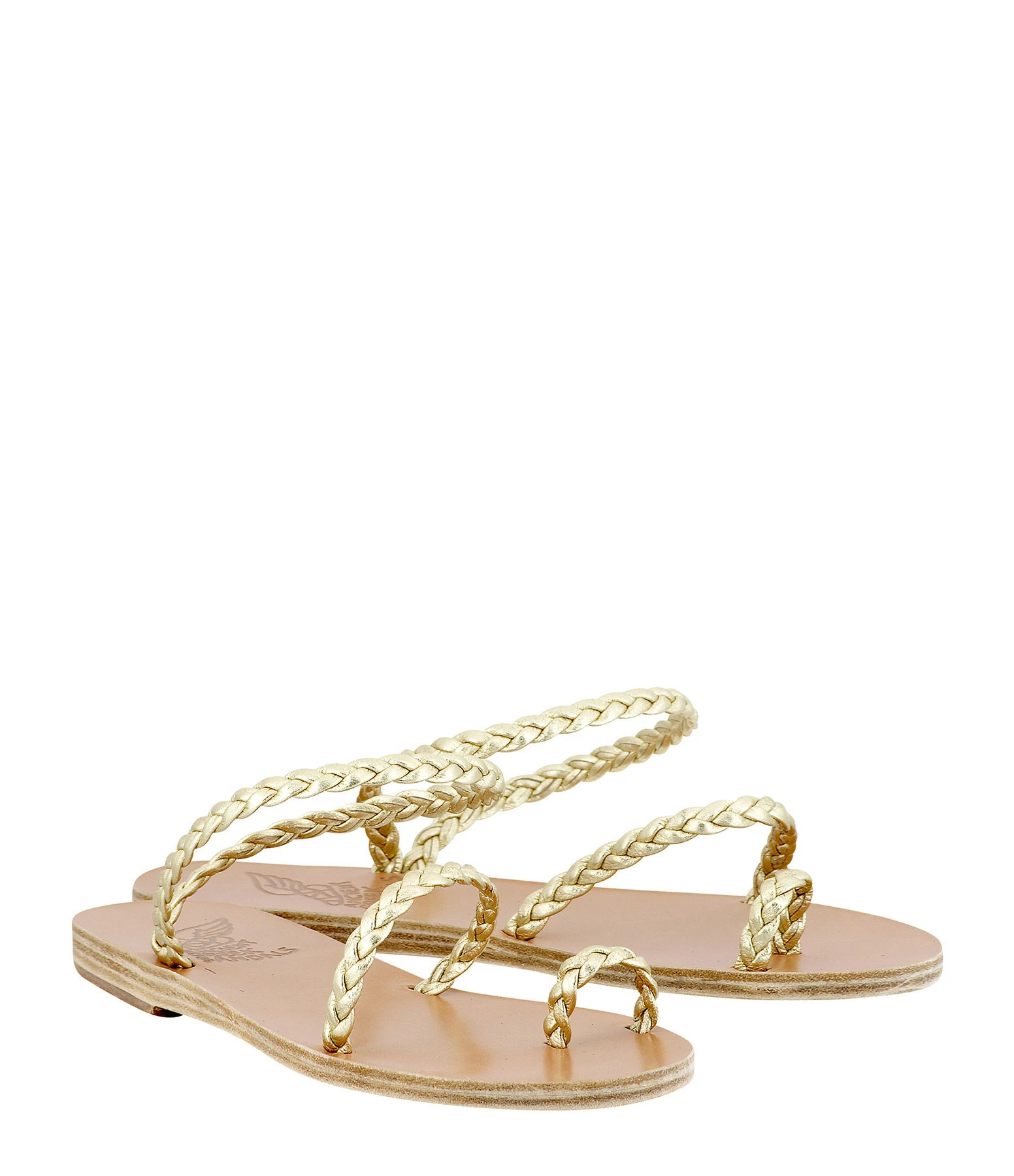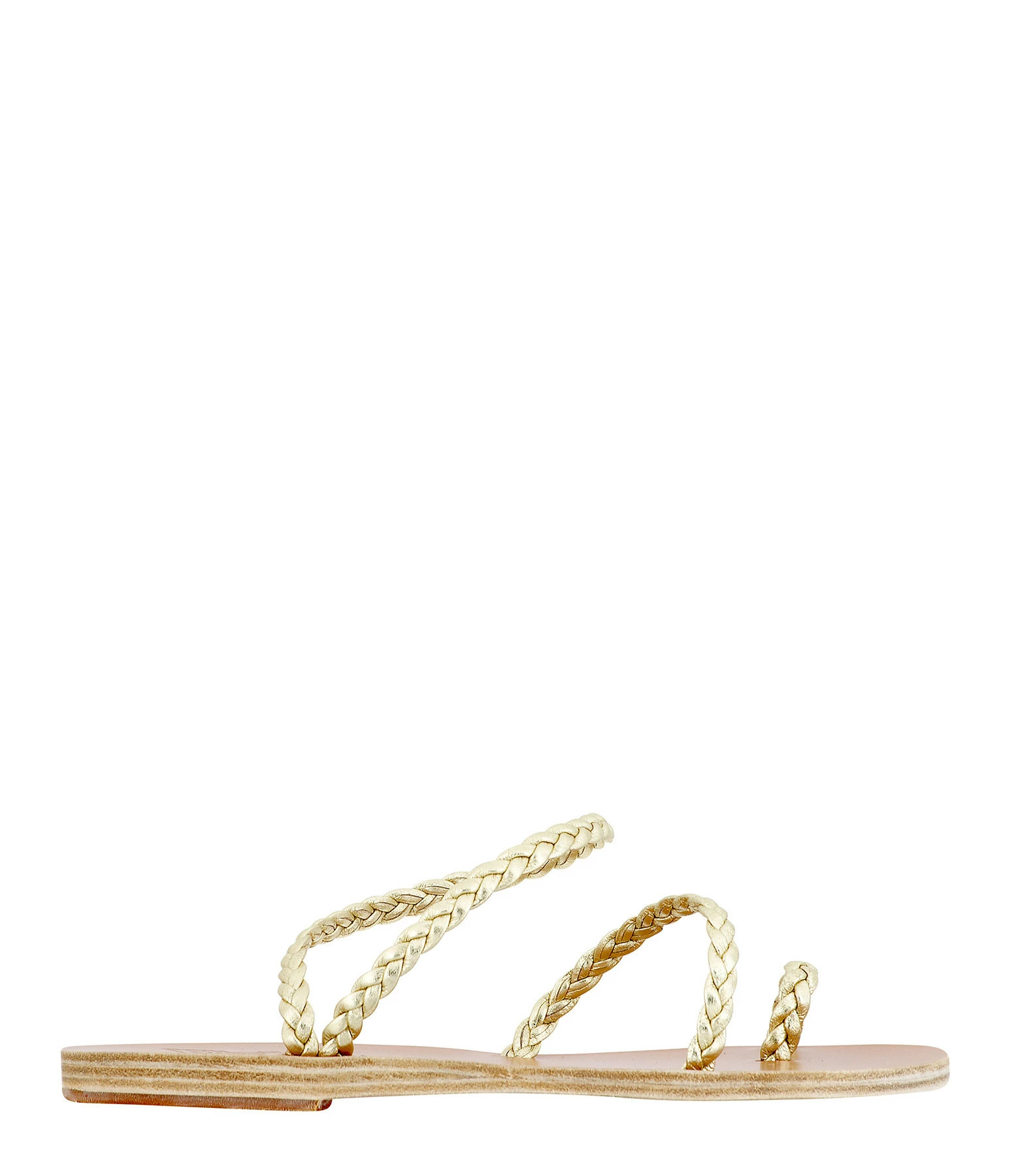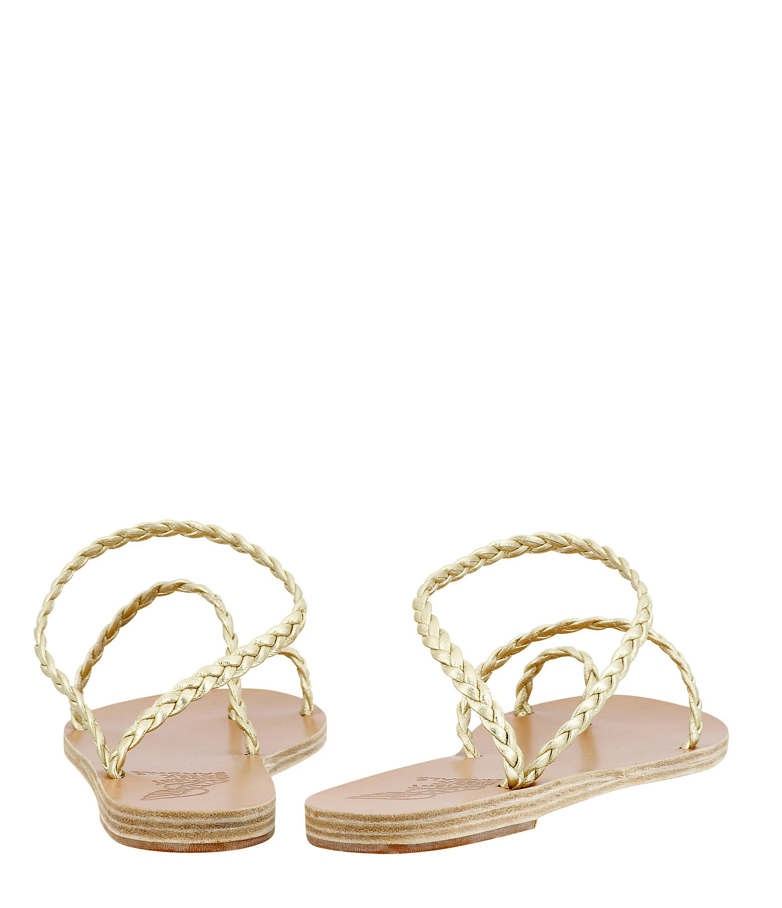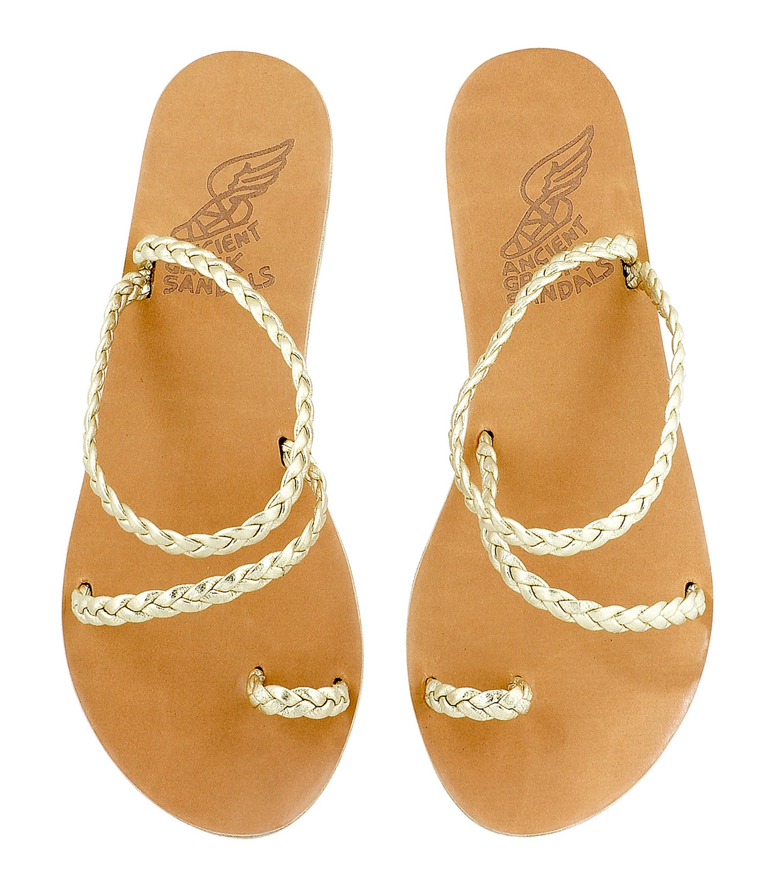 Sandales en cuir végétal. Brides tressées en cuir platine. Une bride à l’entre-doigt, une sur le dessus du pied et une bride autour de la cheville. Les brides ne sont pas réglables.