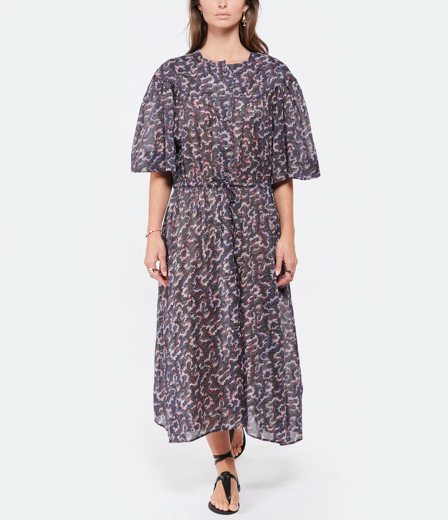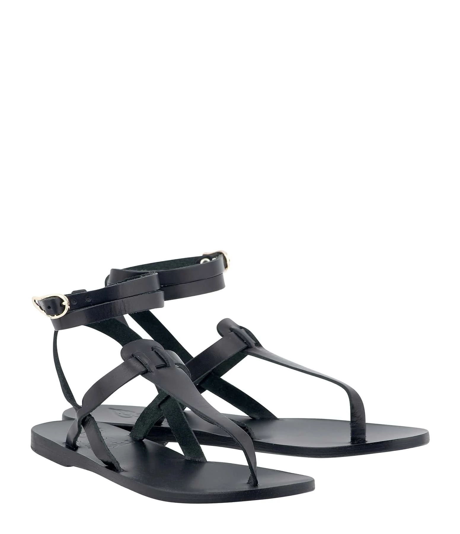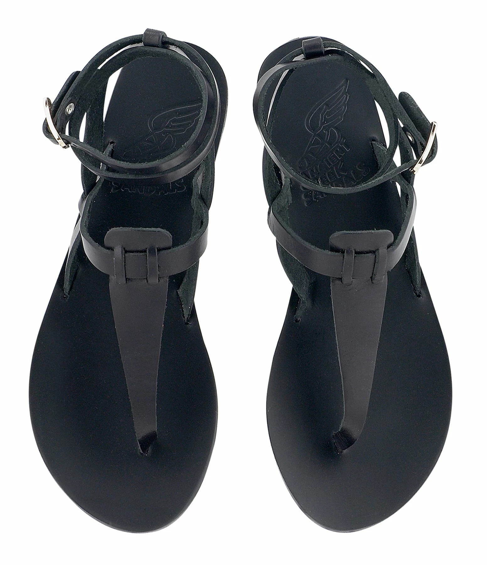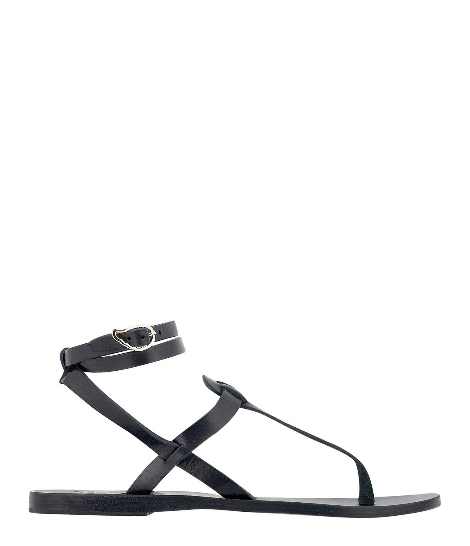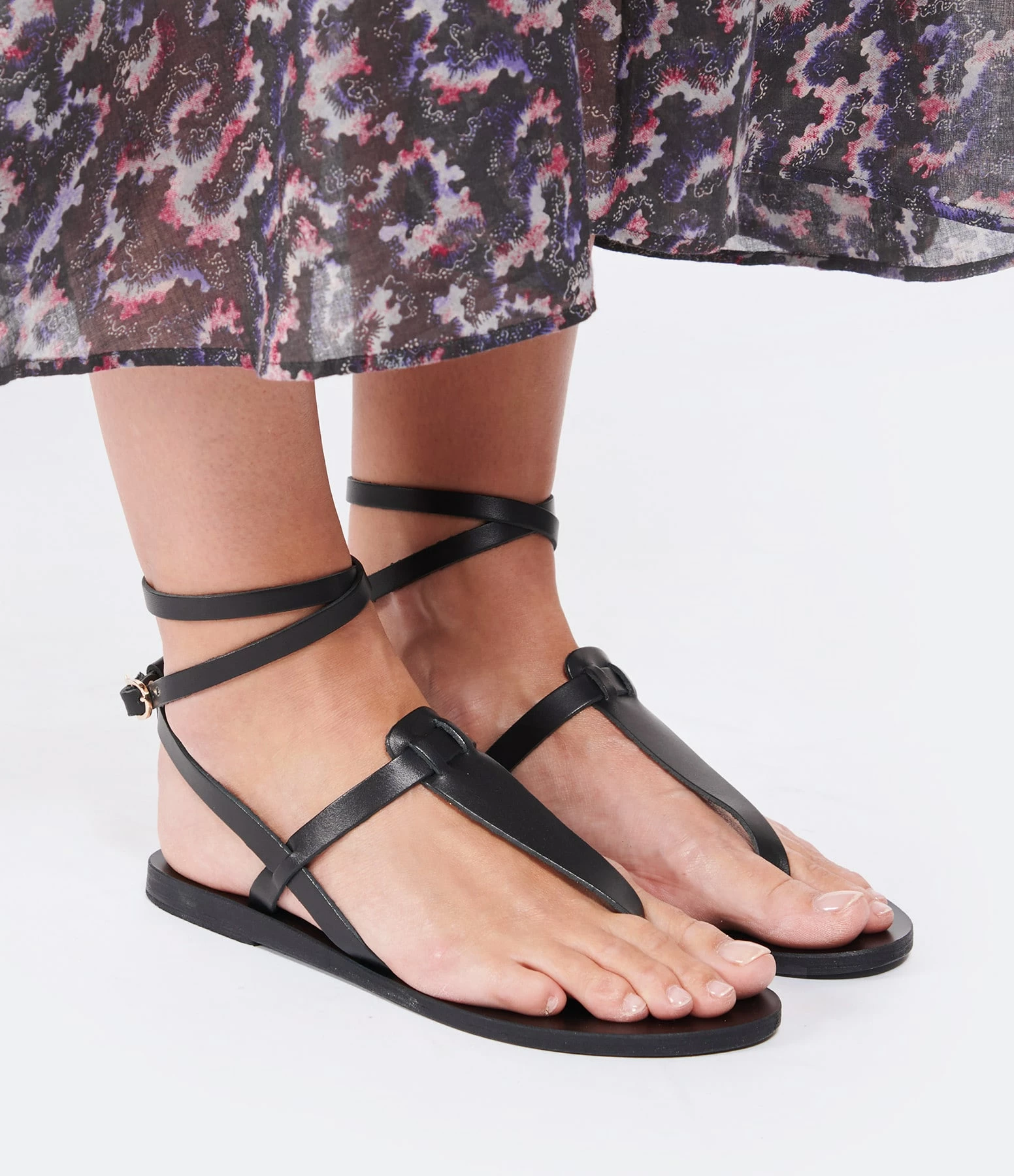 sandale en cuir végétal noir. Brides réglable enroulées autour de la cheville. Bride entre-doigt.