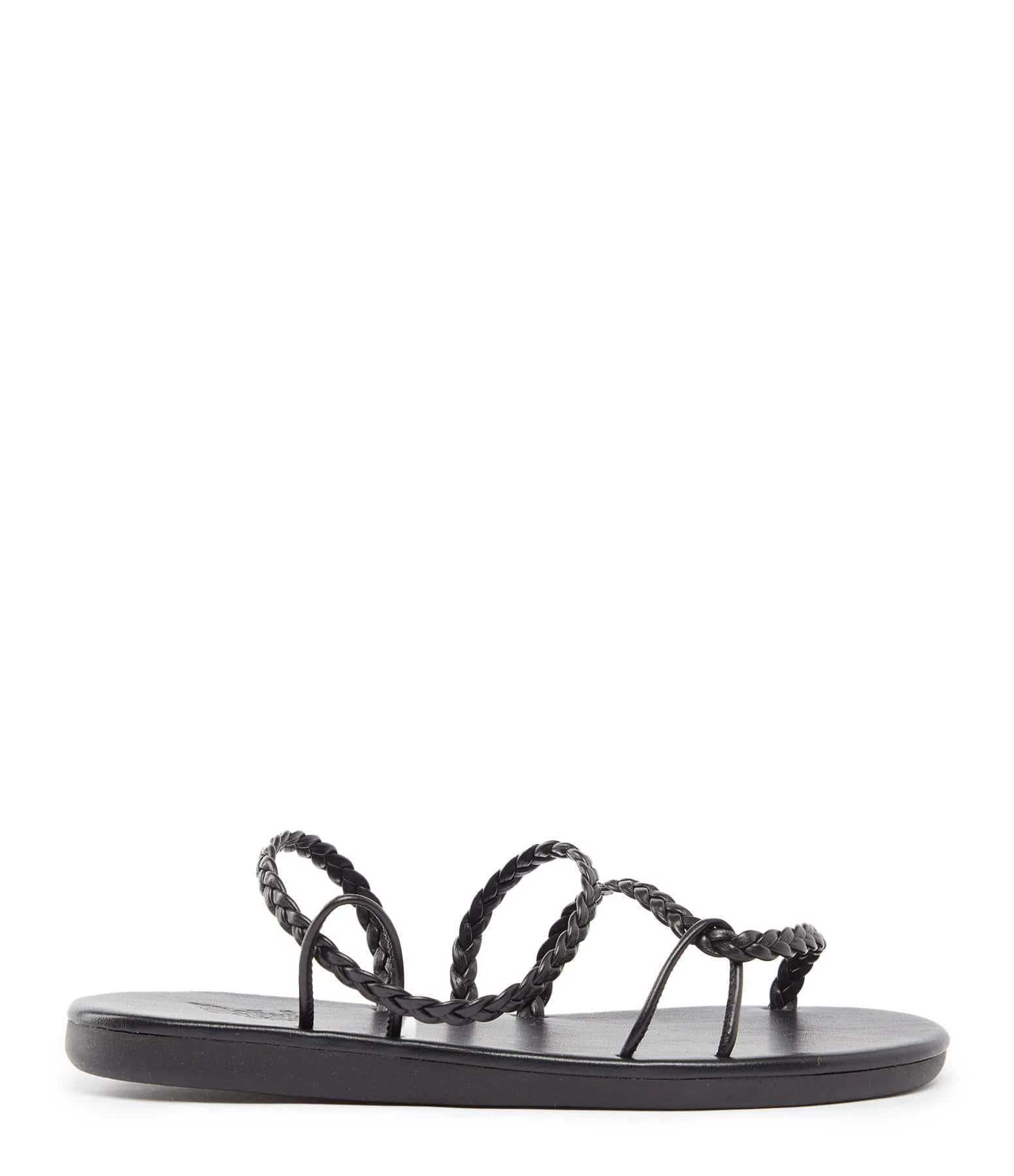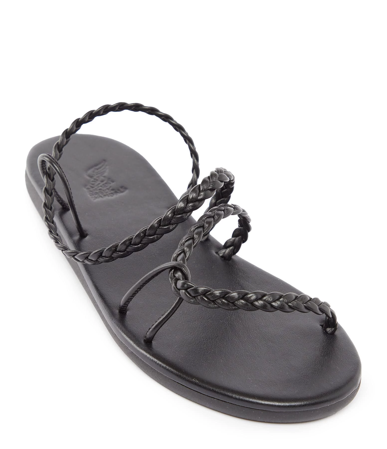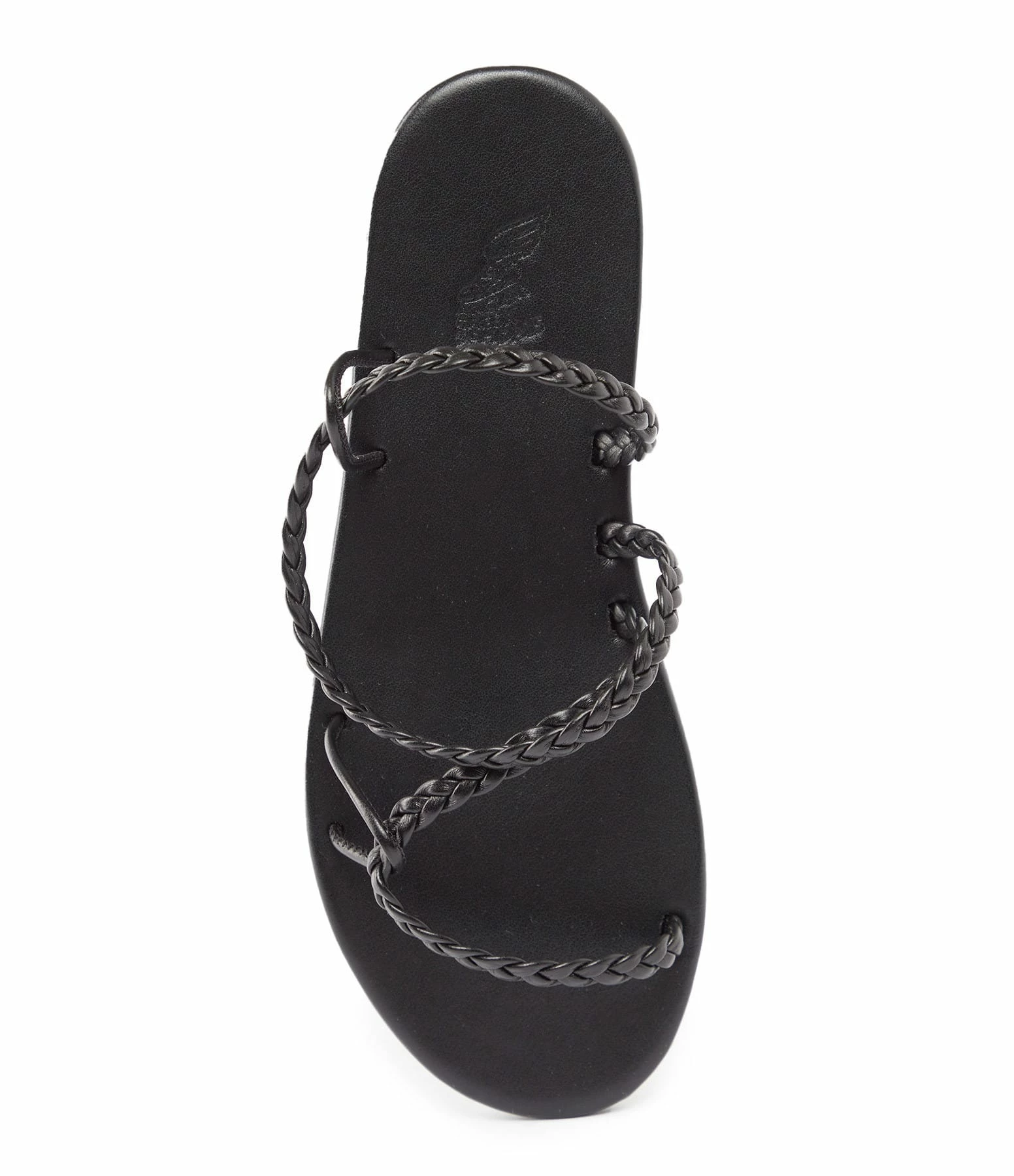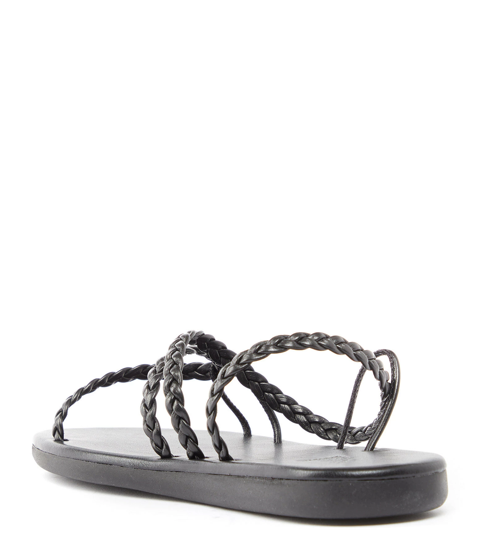 Sandales en cuir tressé noir. Une bride sur le dessus du pied et une bride autour de la cheville. Les brides ne sont pas réglables.