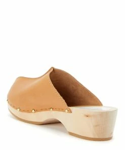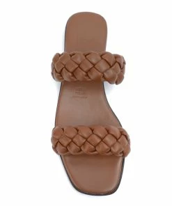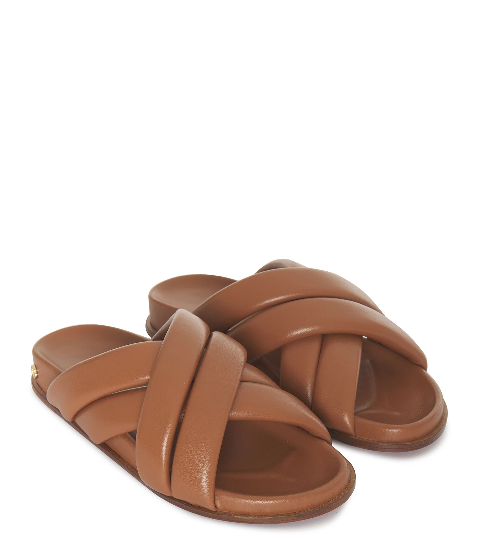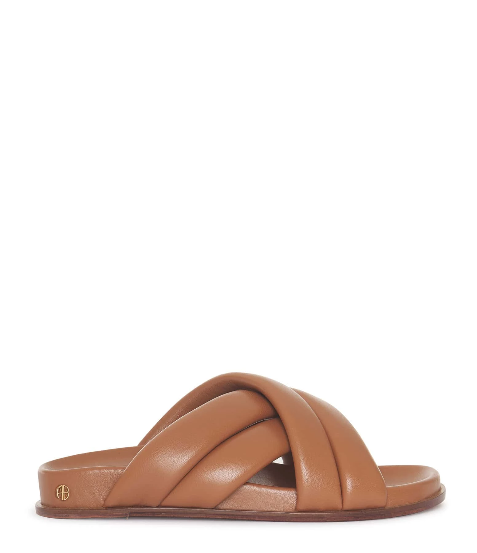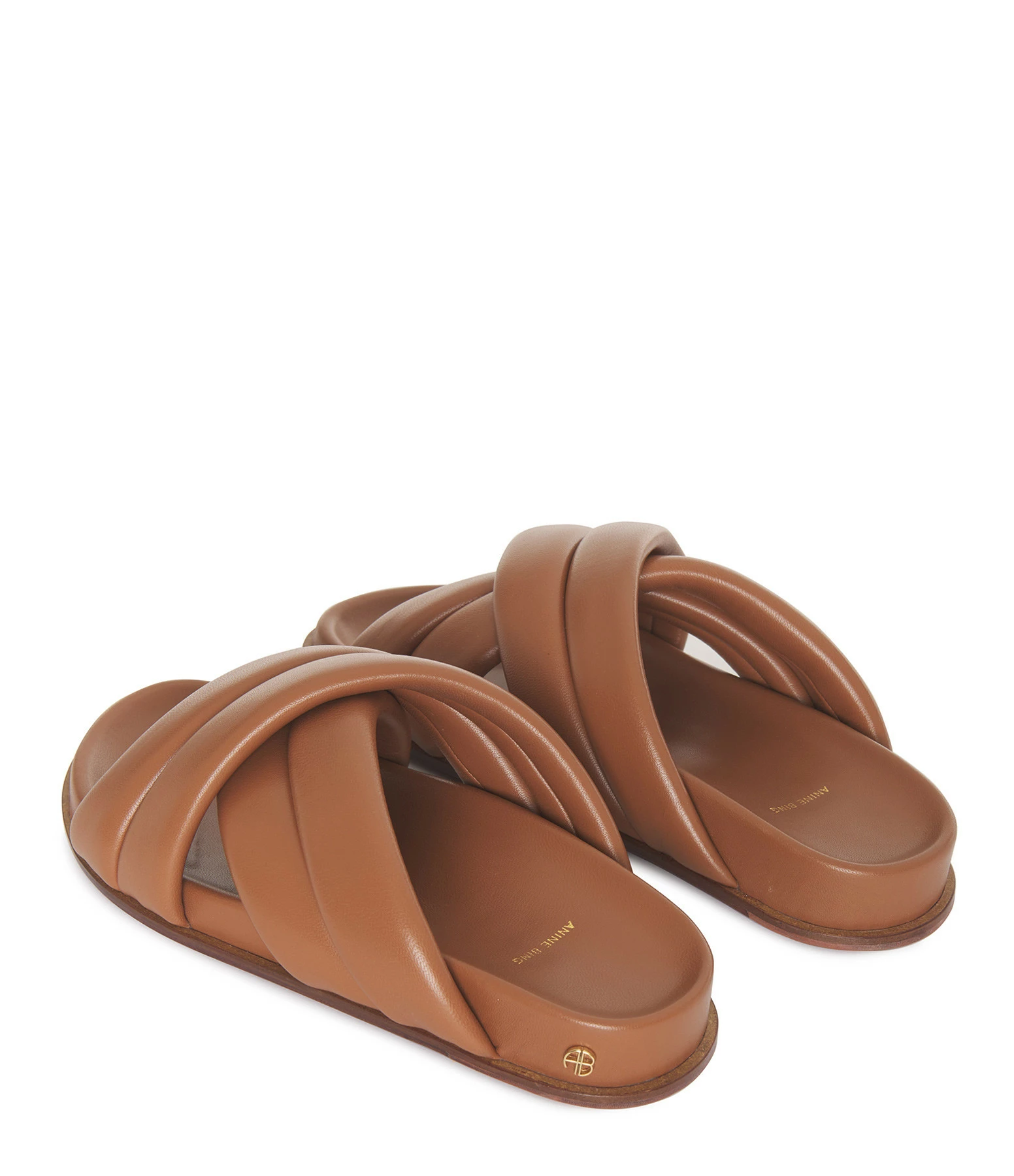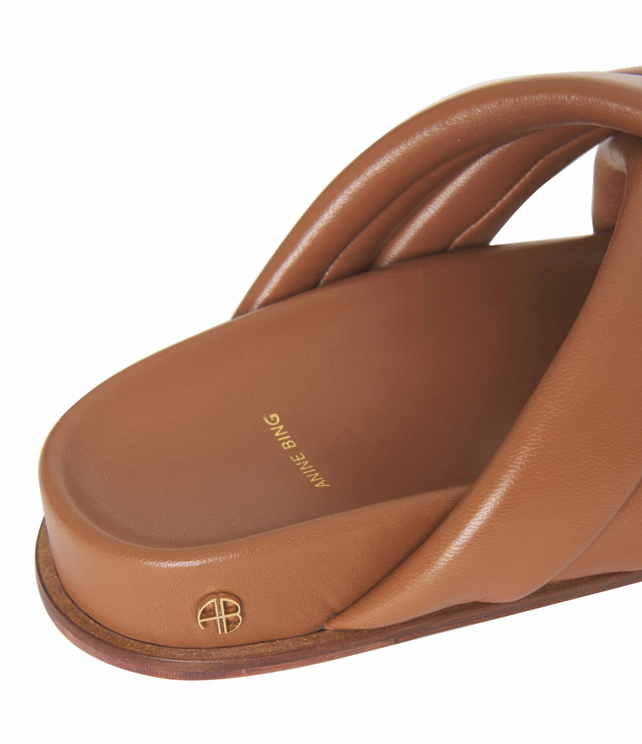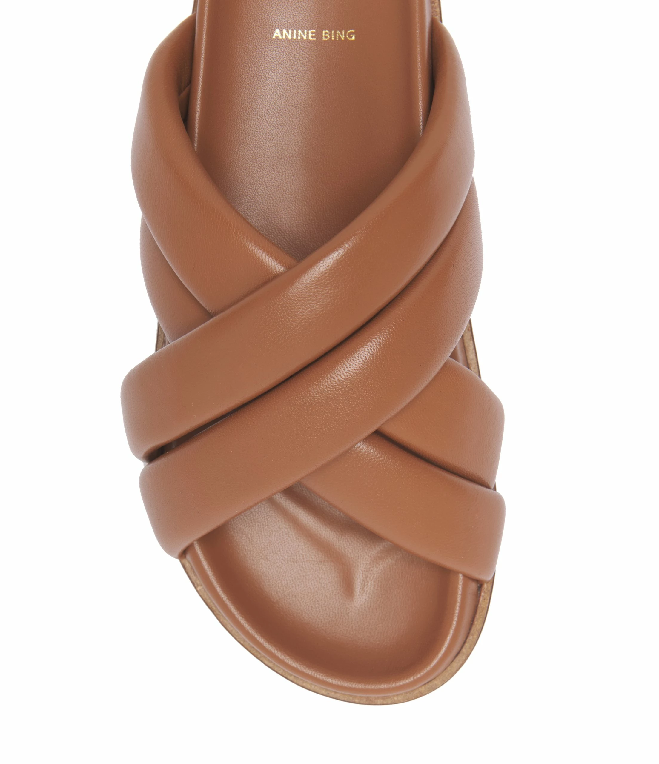 Mules en cuir marron. Brides croisées épaisses. Logo Anine Bing doré sur l’extérieur de la chaussure.