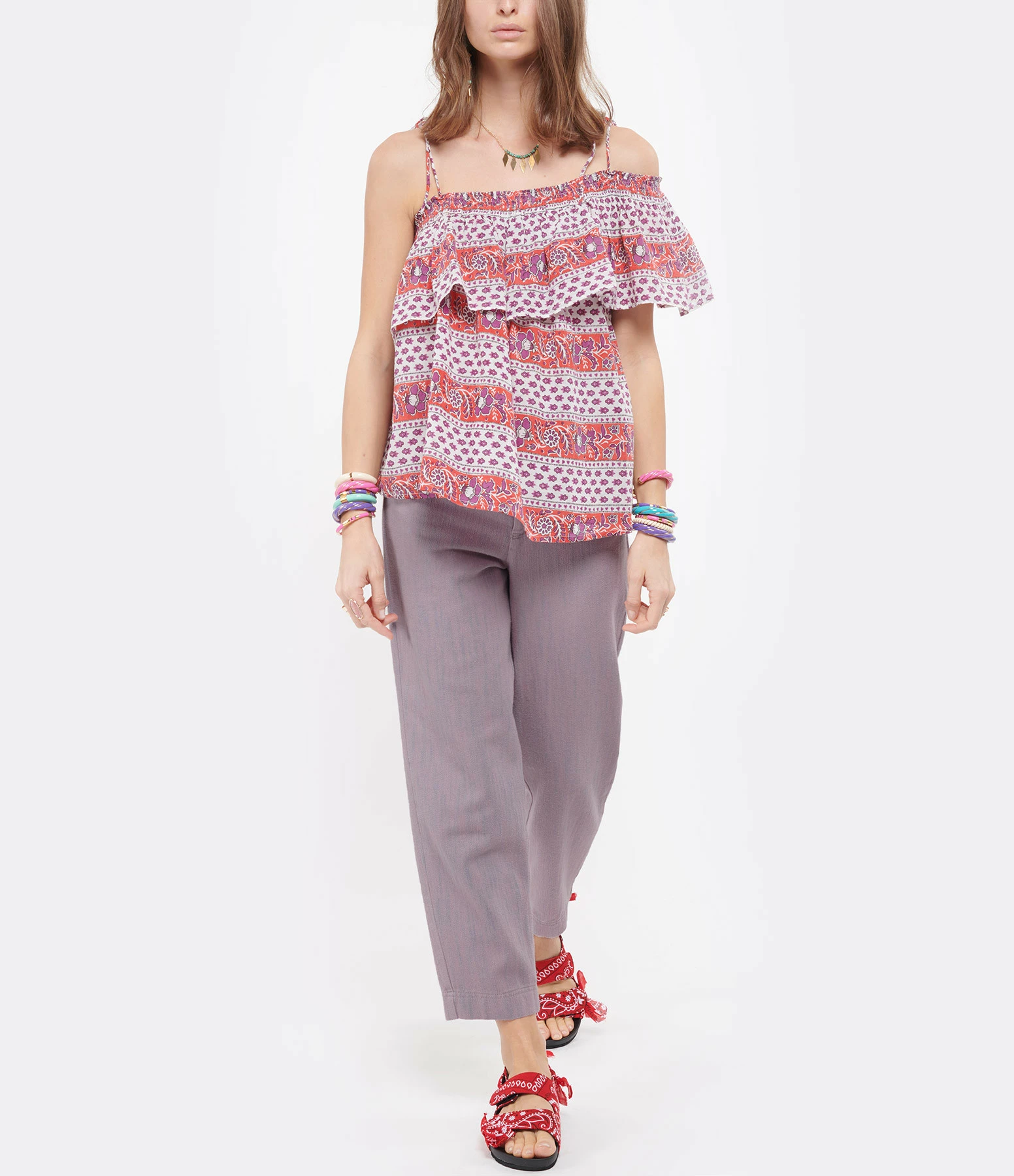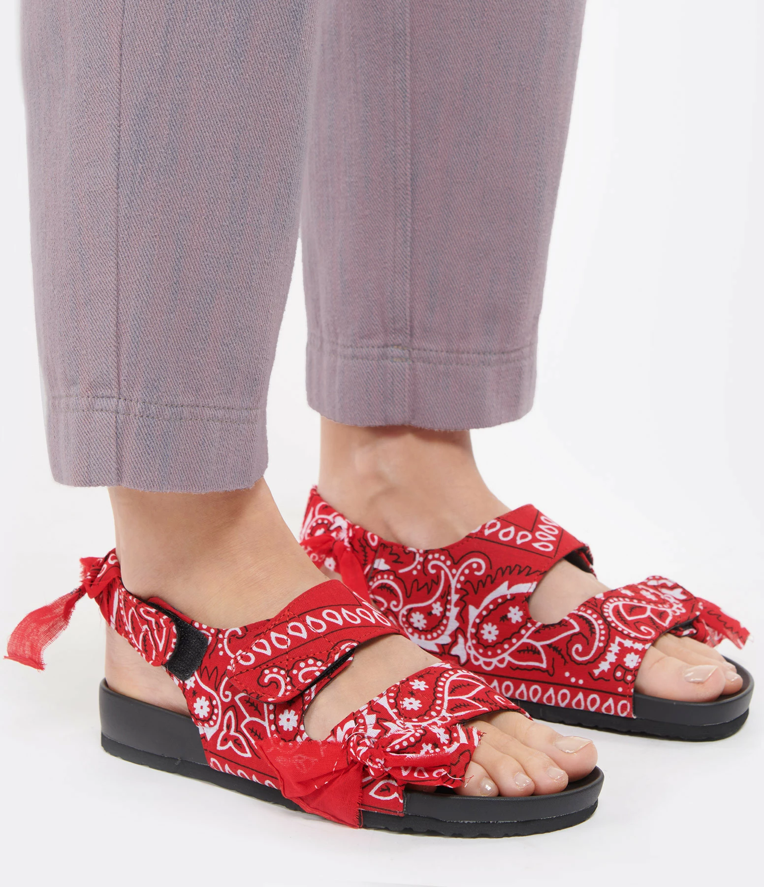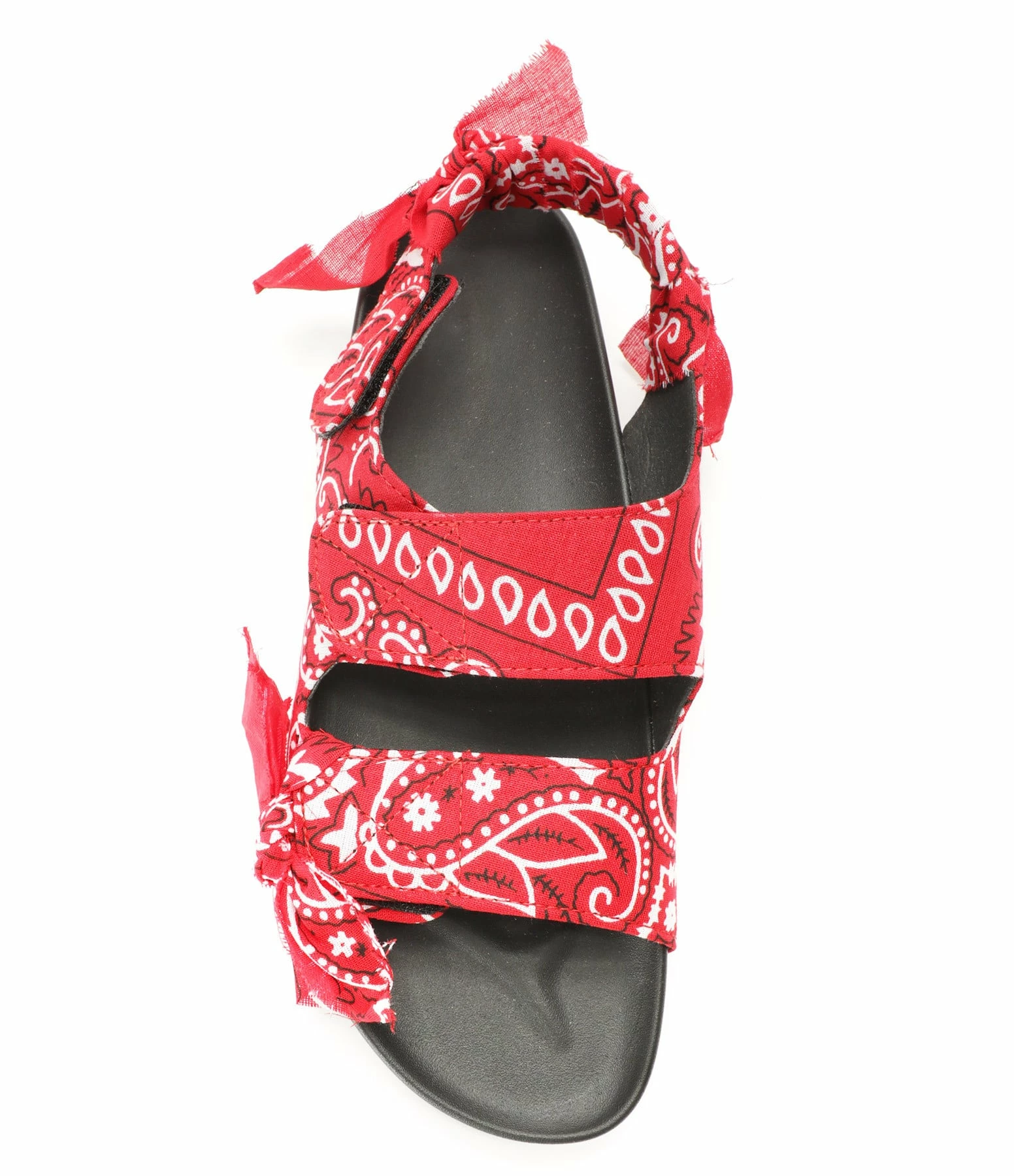 Sandales recouvertes de tissus imprimé bandana rouge. Nœuds décoratifs. Deux scratchs sur le pied et un à la cheville. Semelle en mousse recyclée.