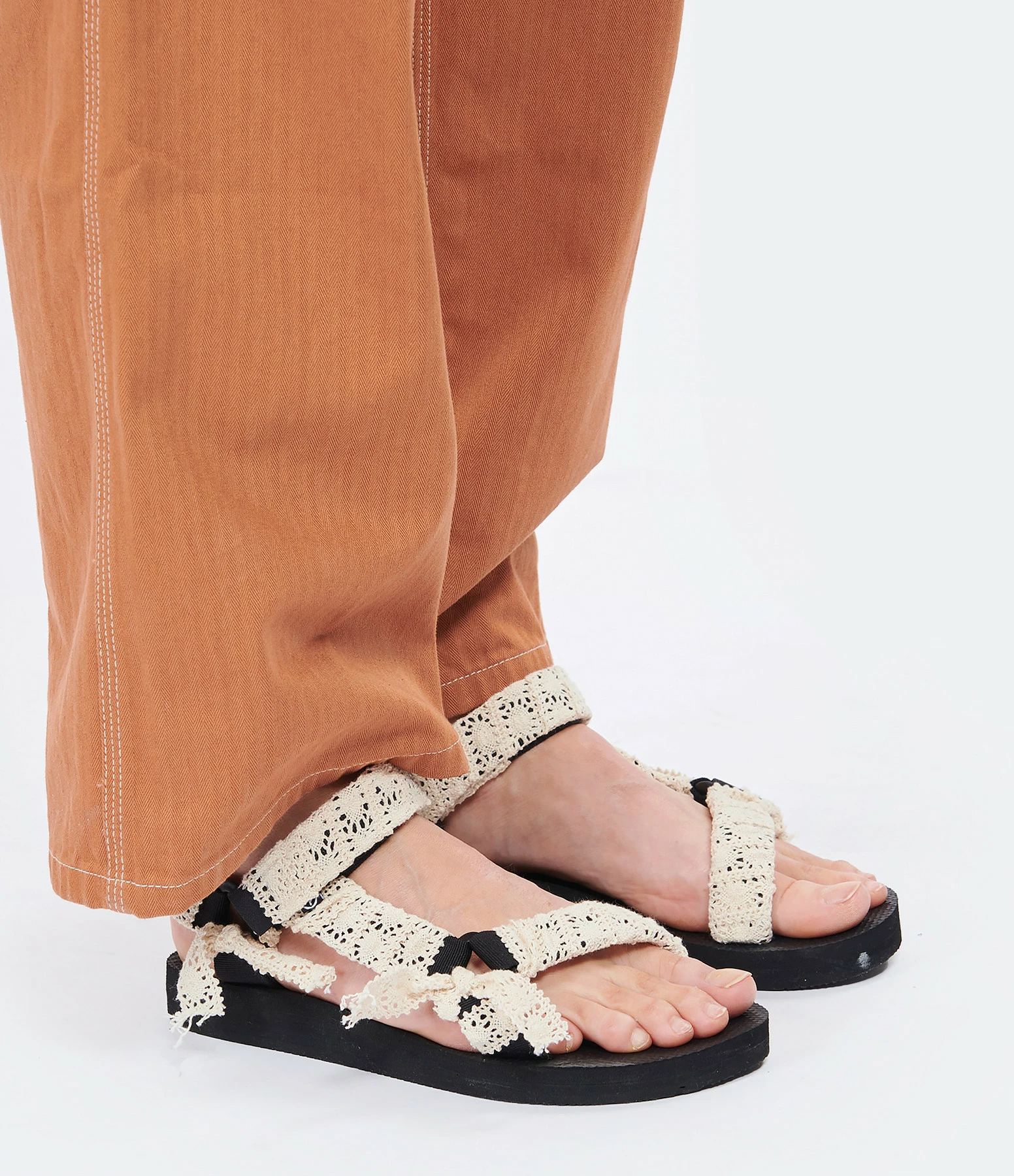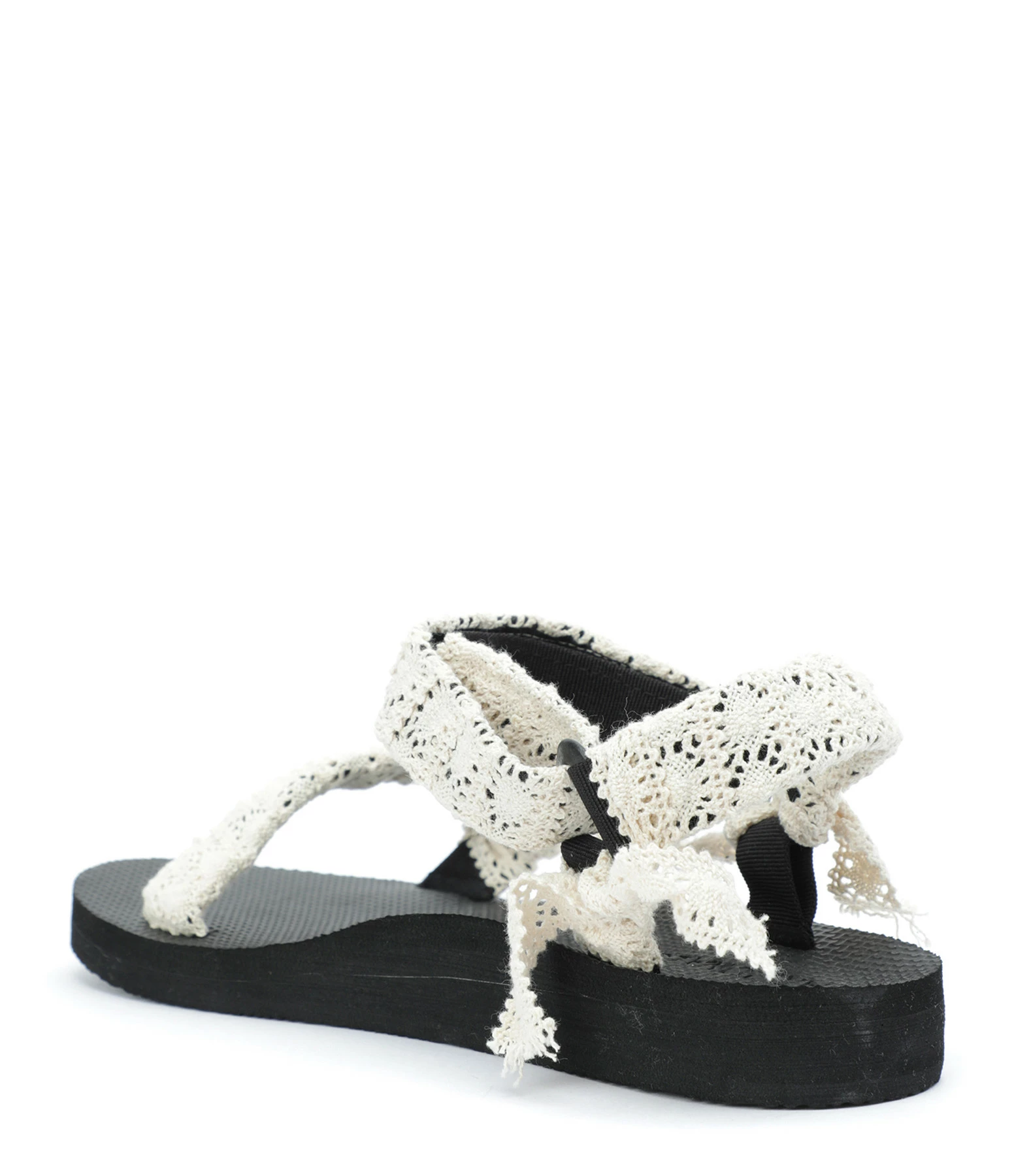 Sandales à brides en dentelle écru coupée à cru. Nœuds décoratifs. Attache à scratch autour de la cheville. Semelle en mousse recyclée.