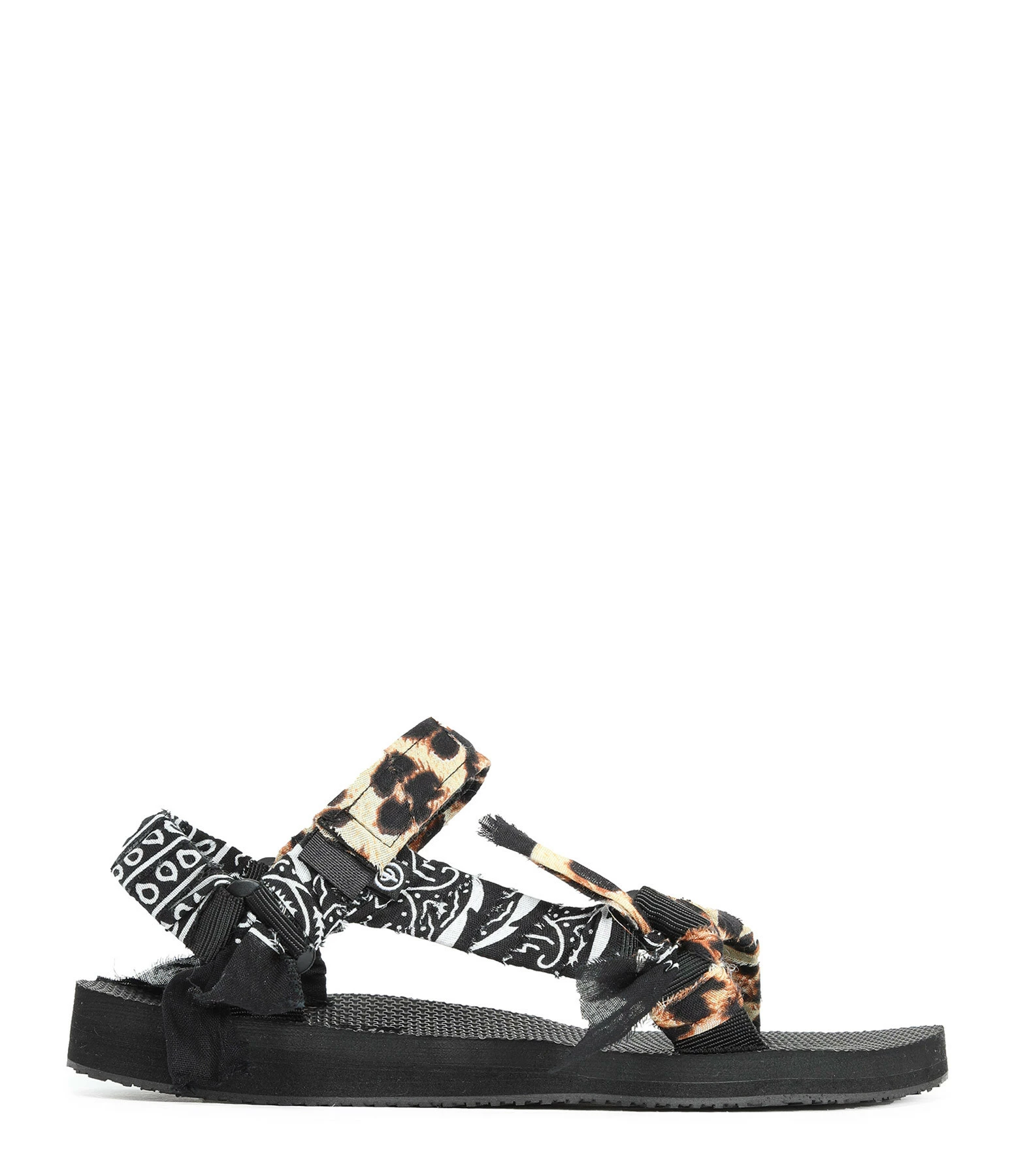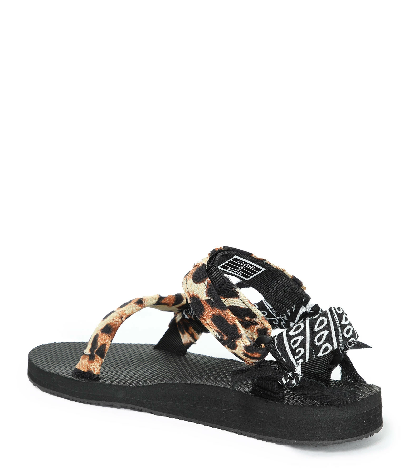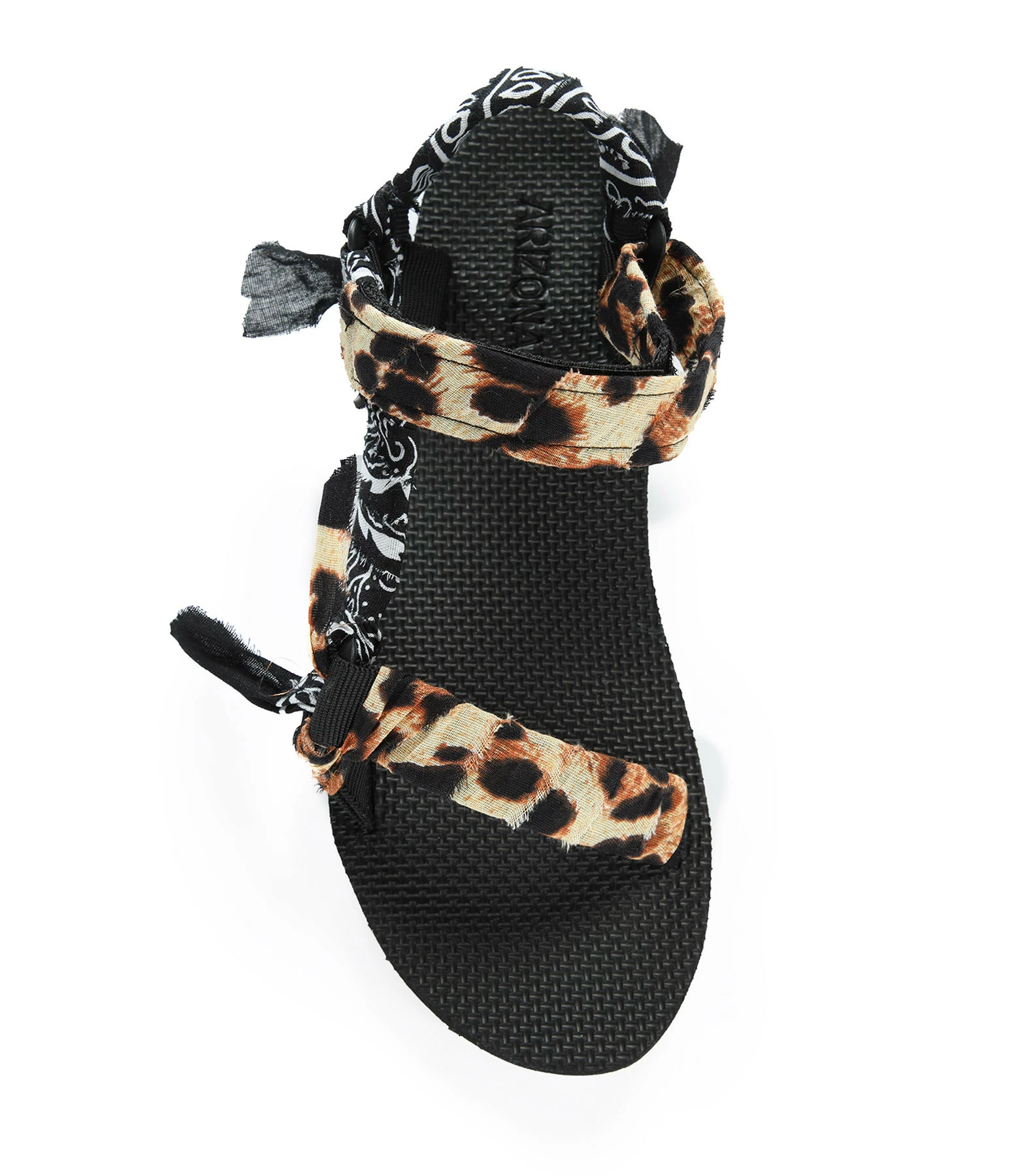 Sandales à brides enroulées de bandana noir et imprimé léopard coupé à cru. Nœuds décoratifs. Attache à scratch autour de la cheville. Semelle en mousse recyclée.