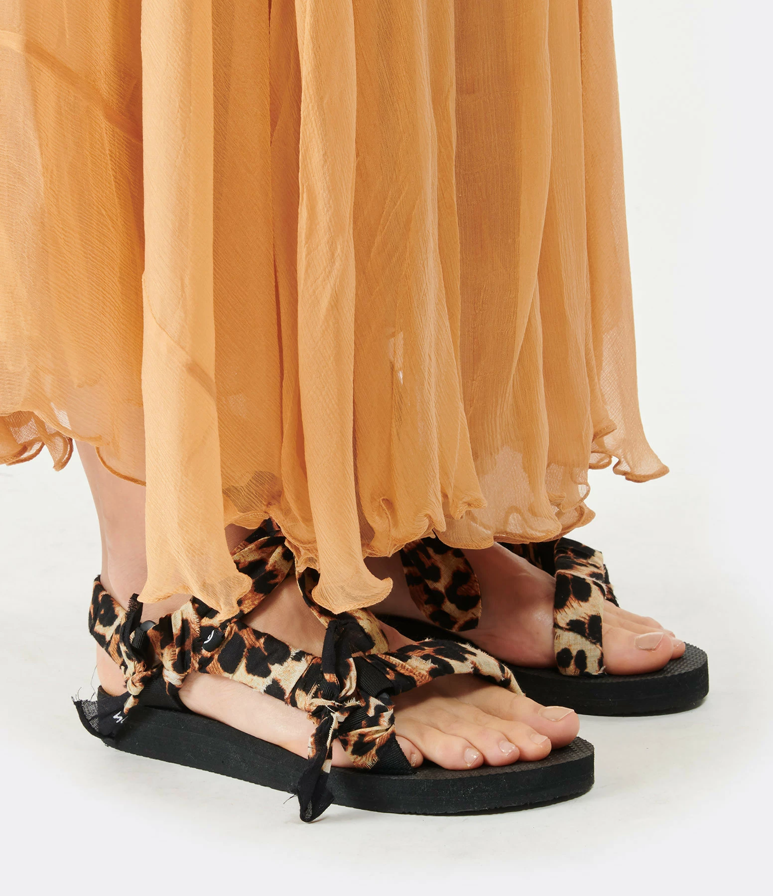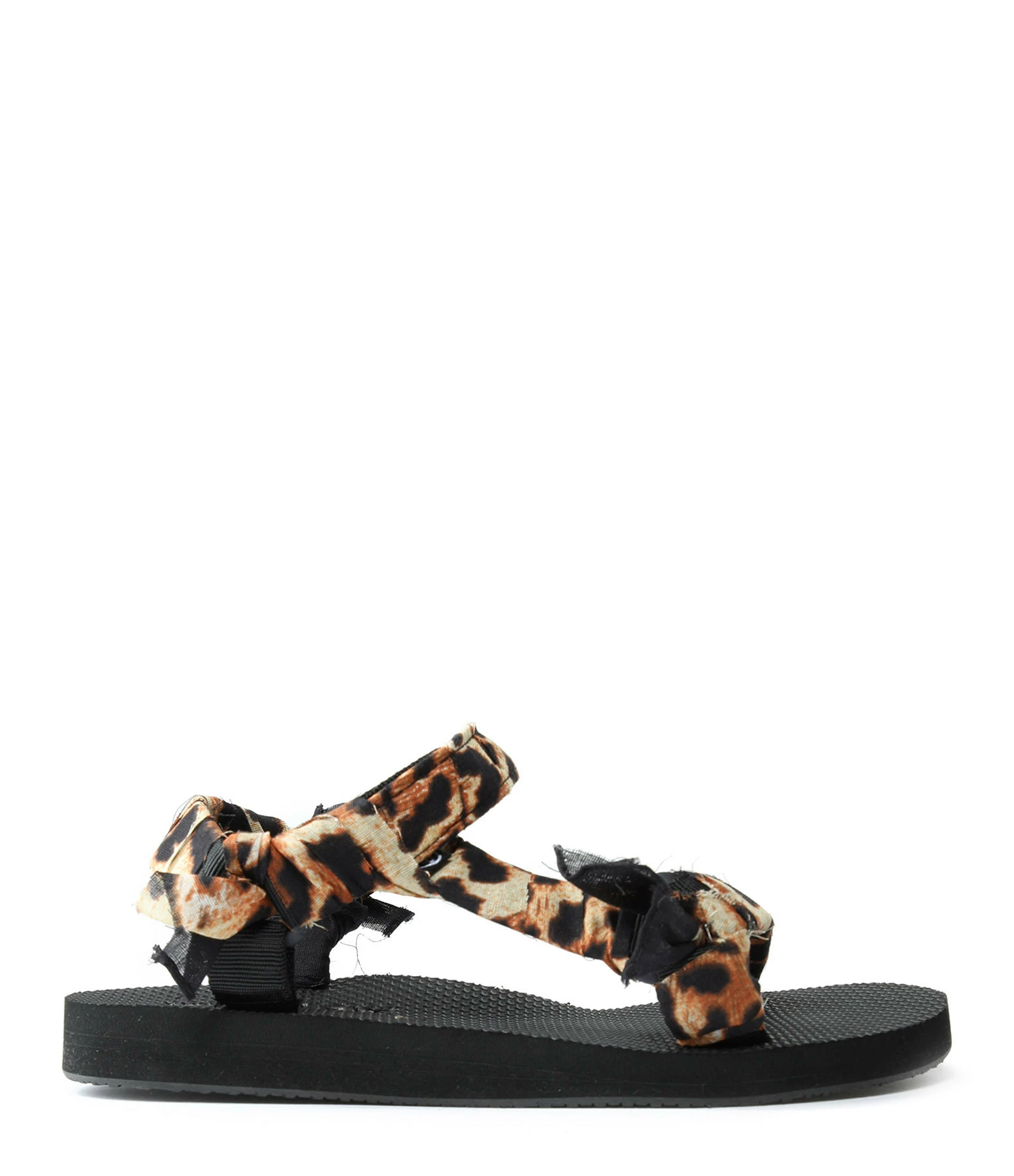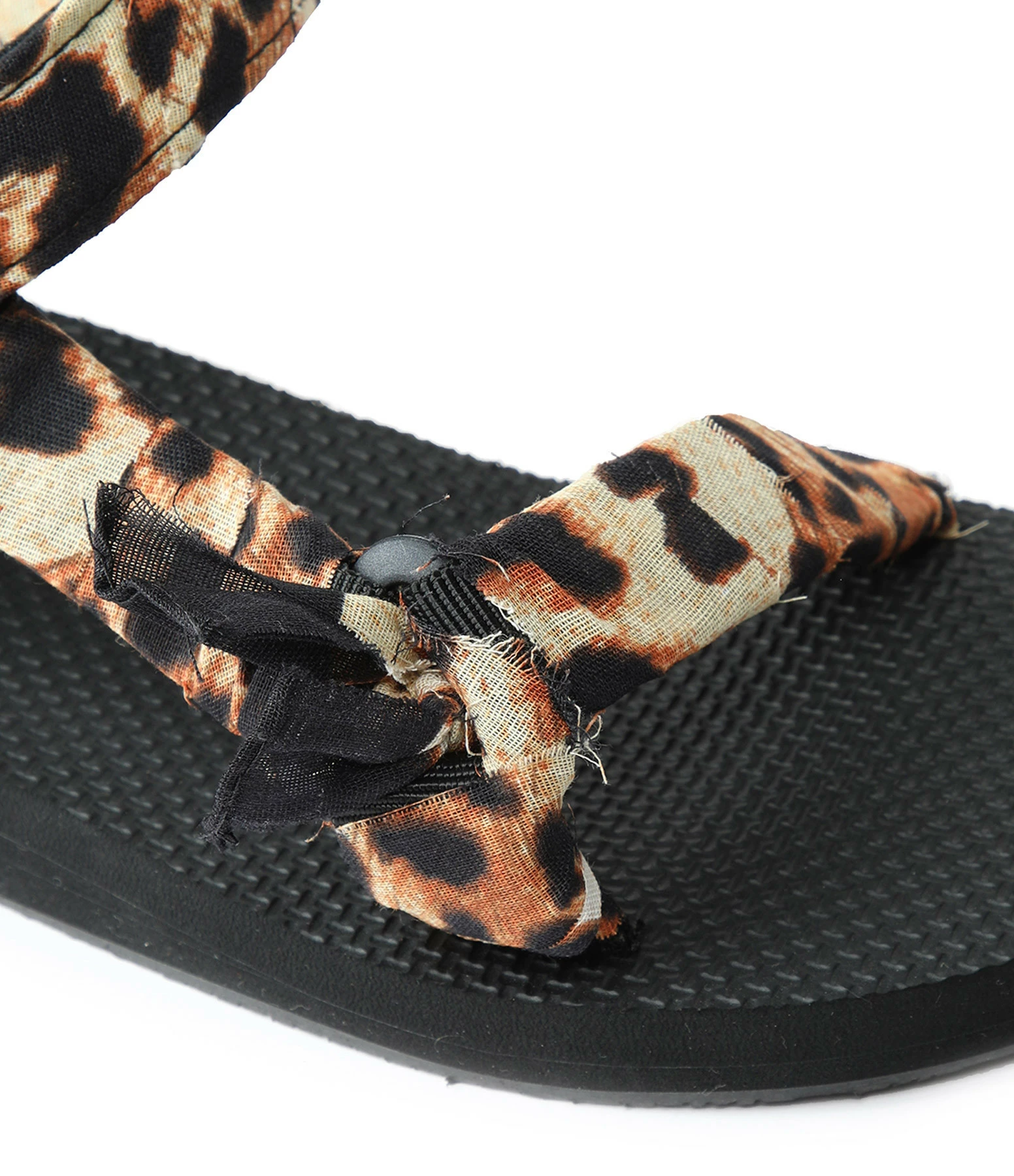 Sandales à brides enroulées de tissu imprimé zèbre et bandana noir coupé à cru. Nœuds décoratifs. Attache à scratch autour de la cheville. Semelle en mousse recyclée.