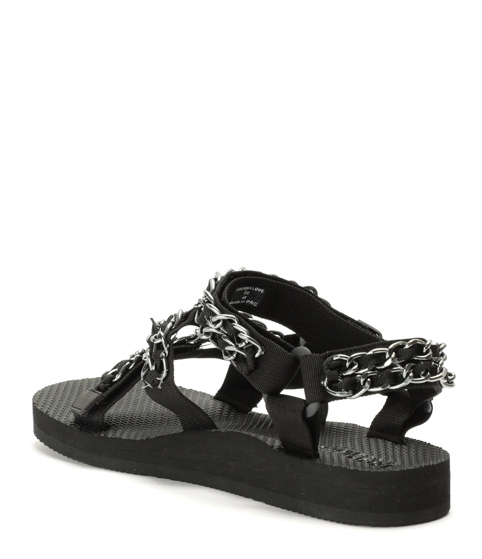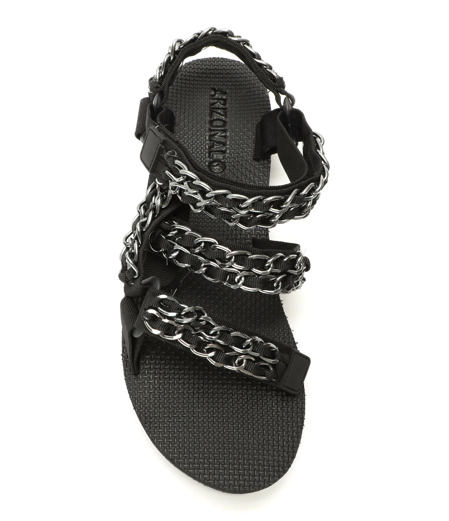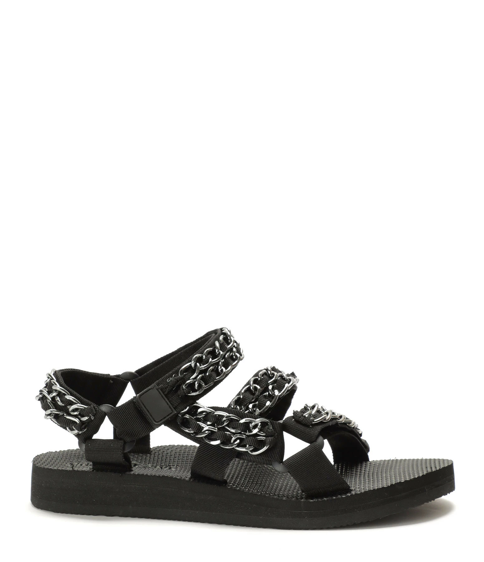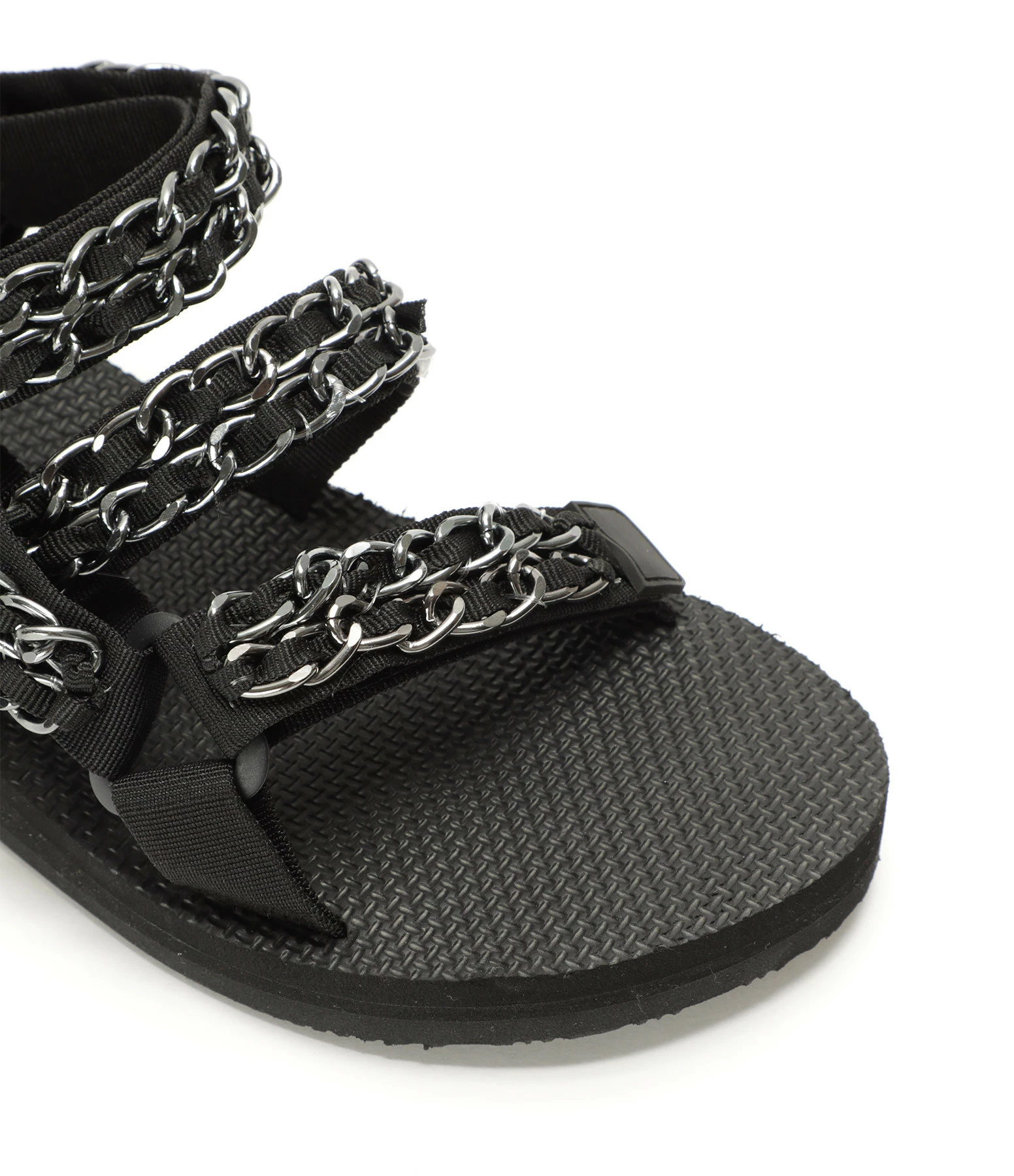 Sandales avec deux chaînes argentée tressées sur chaque bride. Attache à deux scratchs sur l’avant du pied et un à la cheville. Semelle en mousse recyclée.