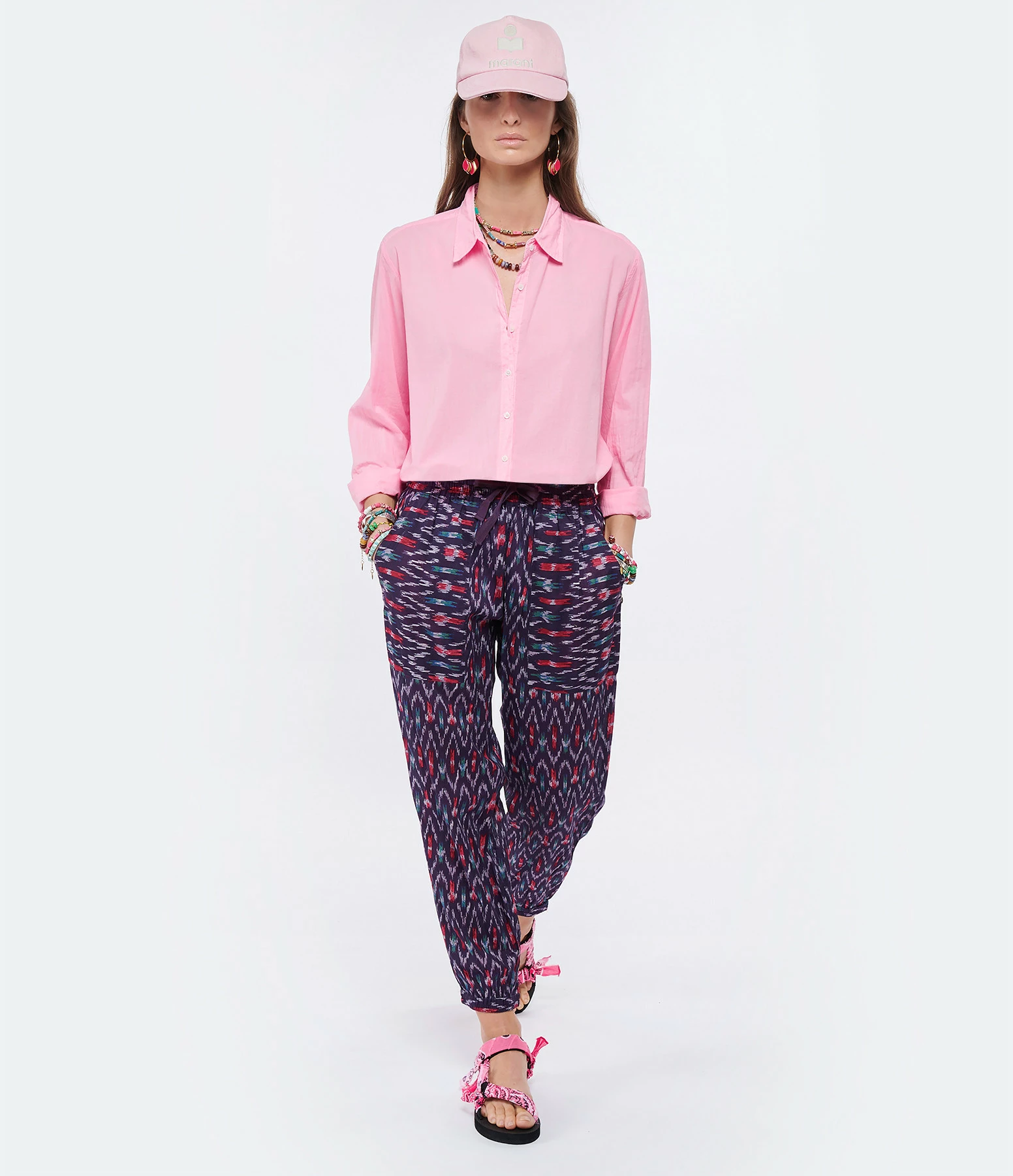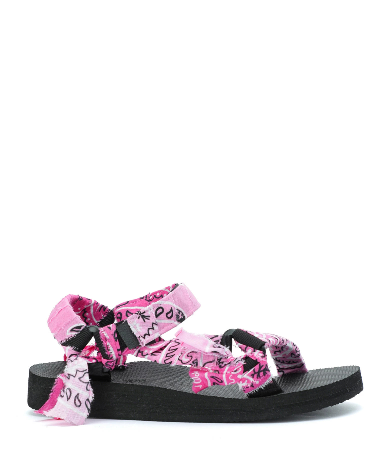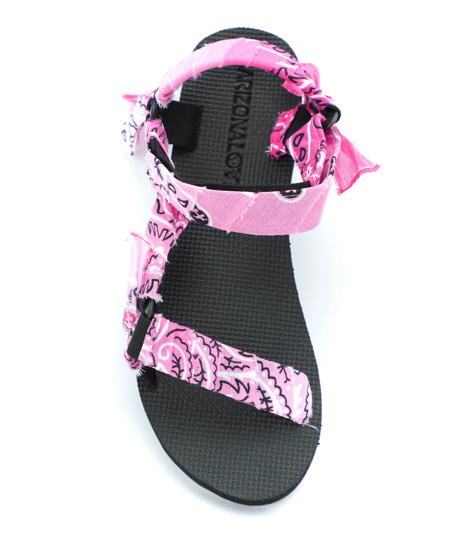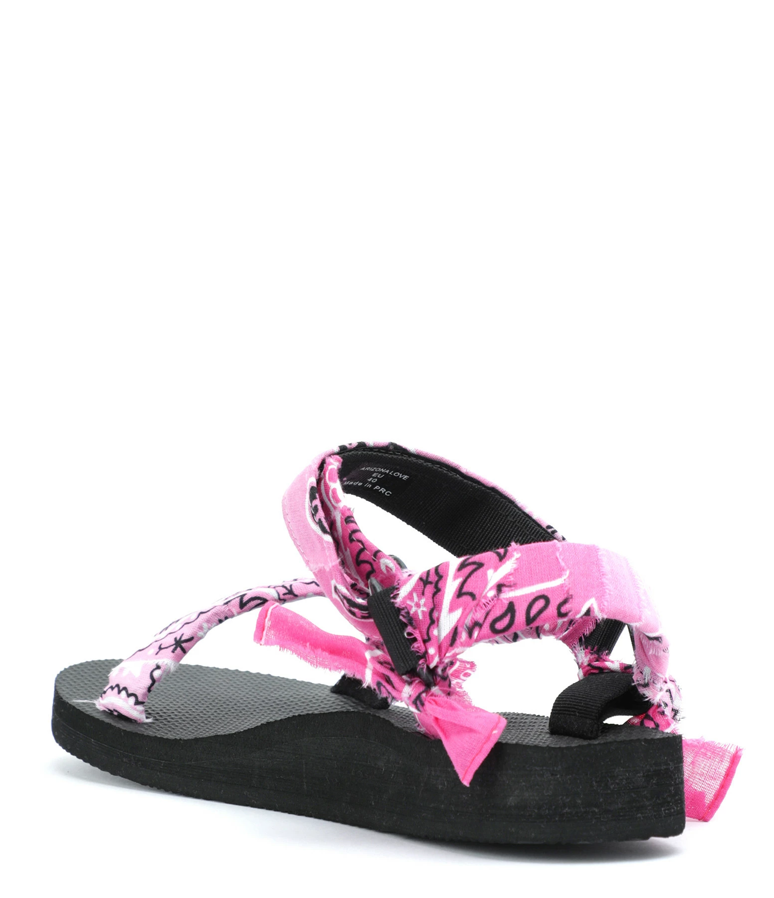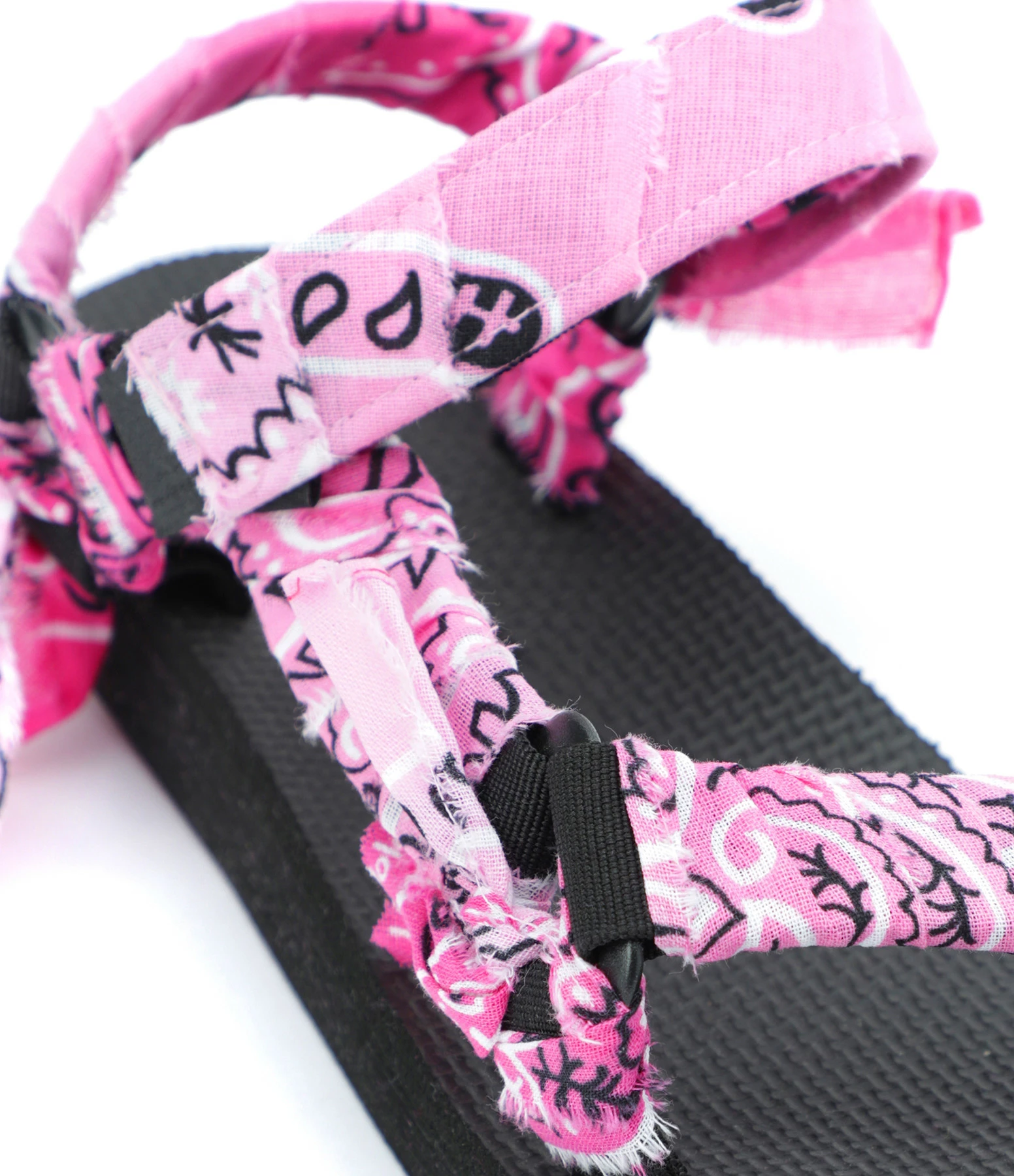 Sandales à brides enroulées de bandana rose coupé à cru. Nœuds décoratifs. Attache à scratch autour de la cheville. Semelle en mousse recyclée.