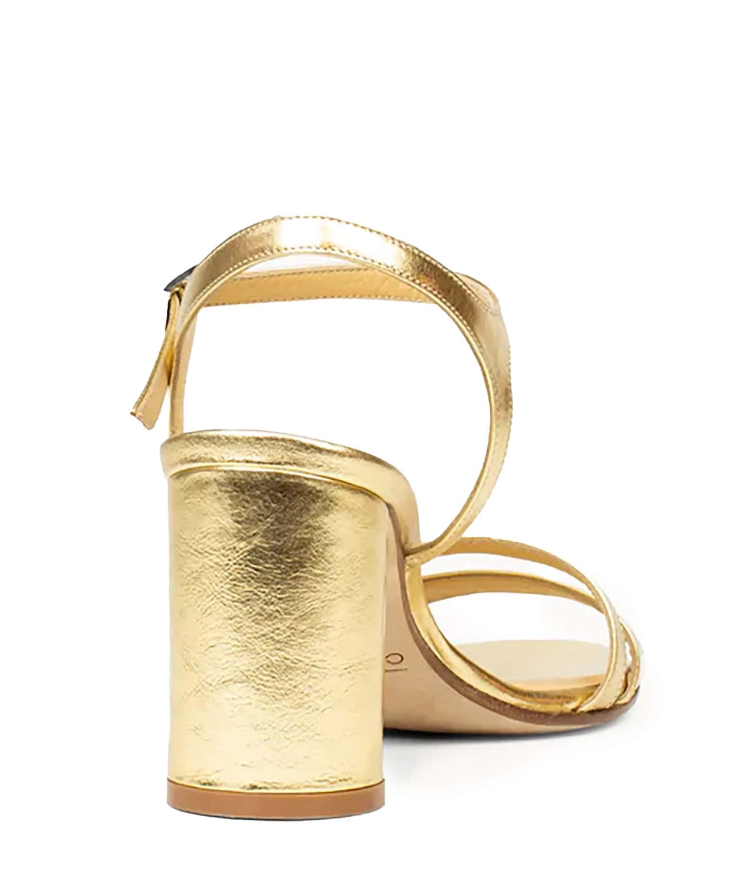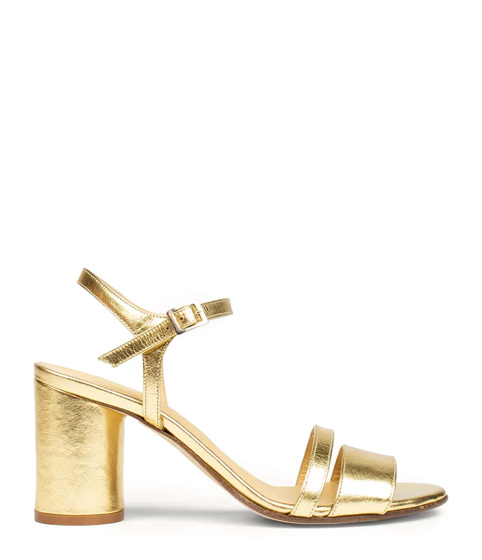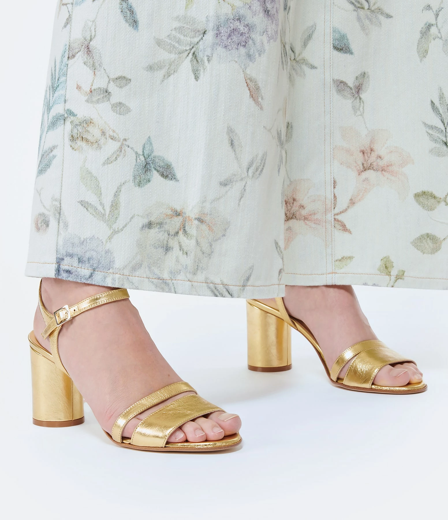 Sandales à talons en cuir doré. Deux brides à l’avant du pied et une réglable autour de la cheville. Talons ronds.