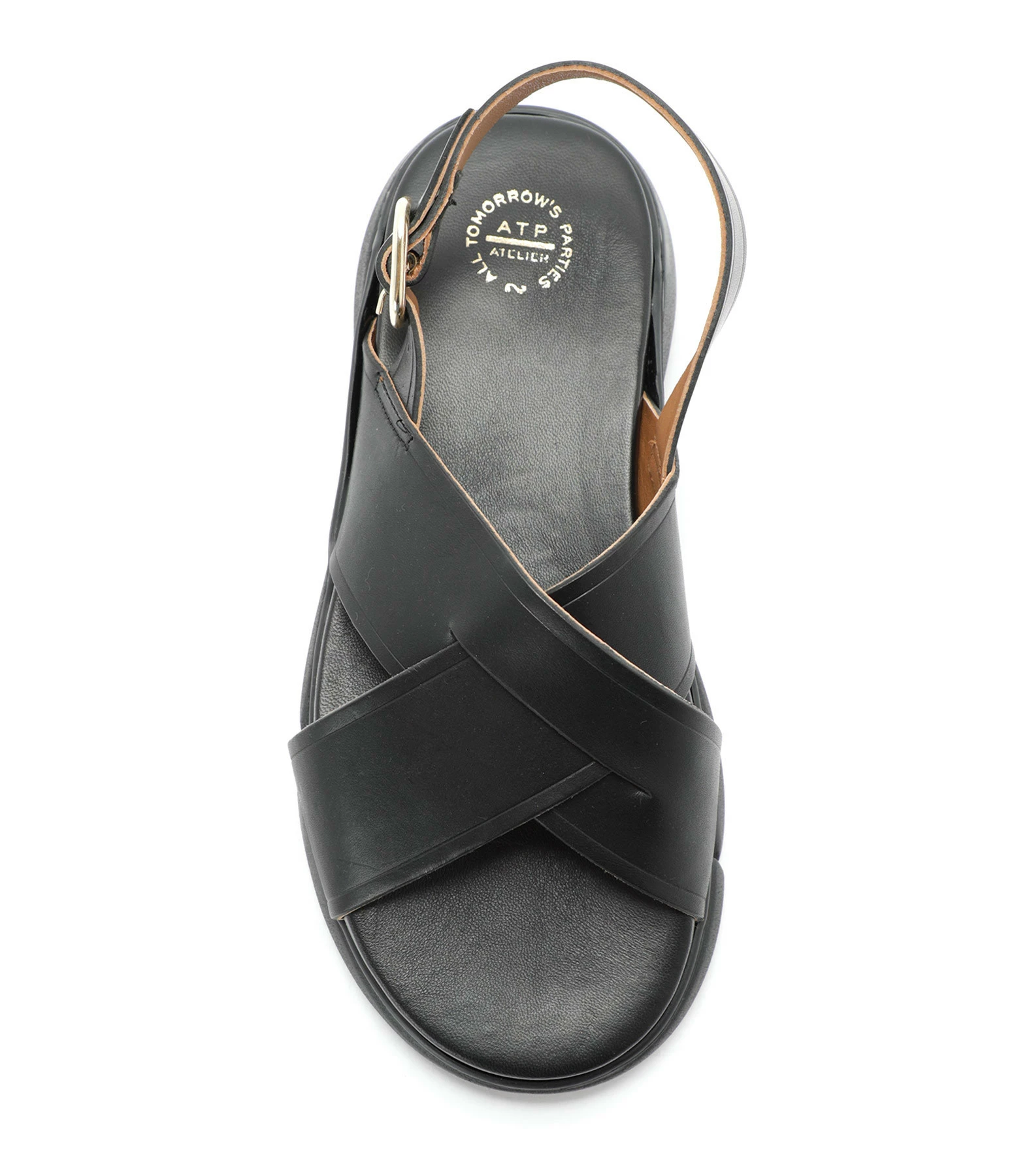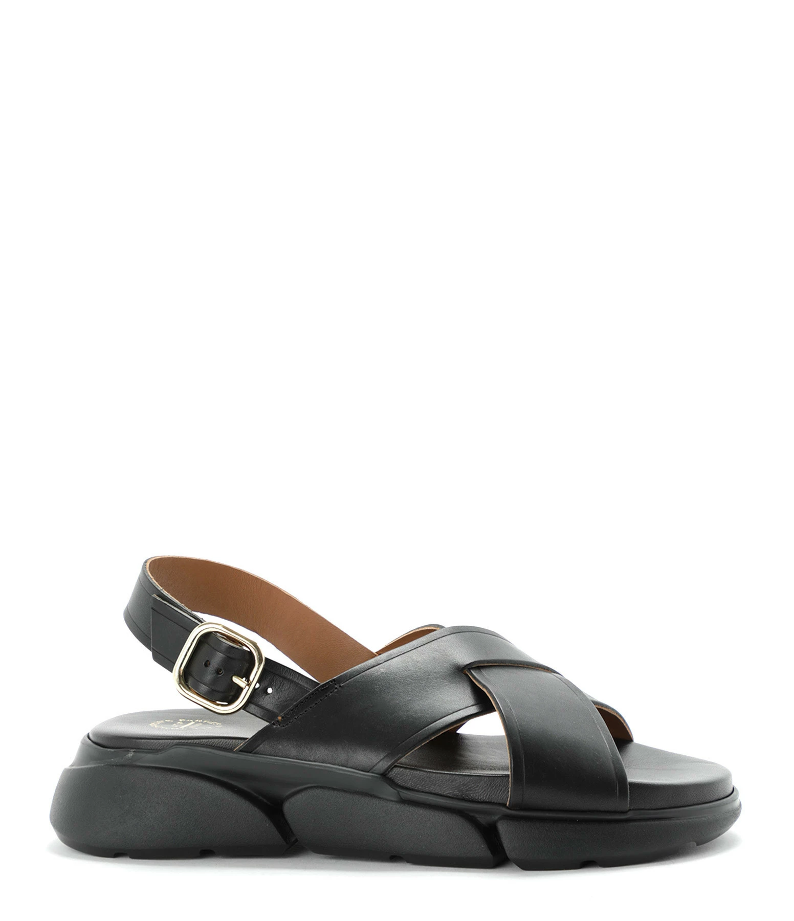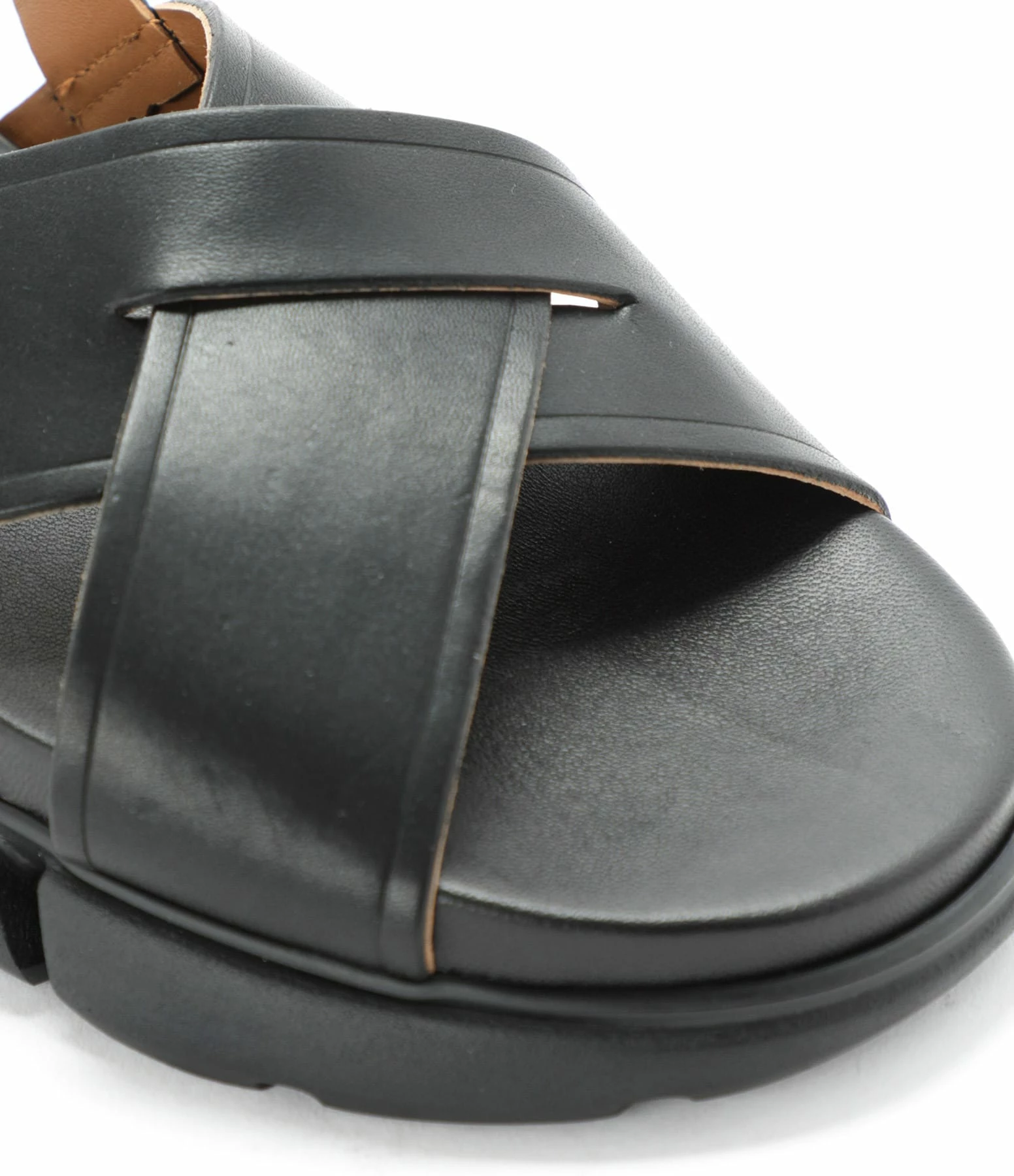 Sandales à larges semelles, deux brides croisées sur le pieds. Bouts ronds. Fermoir par boucle métallique. Semelle en cuir.