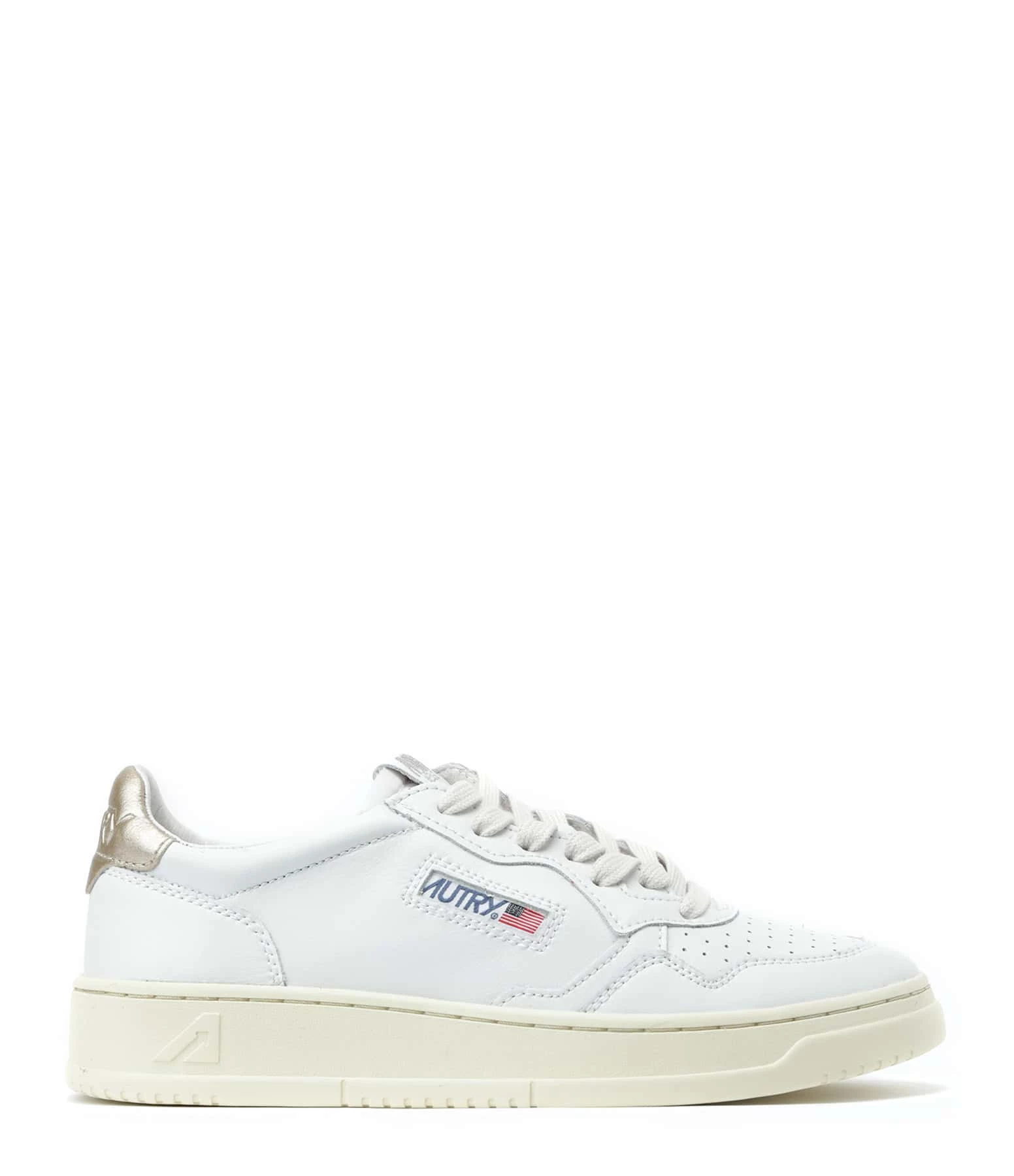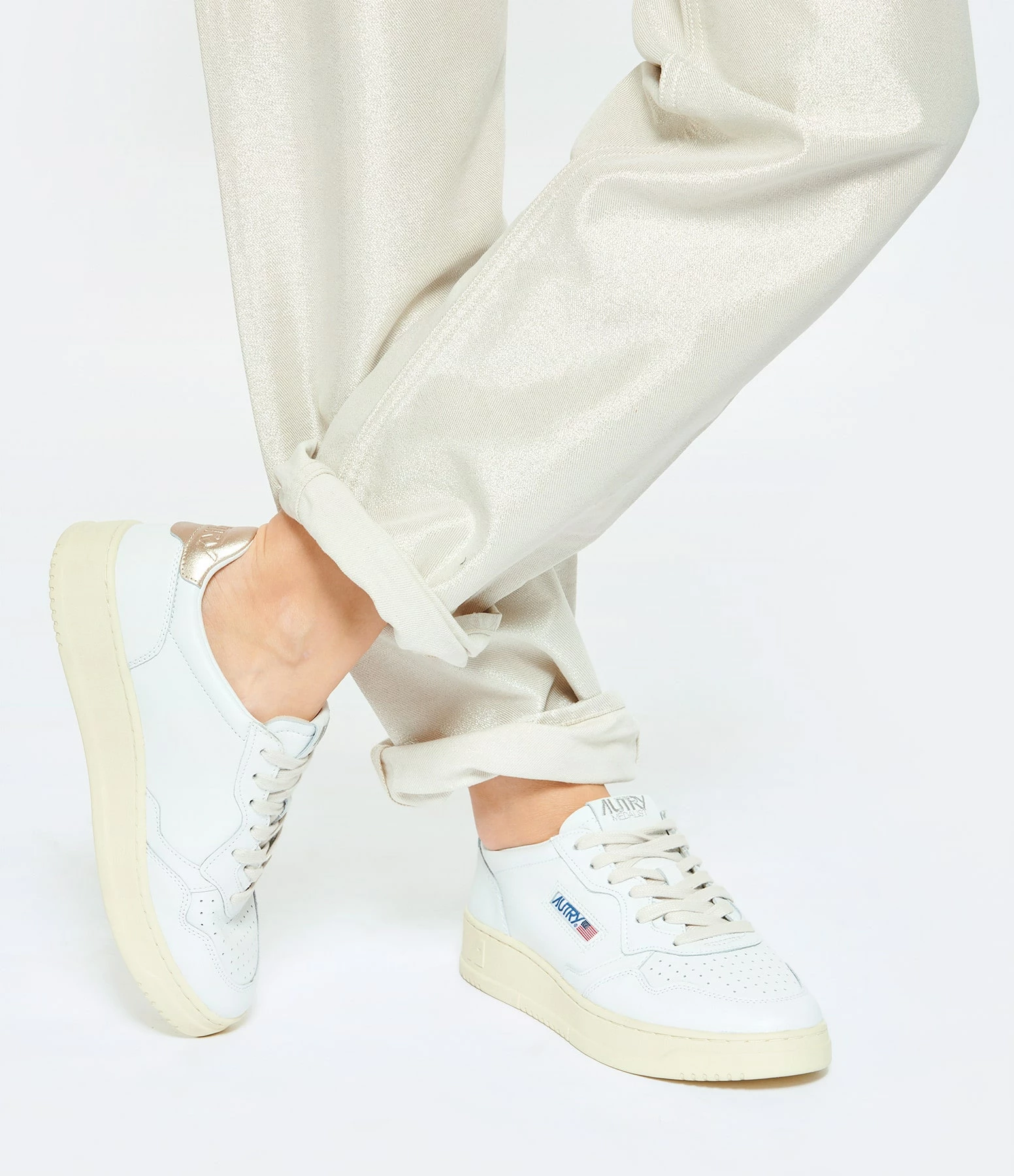 Baskets basses en cuir lisse blanc. Renfort talon en cuir doré. Lacets blancs. Logo brodé sur le côté extérieur.