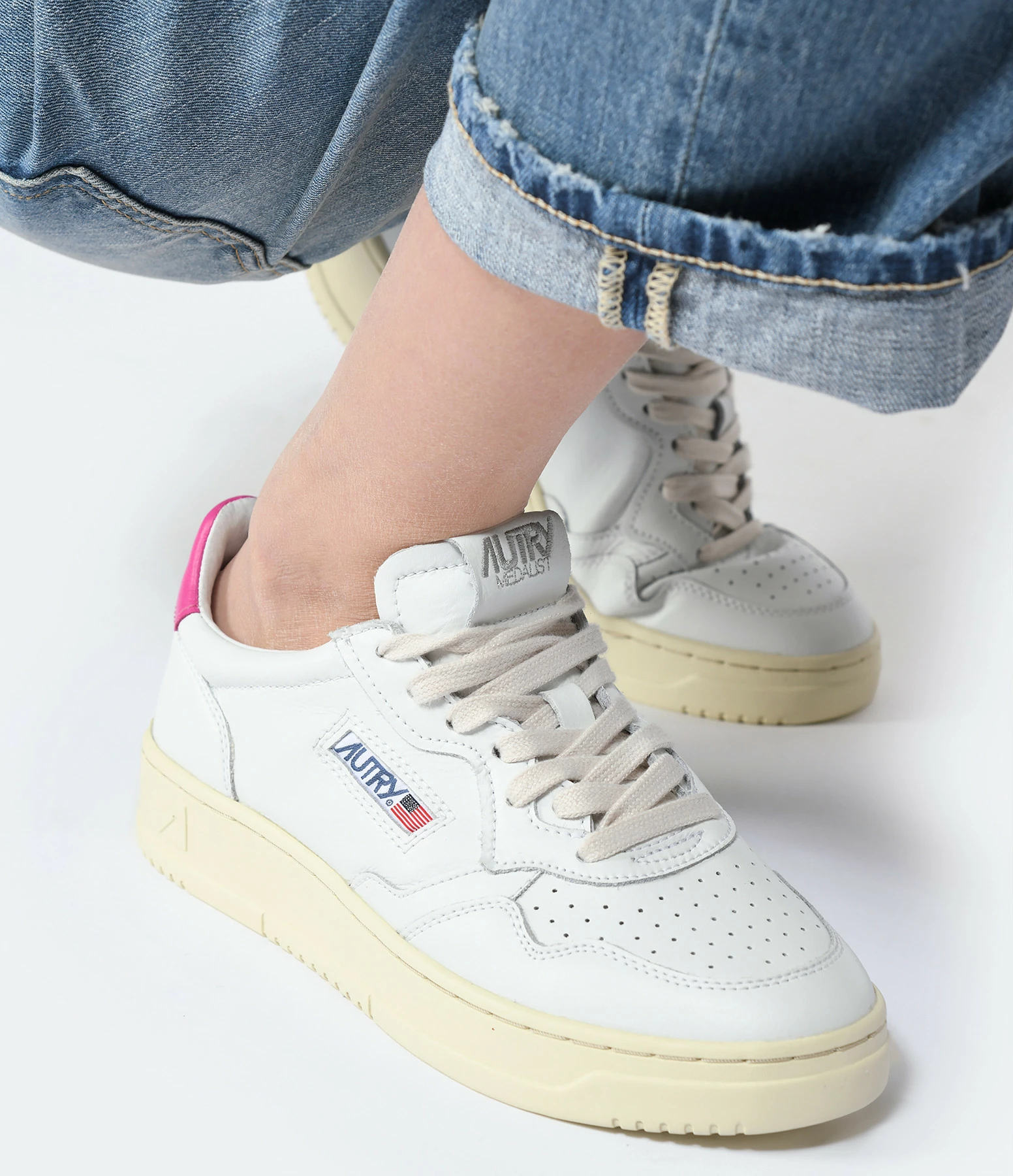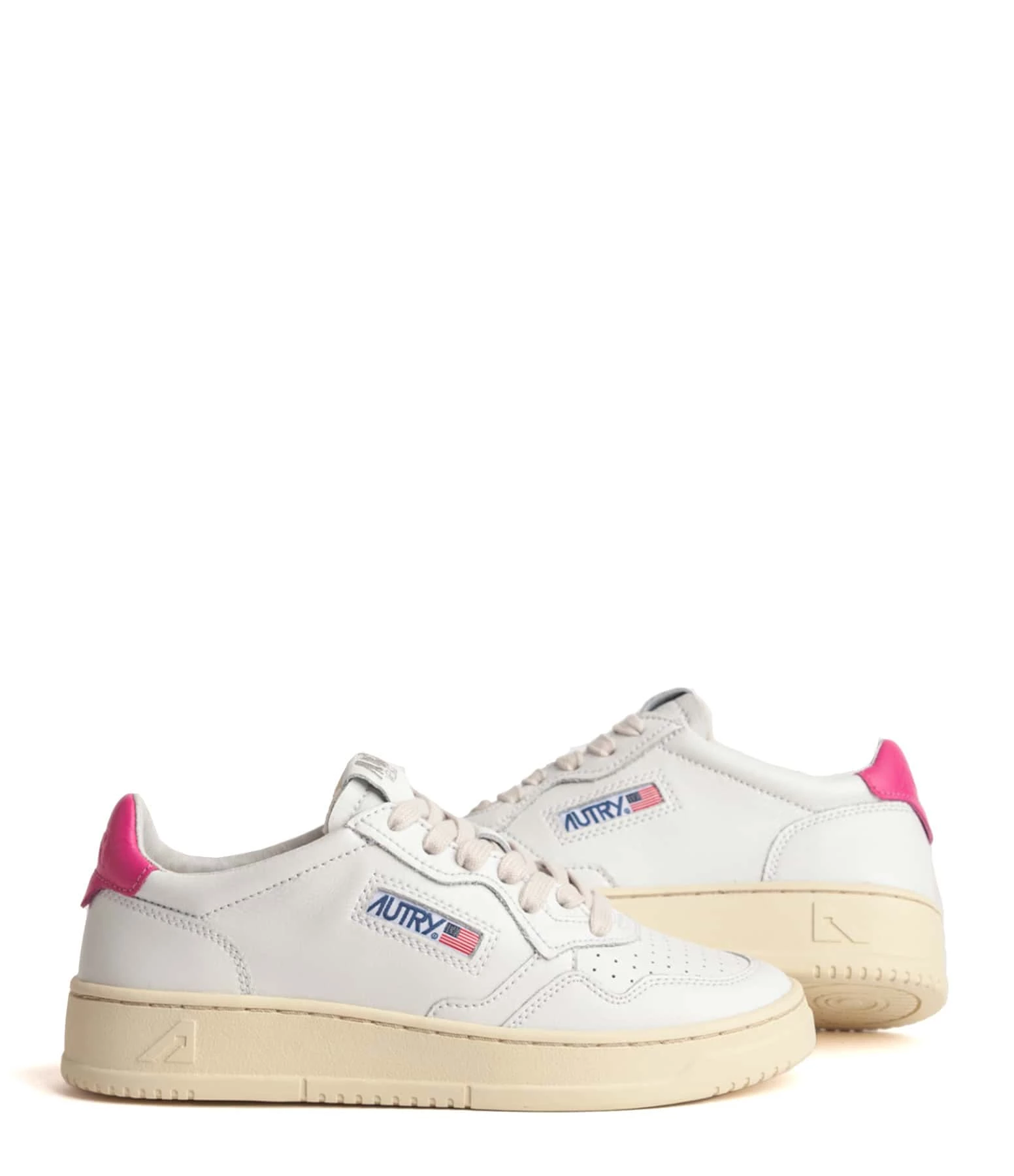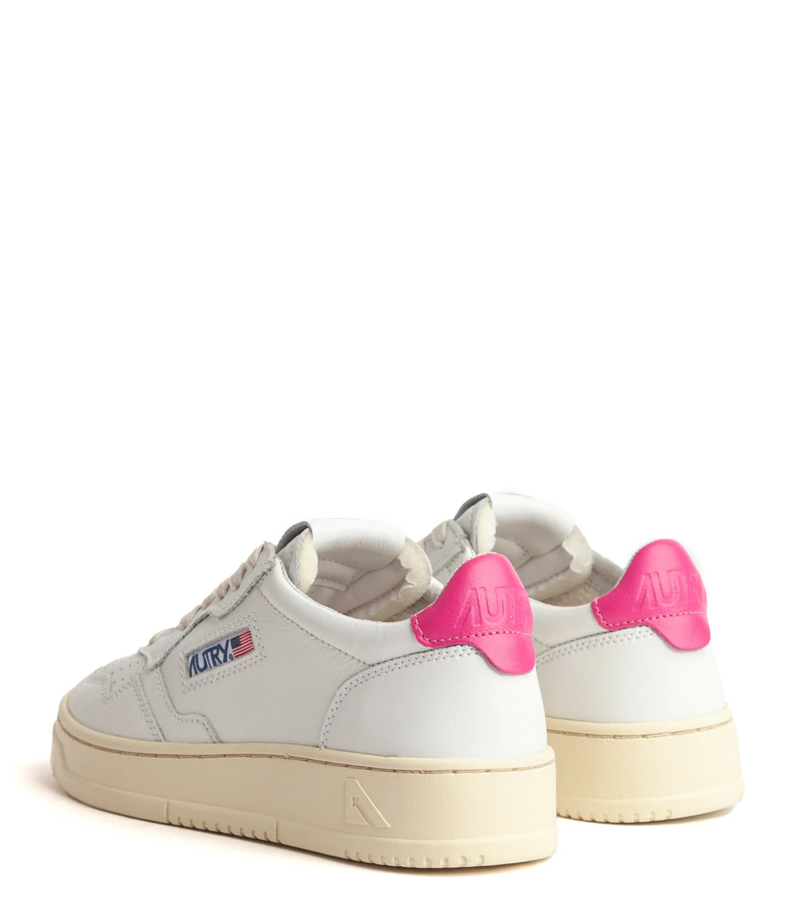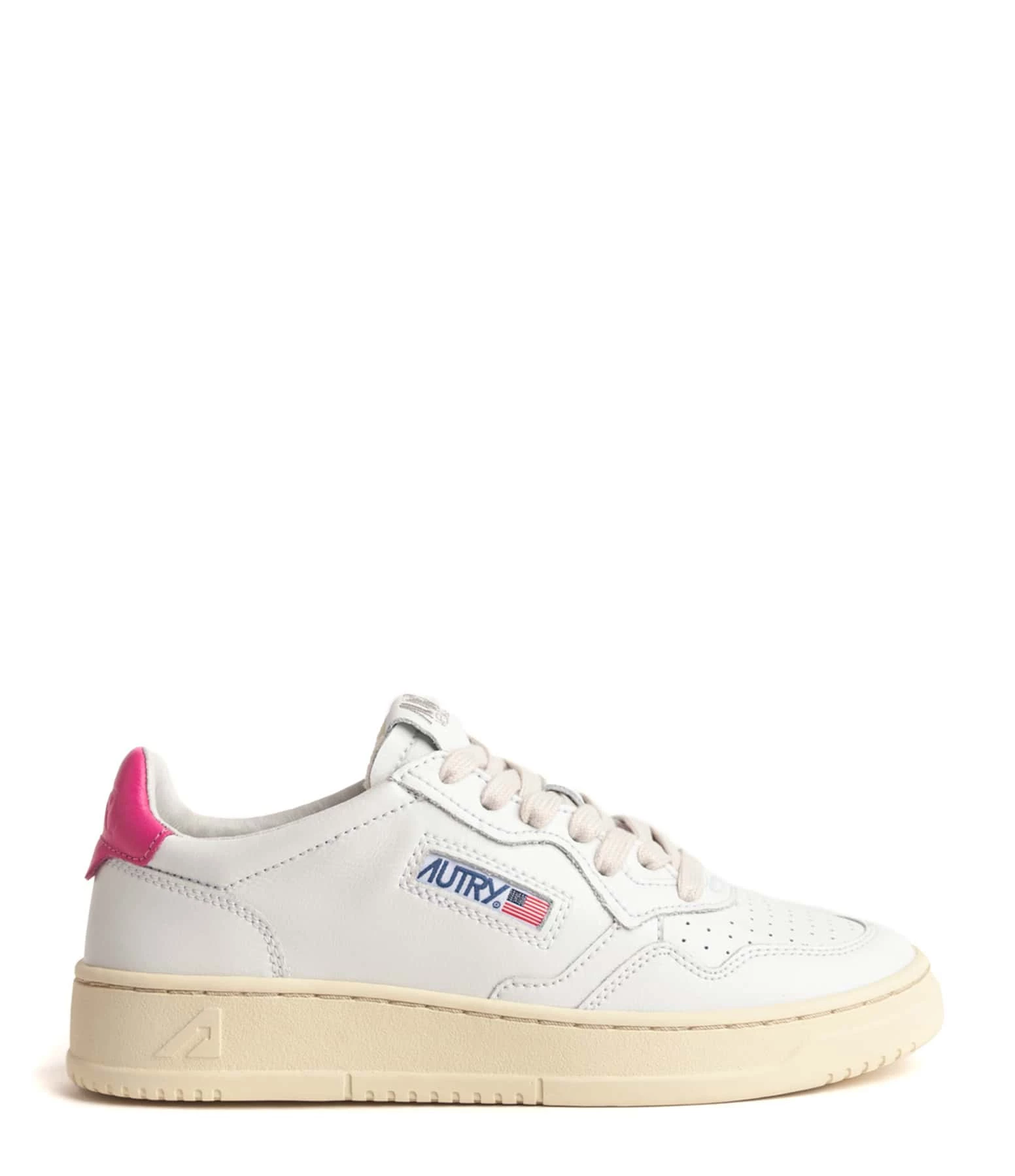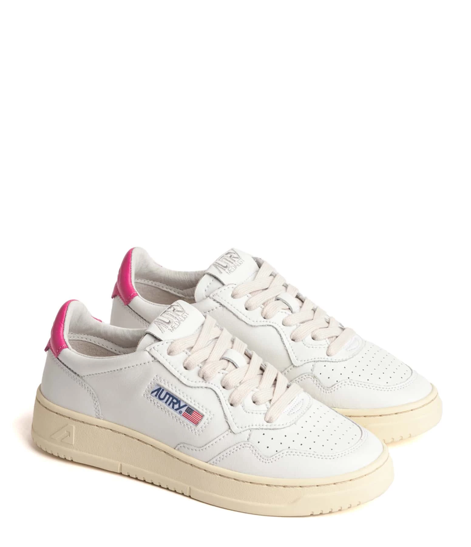 Baskets basses en cuir lisse blanc. Renfort talon en cuir rose. Lacets blancs. Logo brodé sur le côté extérieur.