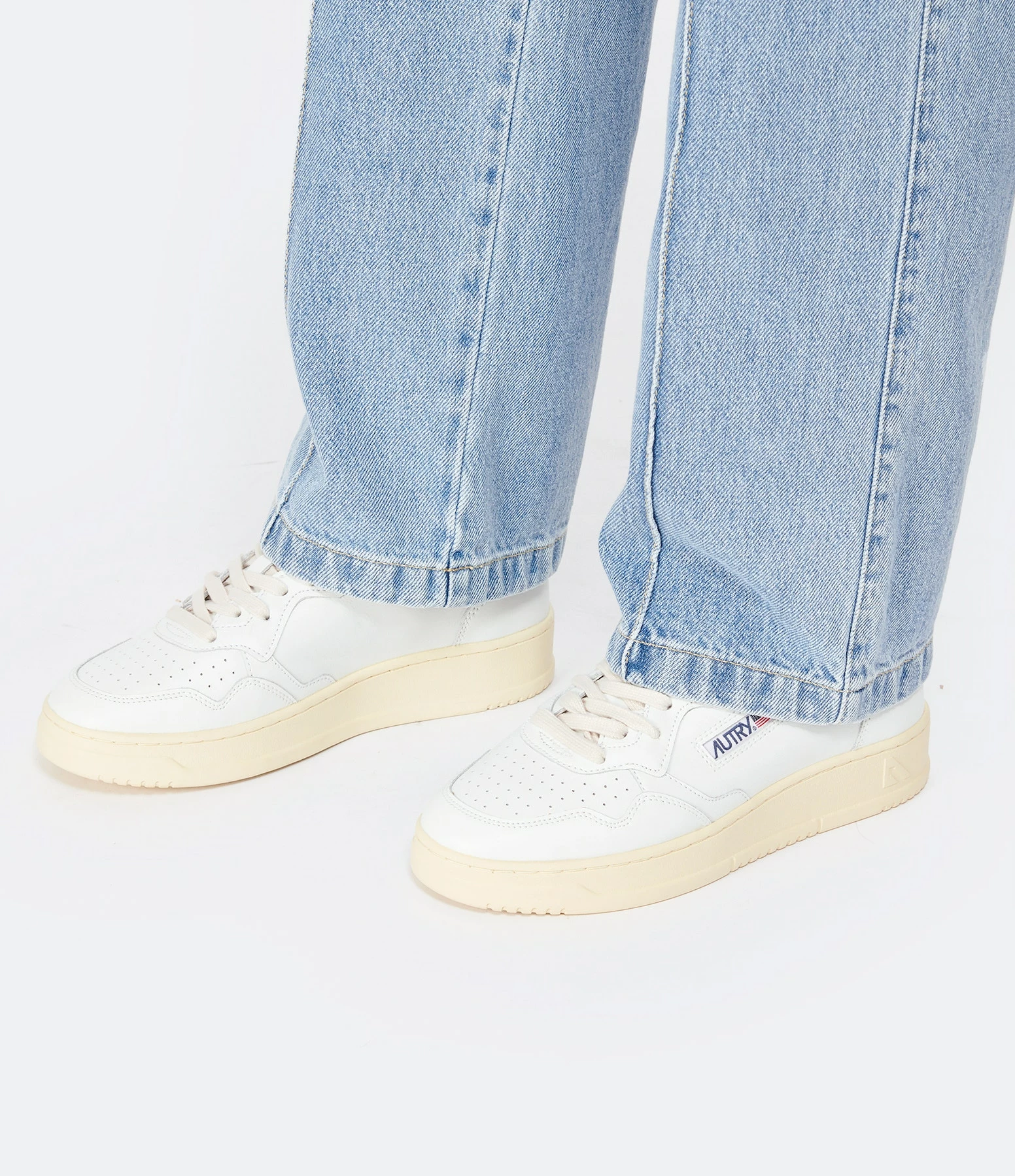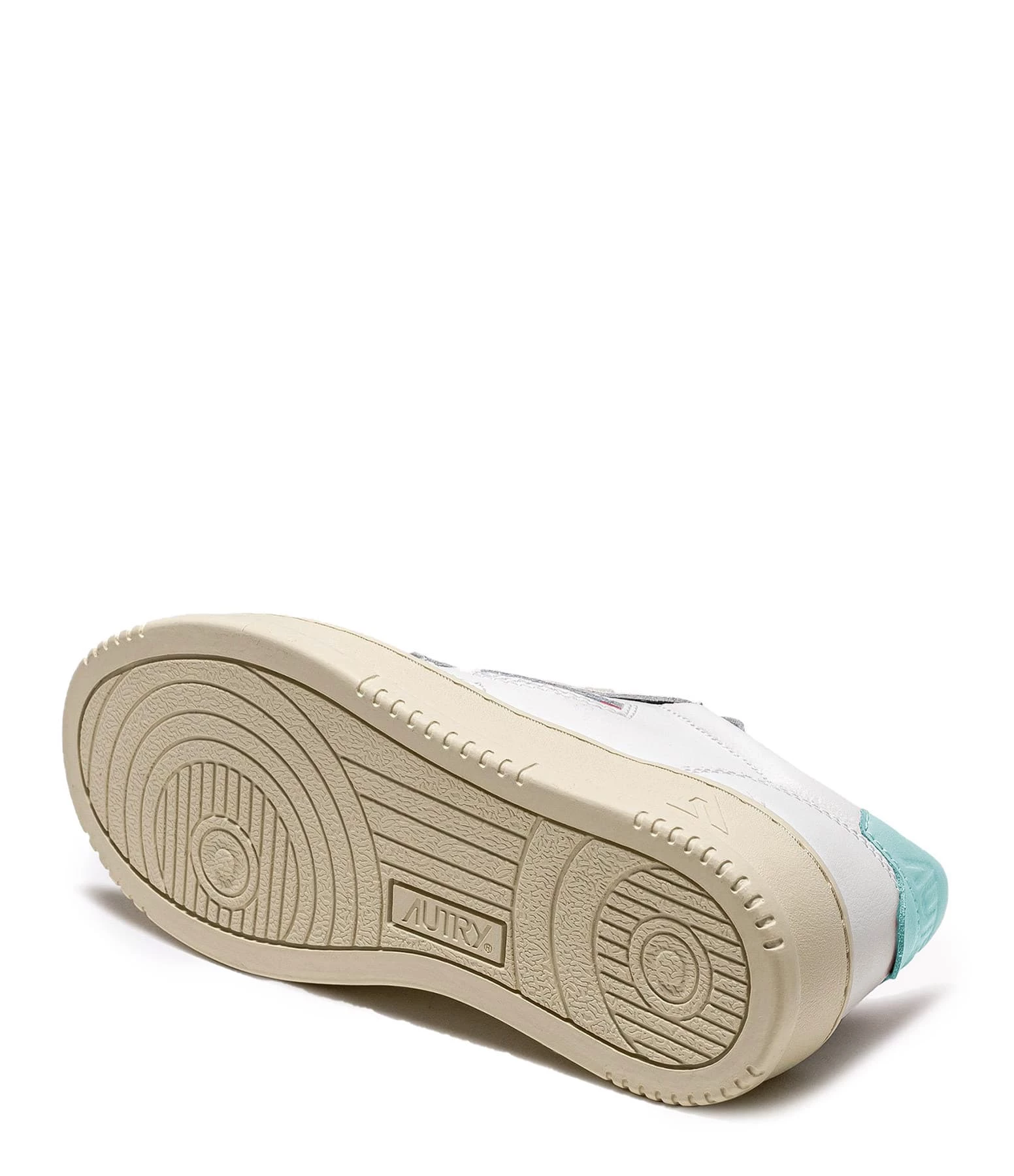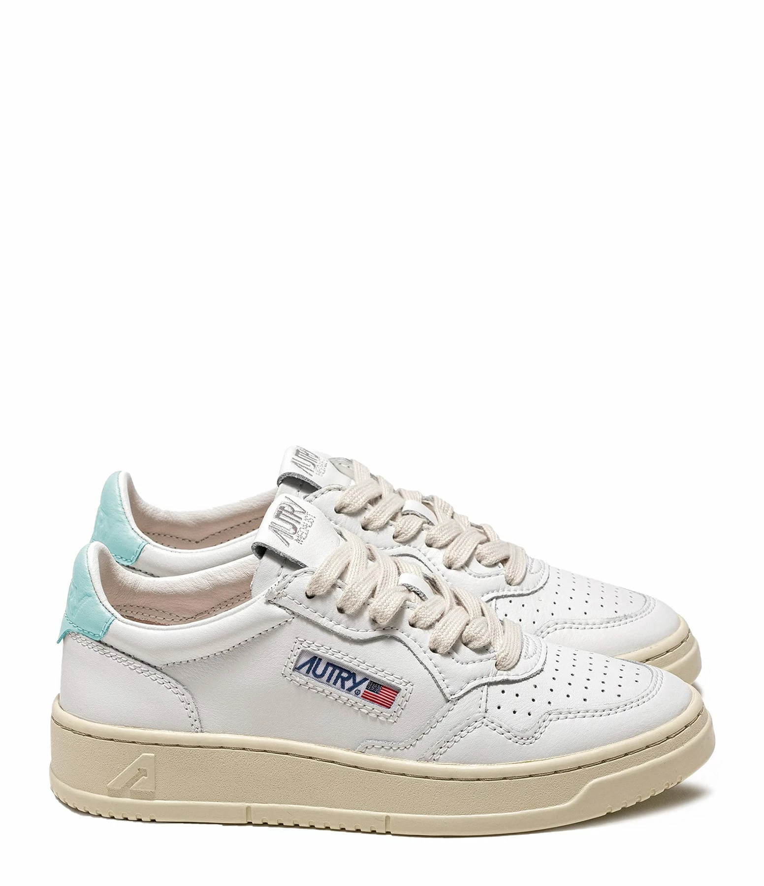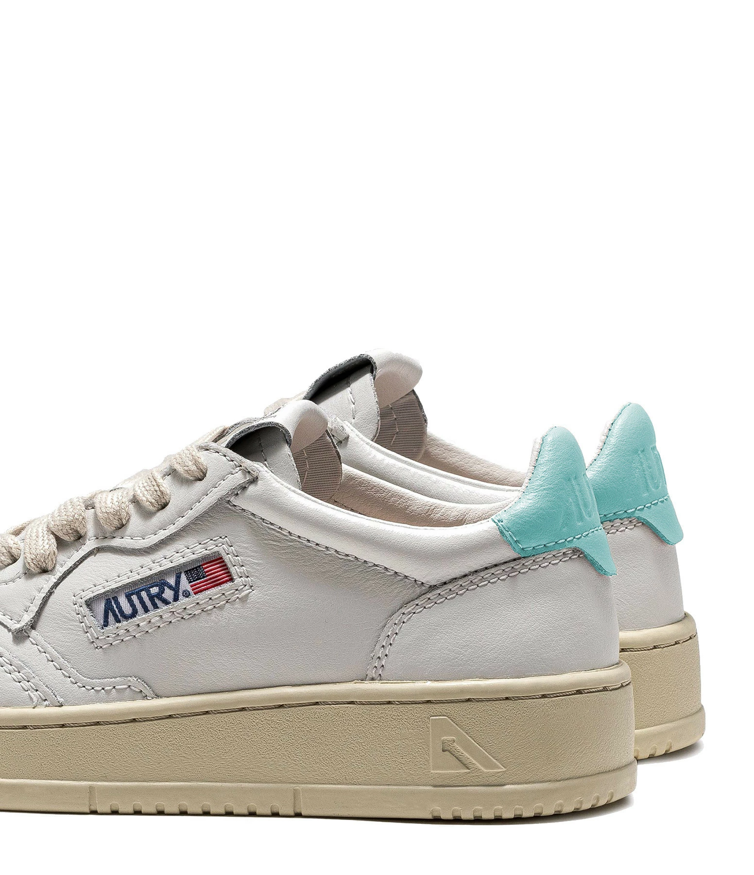 Baskets basses en cuir lisse blanc. Renfort talon en cuir turquoise. Lacets blancs. Logo brodé sur le côté extérieur.