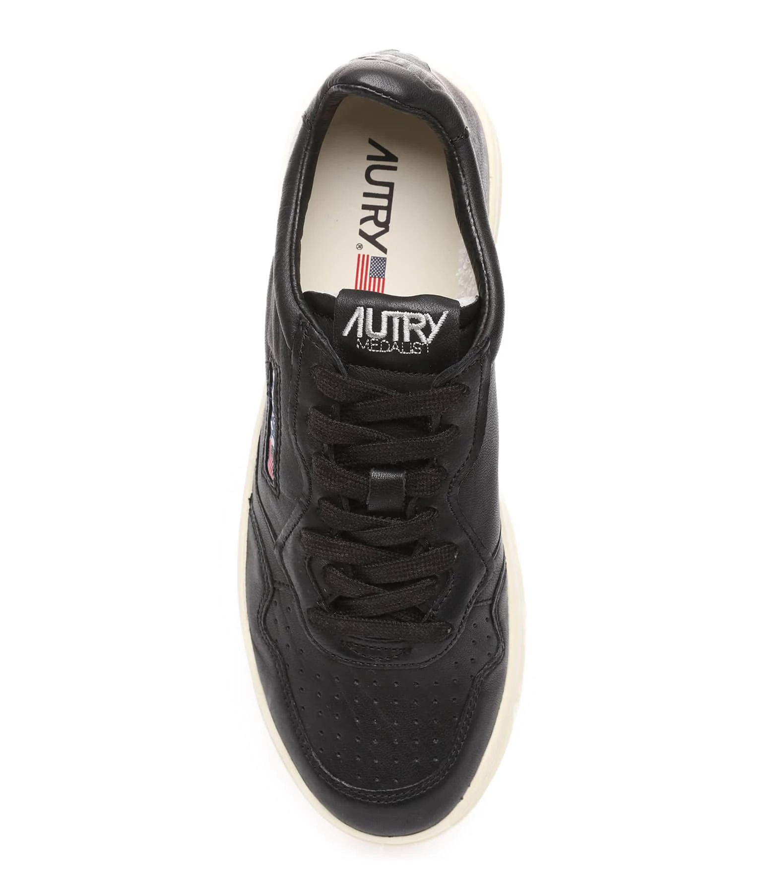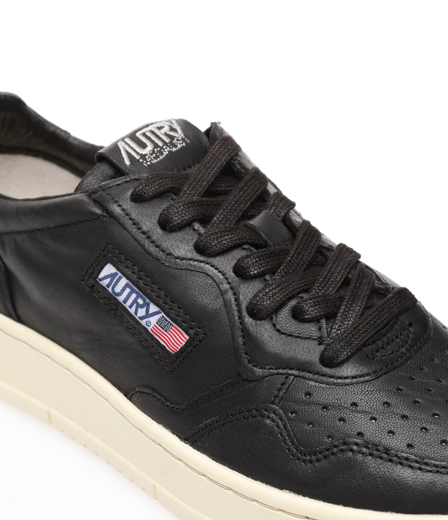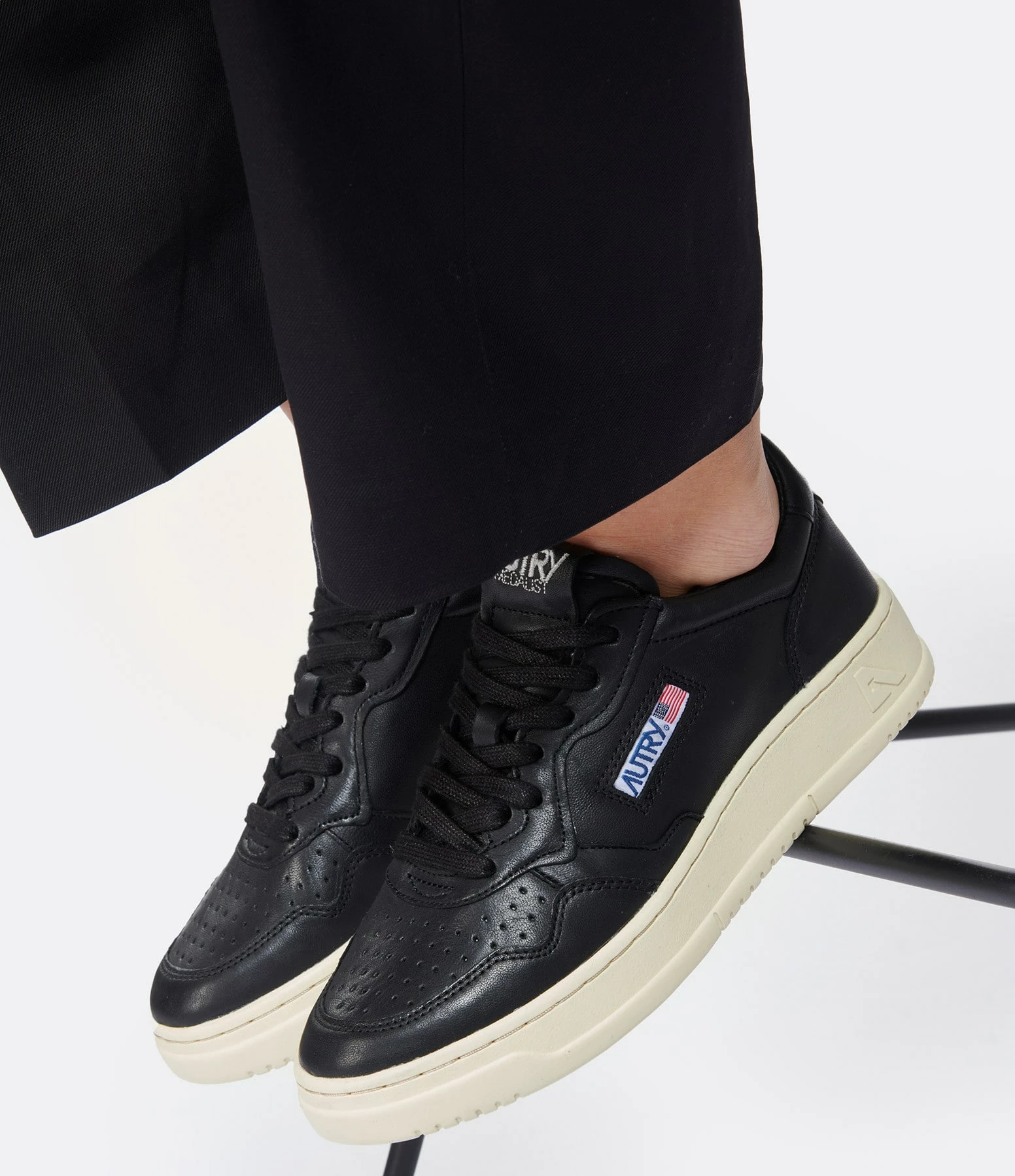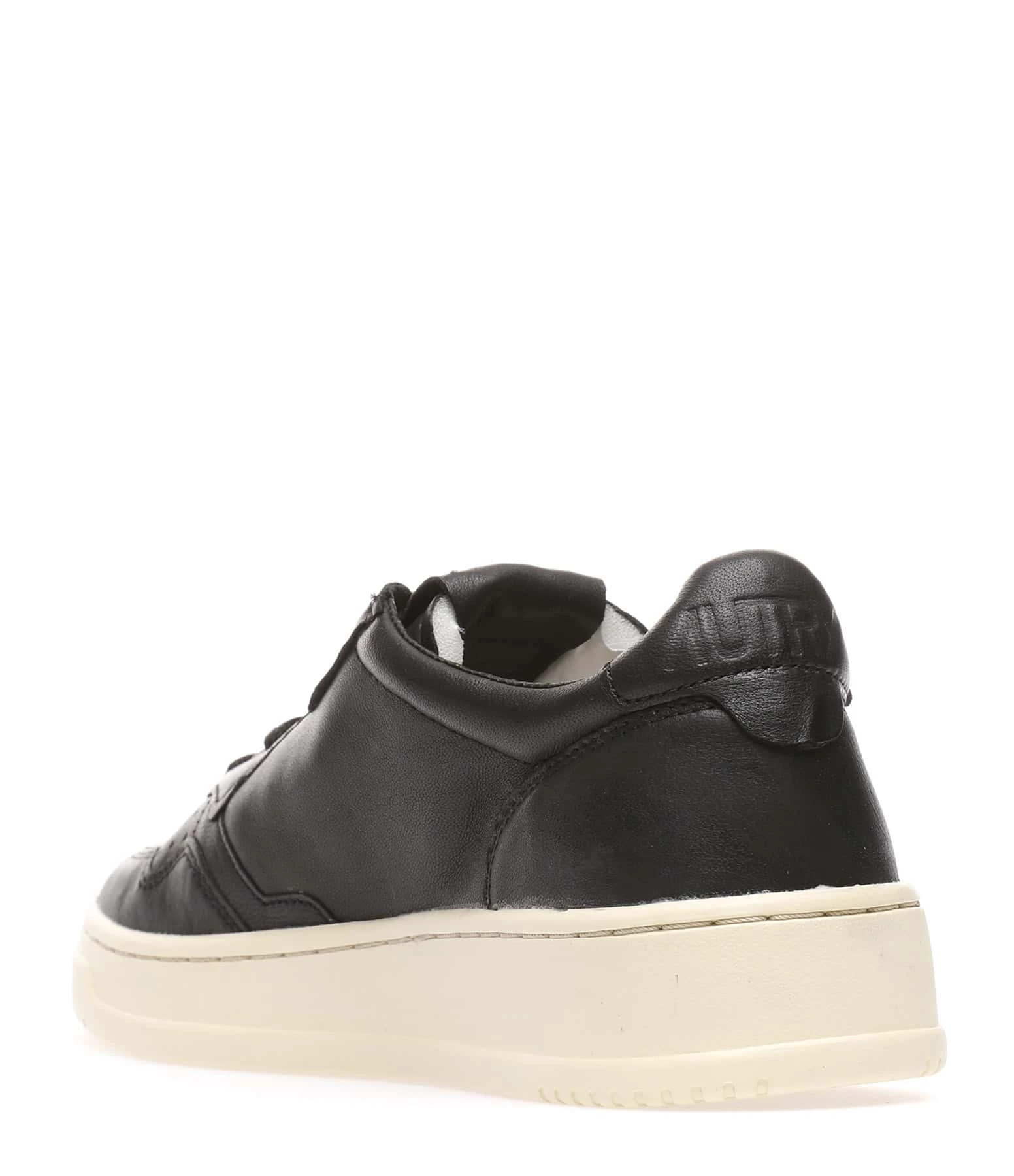 Baskets basses en cuir lisse noir. Logo brodé sur le côté extérieur. Renfort talon en cuir noir. Semelle jaunie volontairement.
