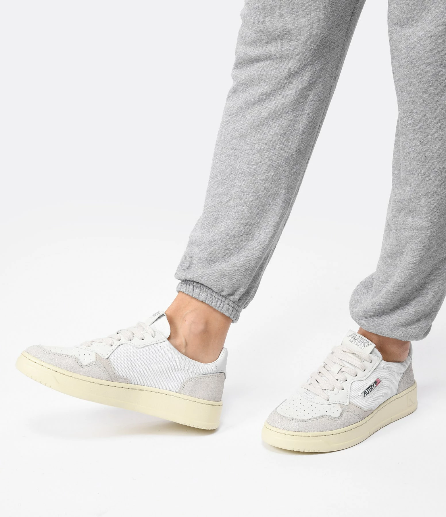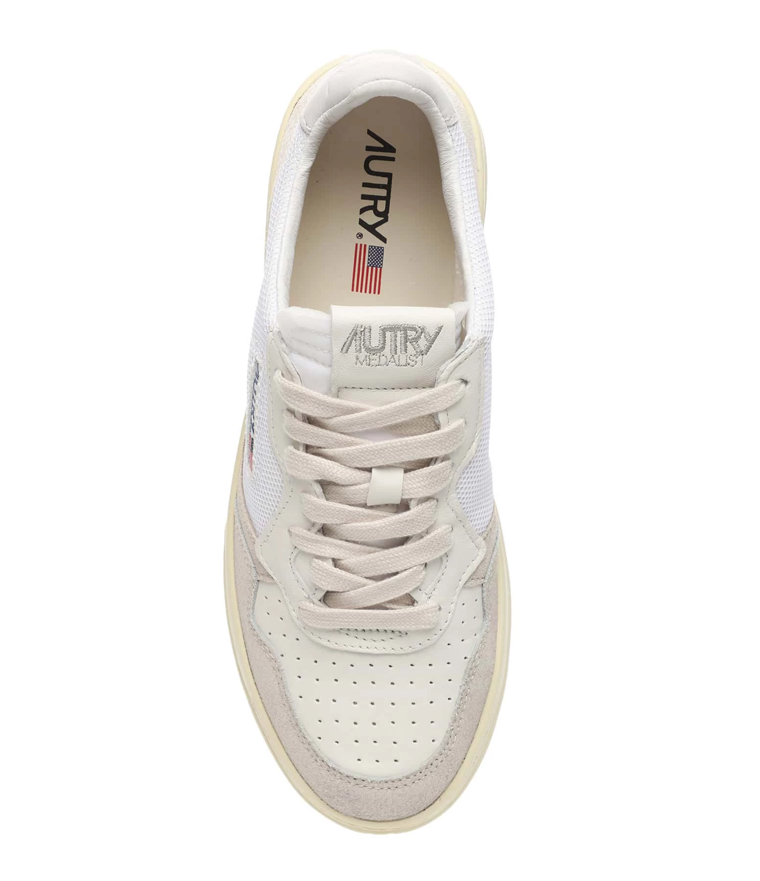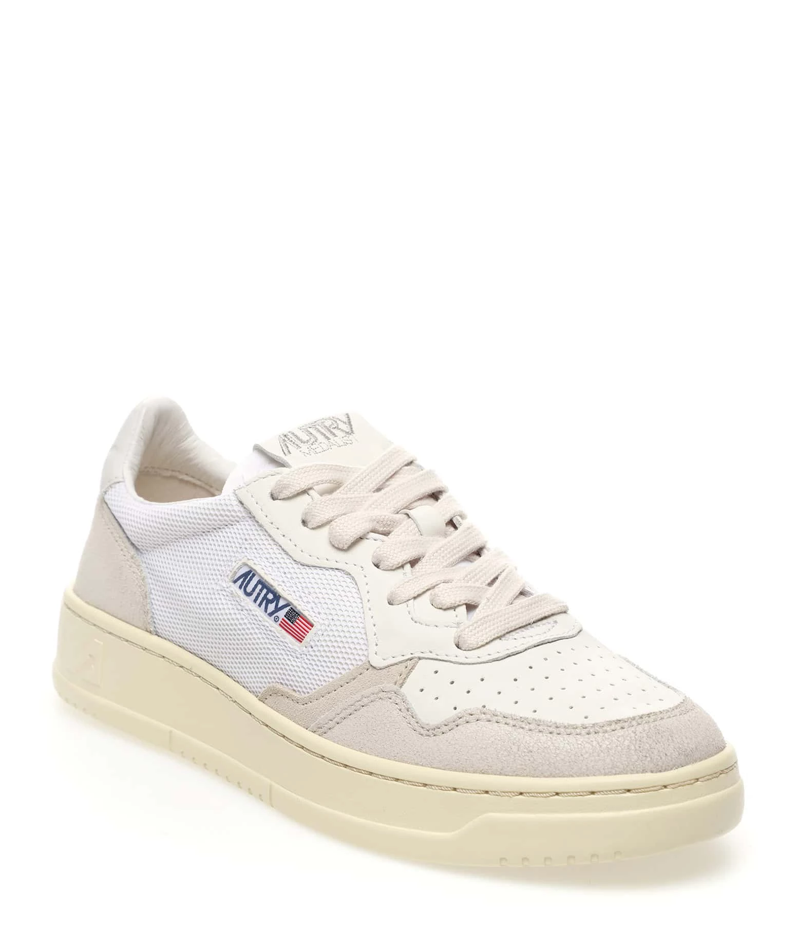 Baskets basses en cuir multi matière et tissu blanc avec empiècements en cuir suédé beige. Lacets beiges. Logo brodé sur le côté extérieur.