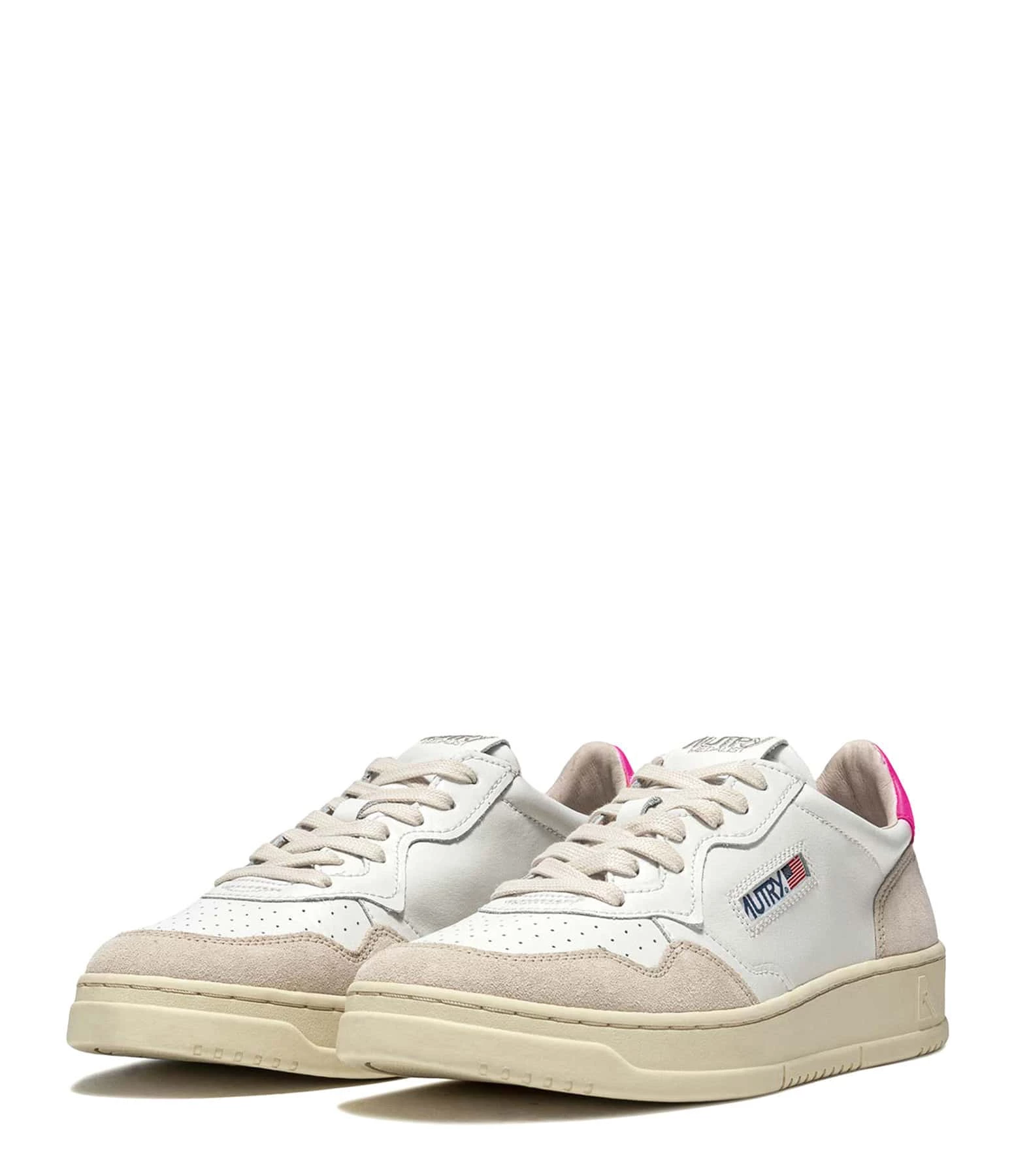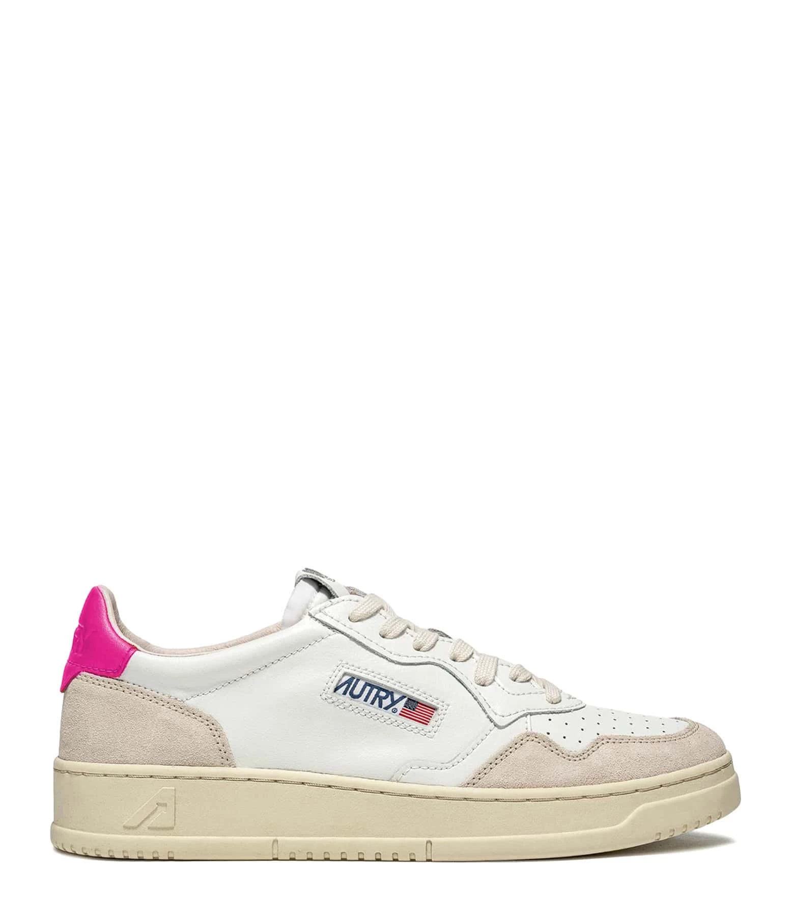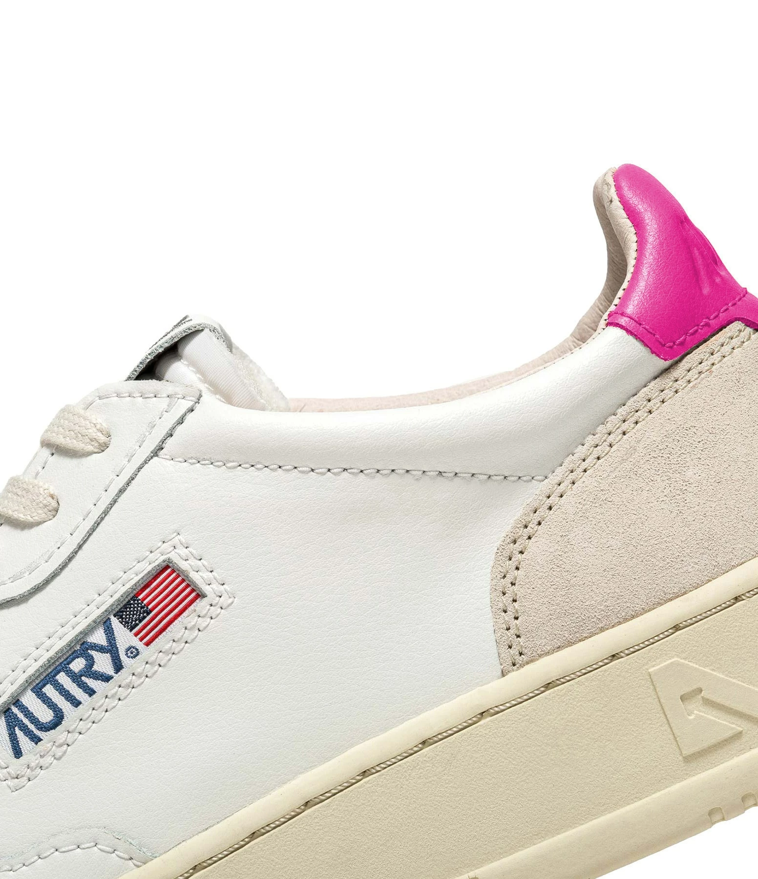 Baskets basses en cuir lisse blanc avec empiècements en cuir suédé beige et renfort talon en cuir rose. Lacets blancs. Logo brodé sur le côté extérieur.