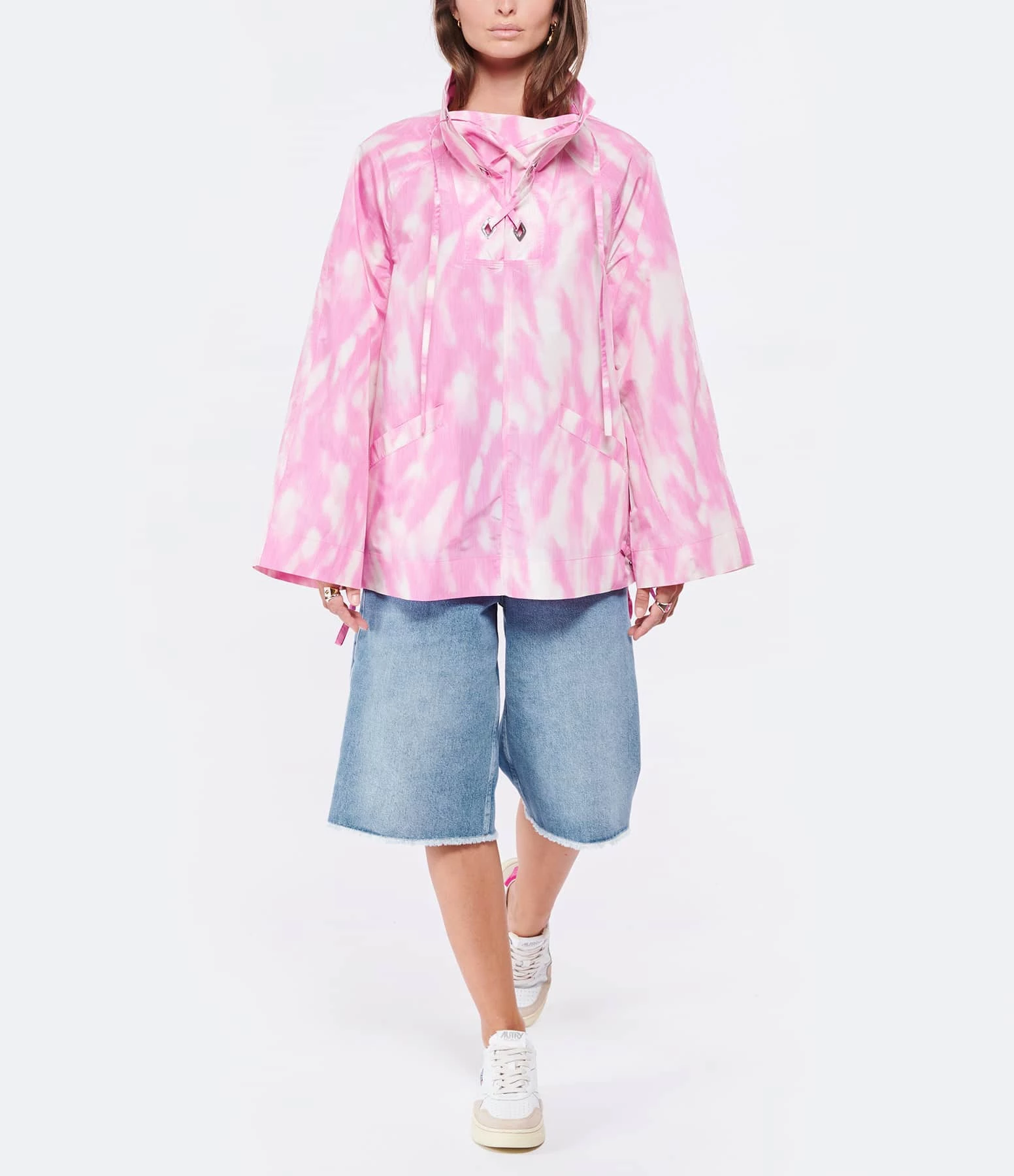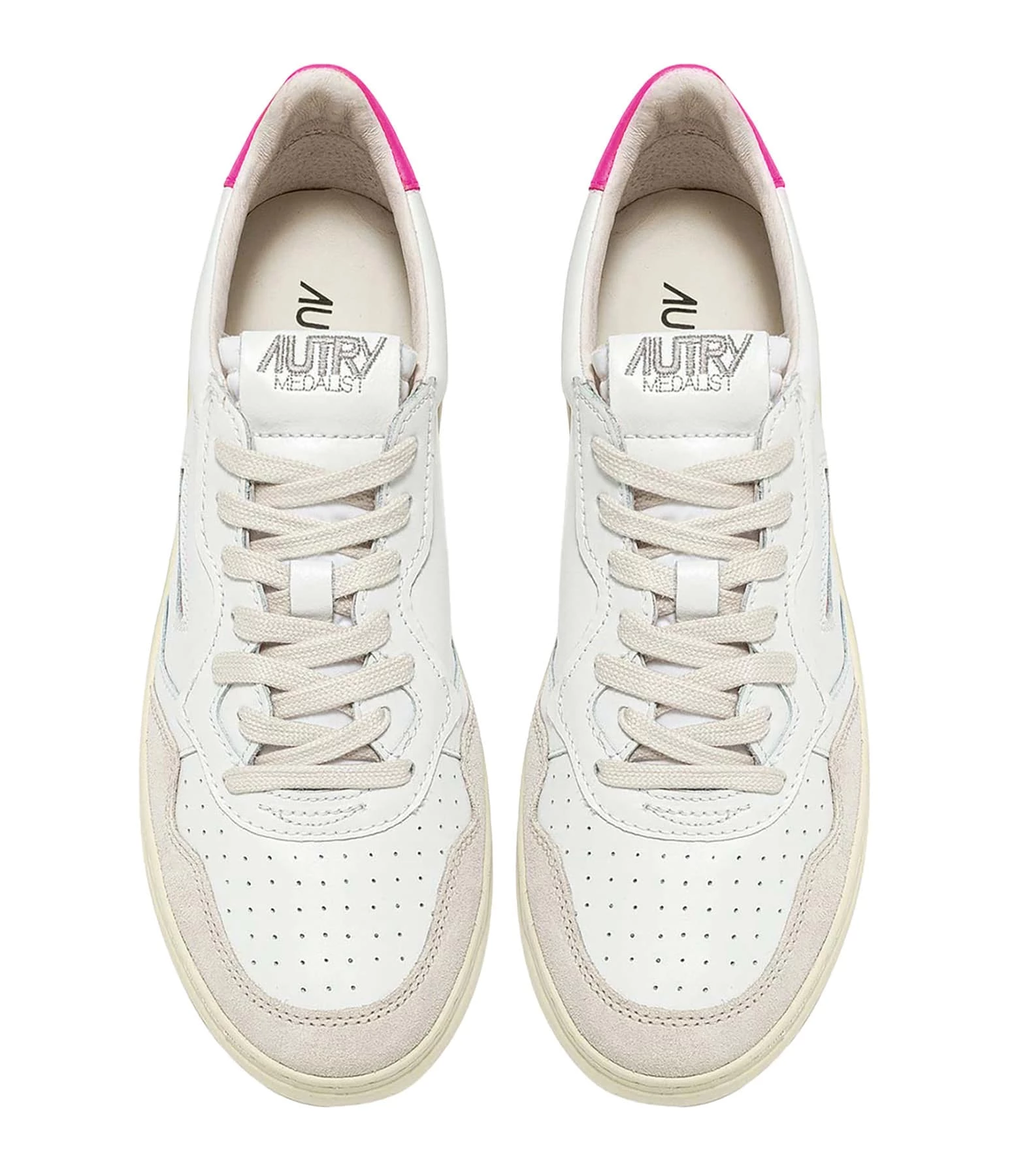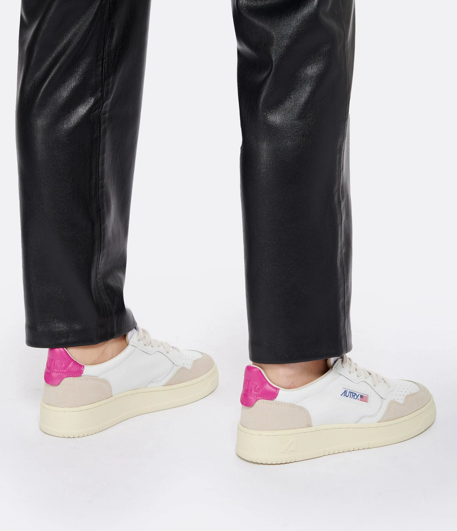 Baskets basses en cuir lisse blanc avec empiècements en cuir suédé beige et renfort talon en cuir rose. Lacets blancs. Logo brodé sur le côté extérieur.