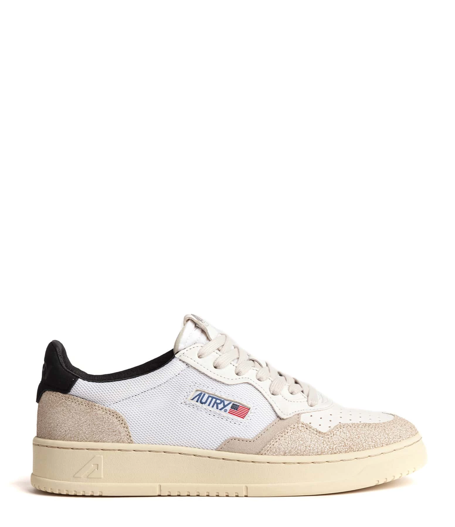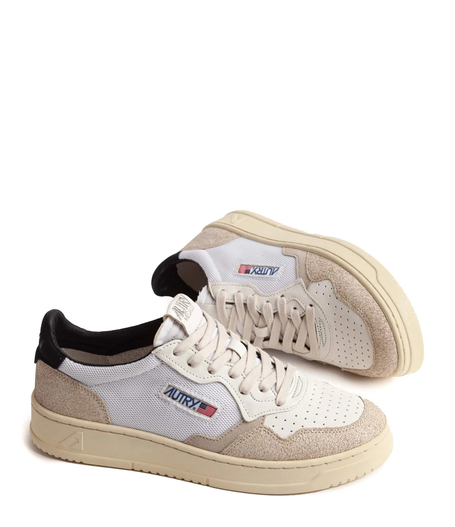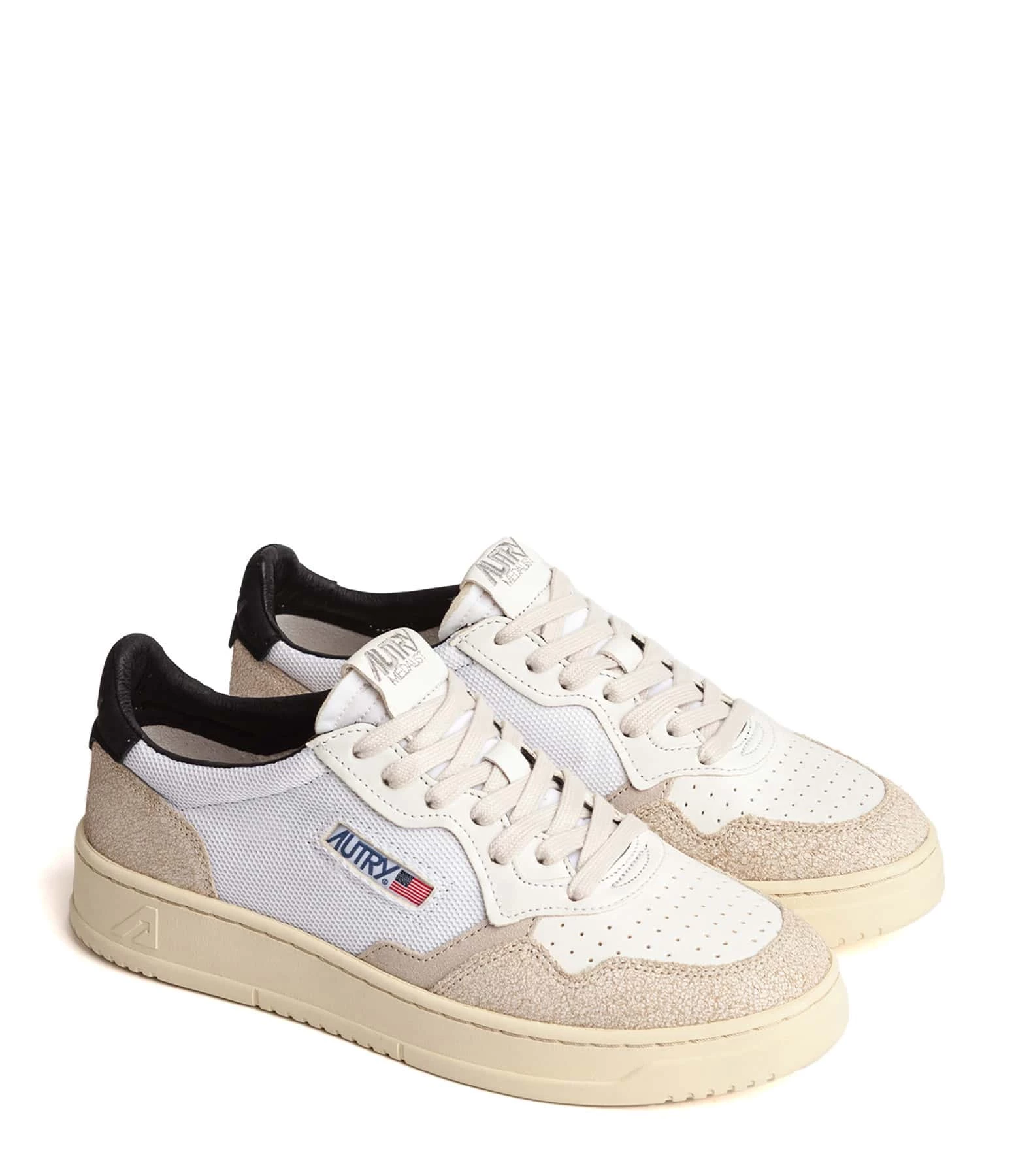 Baskets basses en cuir multi matière et tissu blanc avec empiècements en cuir suédé beige. Renfort talon en cuir suédé noir. Lacets beiges. Logo brodé sur le côté extérieur.