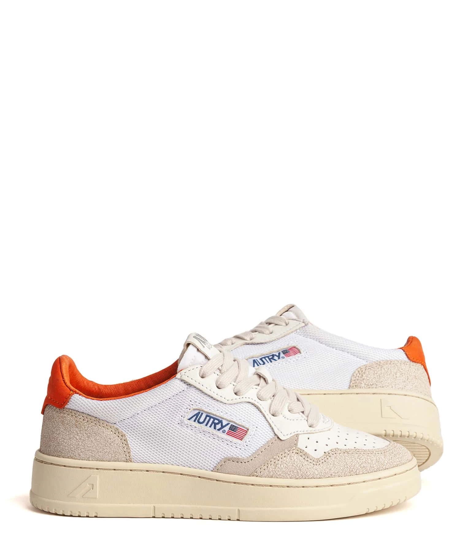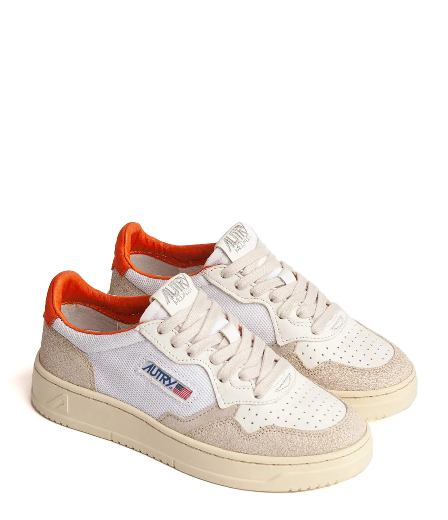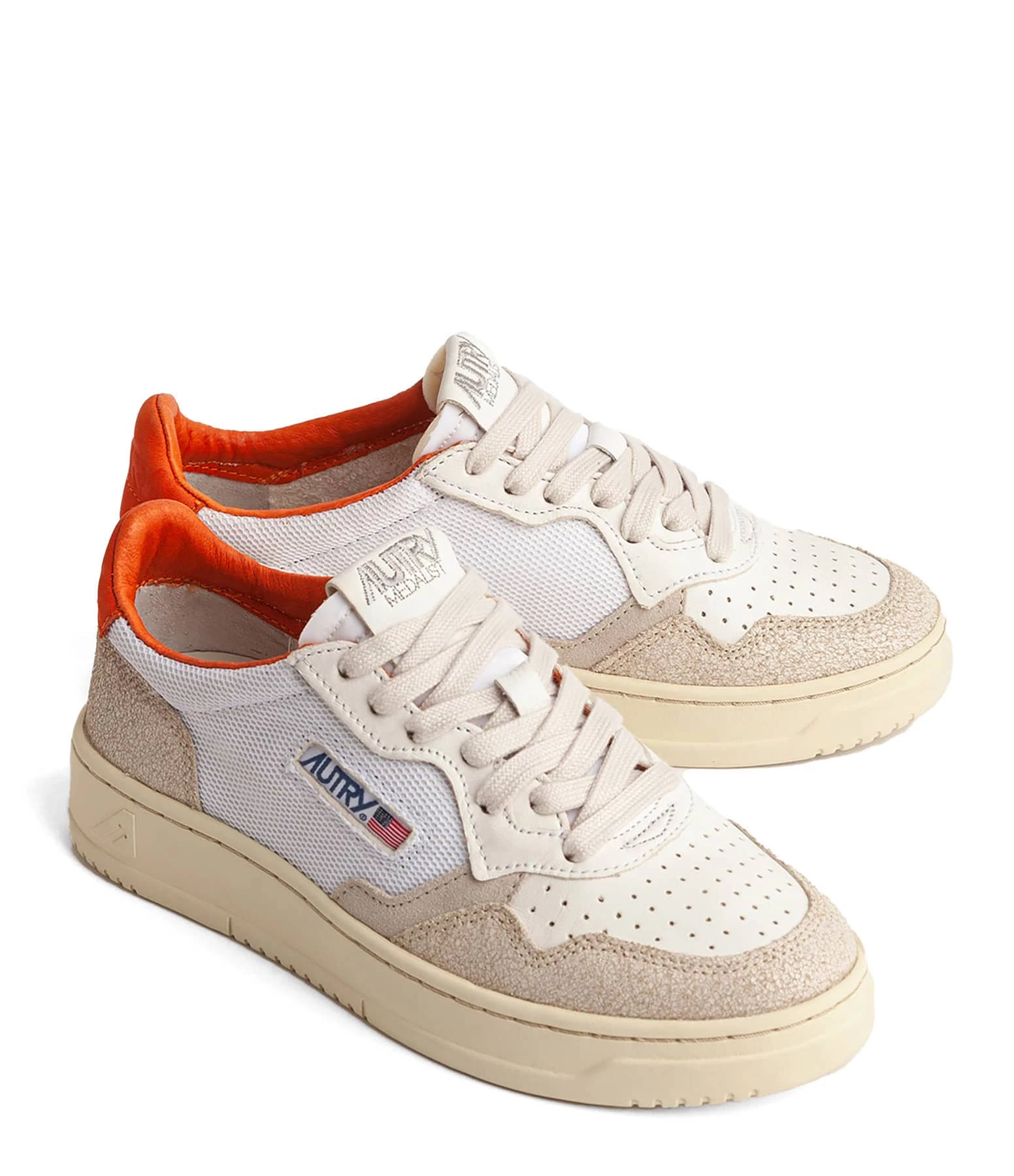 Baskets basses en cuir multi matière et tissu blanc avec empiècements en cuir suédé beige. Renfort talon en cuir suédé orange. Lacets beiges. Logo brodé sur le côté extérieur.