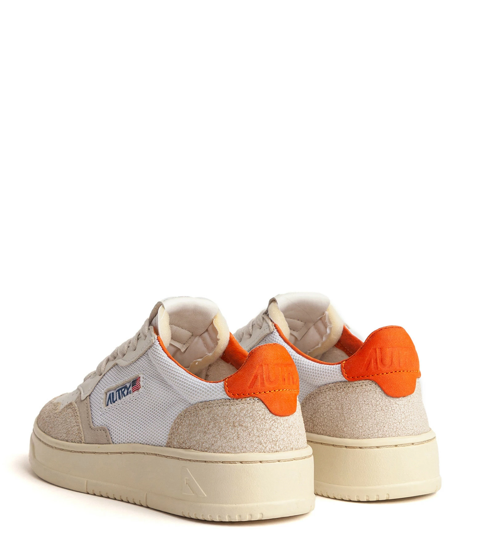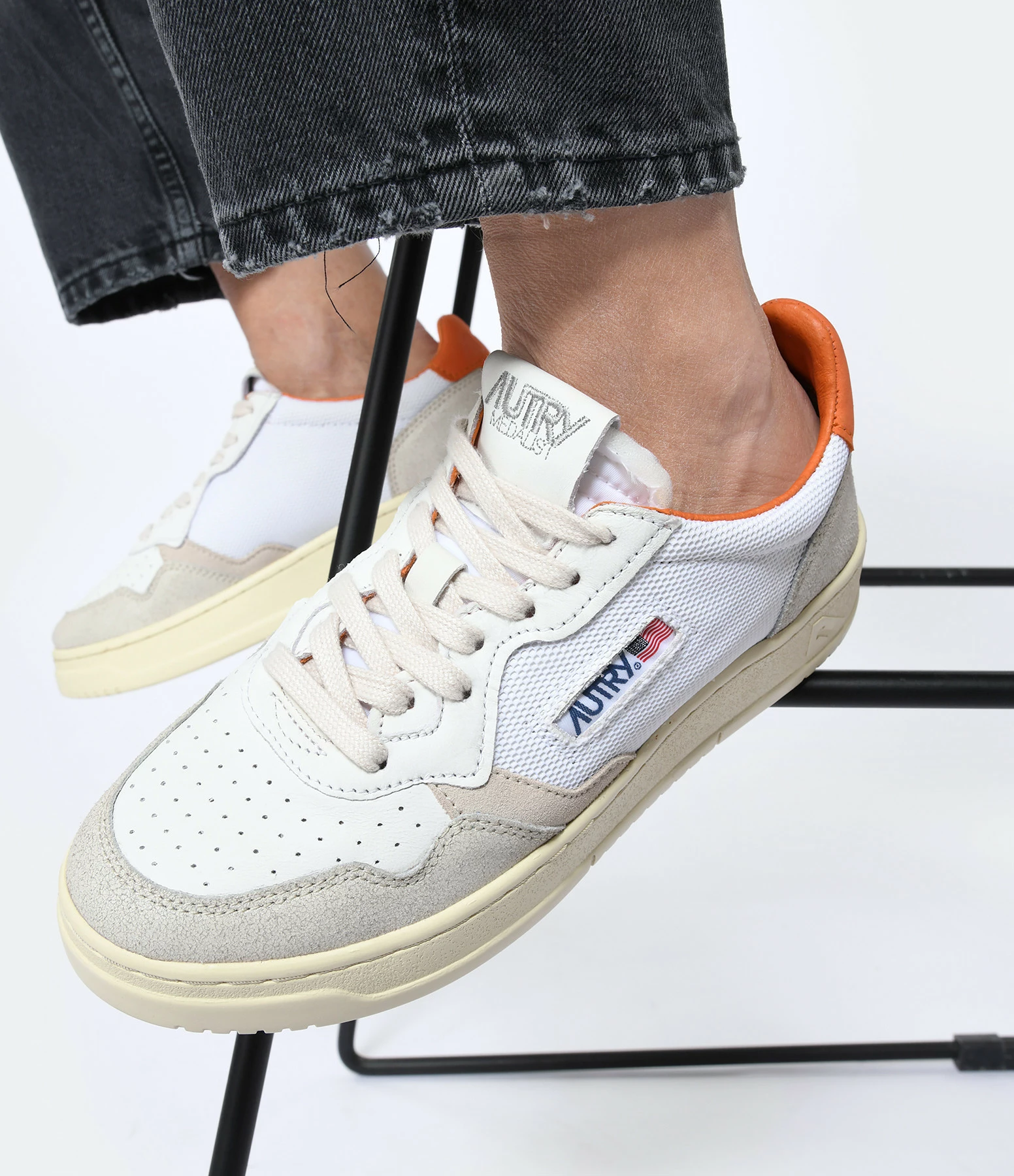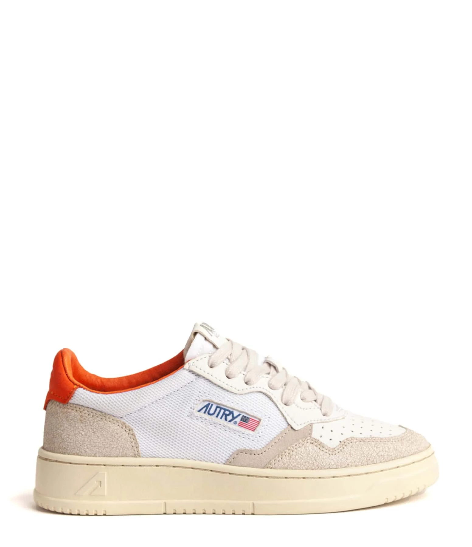 Baskets basses en cuir multi matière et tissu blanc avec empiècements en cuir suédé beige. Renfort talon en cuir suédé orange. Lacets beiges. Logo brodé sur le côté extérieur.