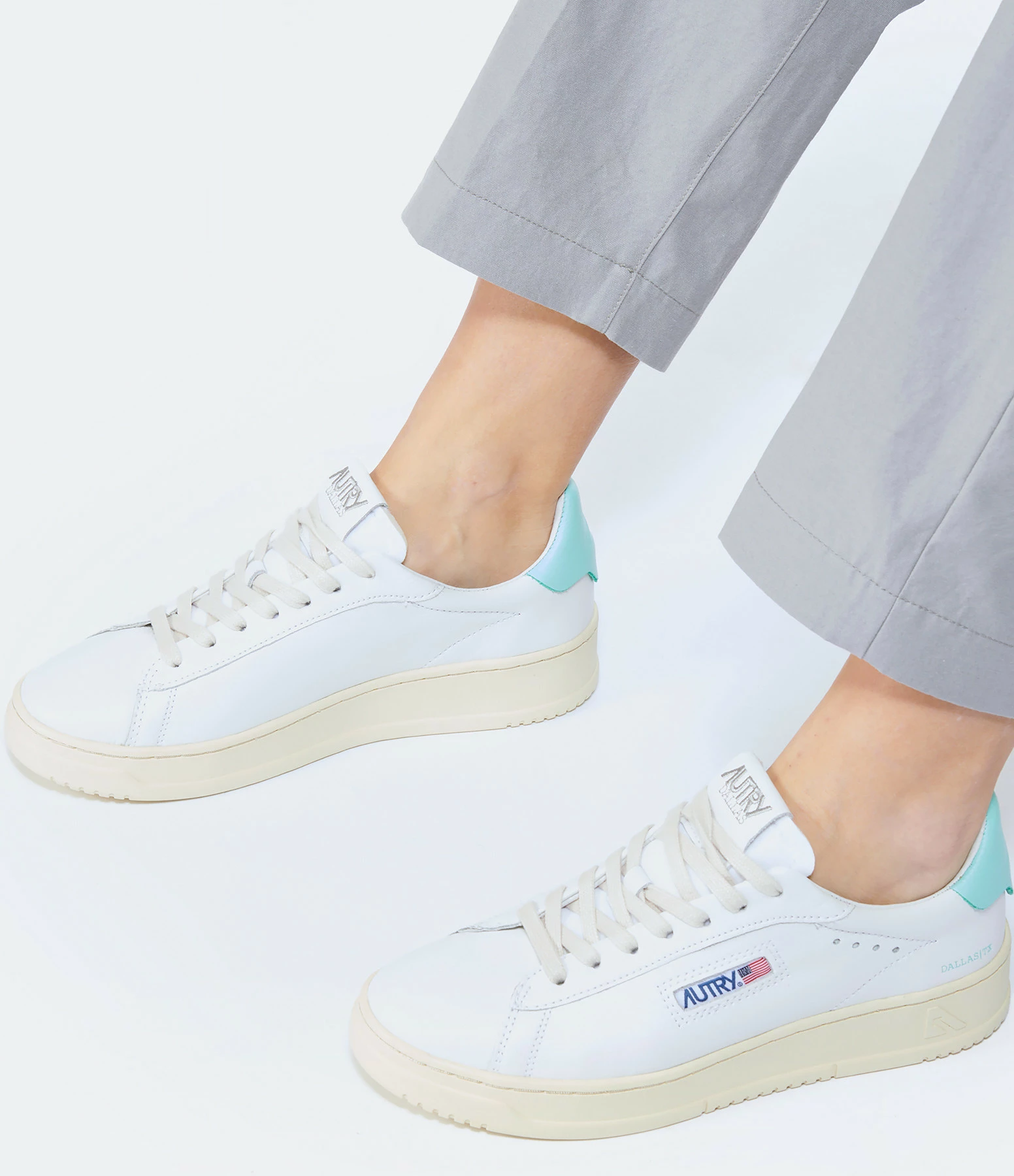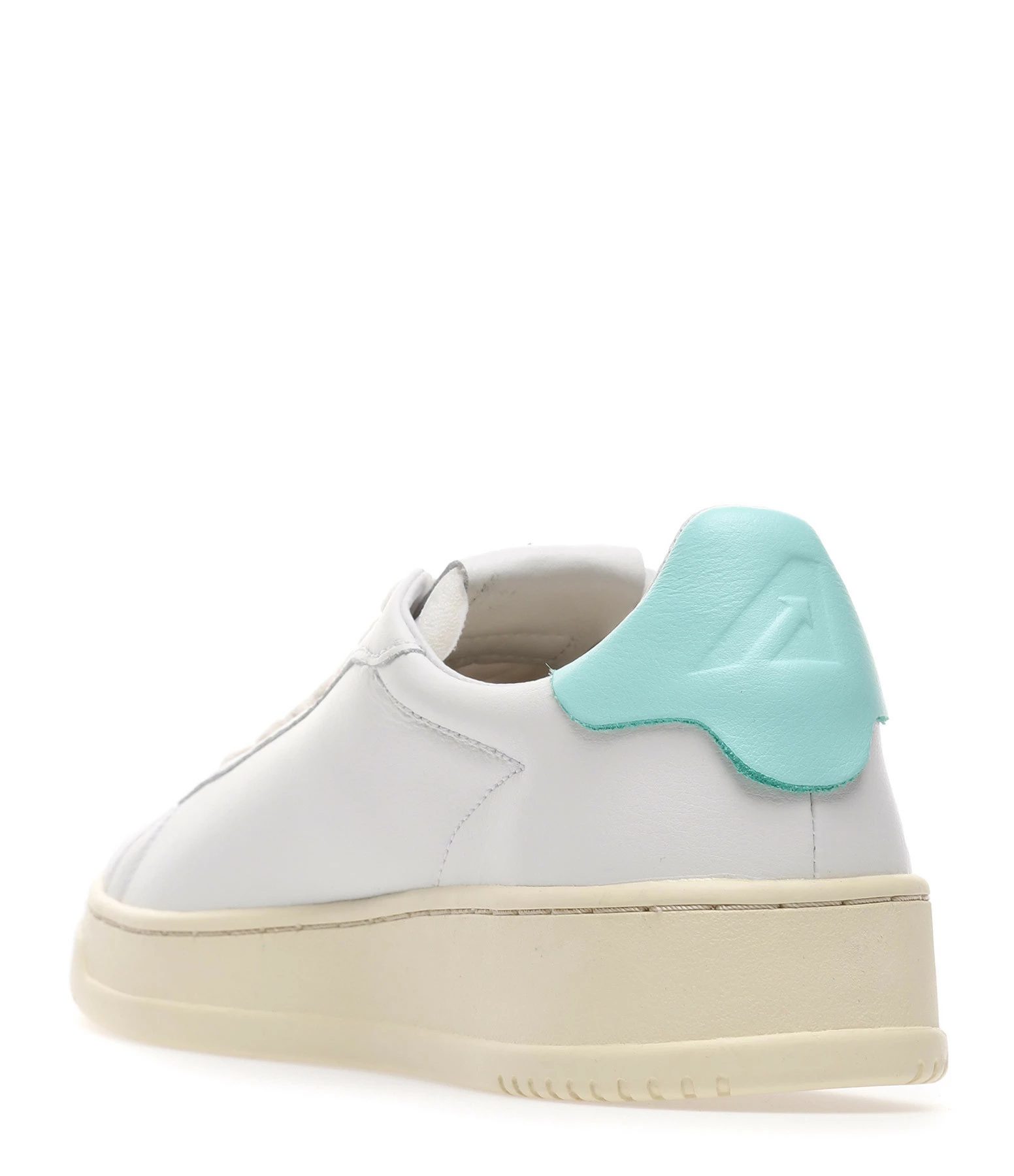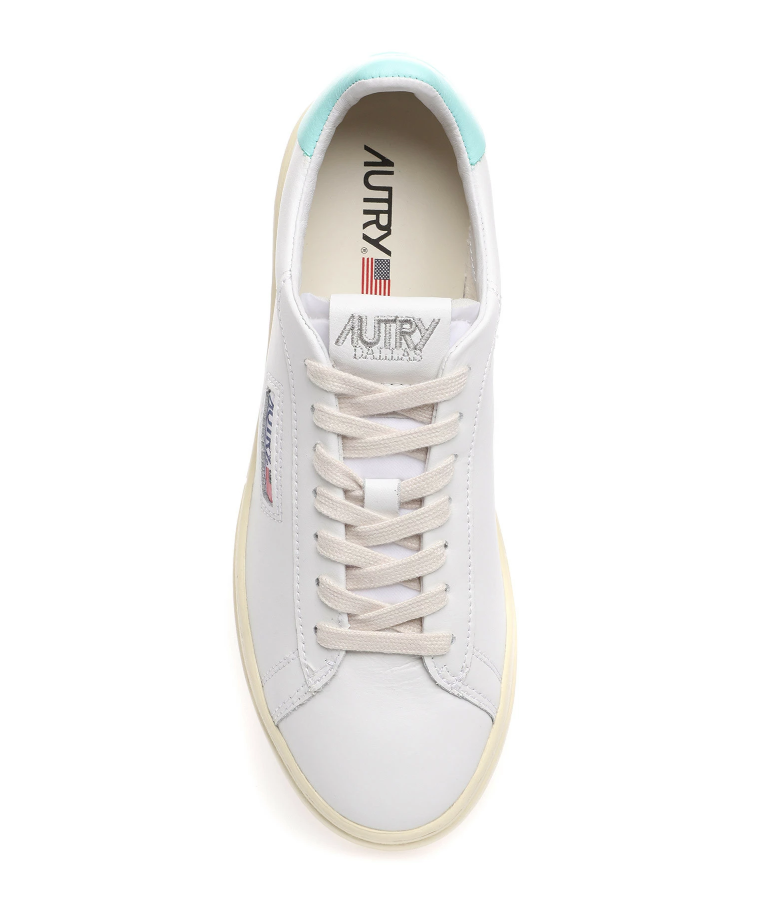 Baskets basses en cuir lisse blanc. Renfort talon en cuir turquoise. Lacets écrus. Logo brodé sur le côté extérieur.