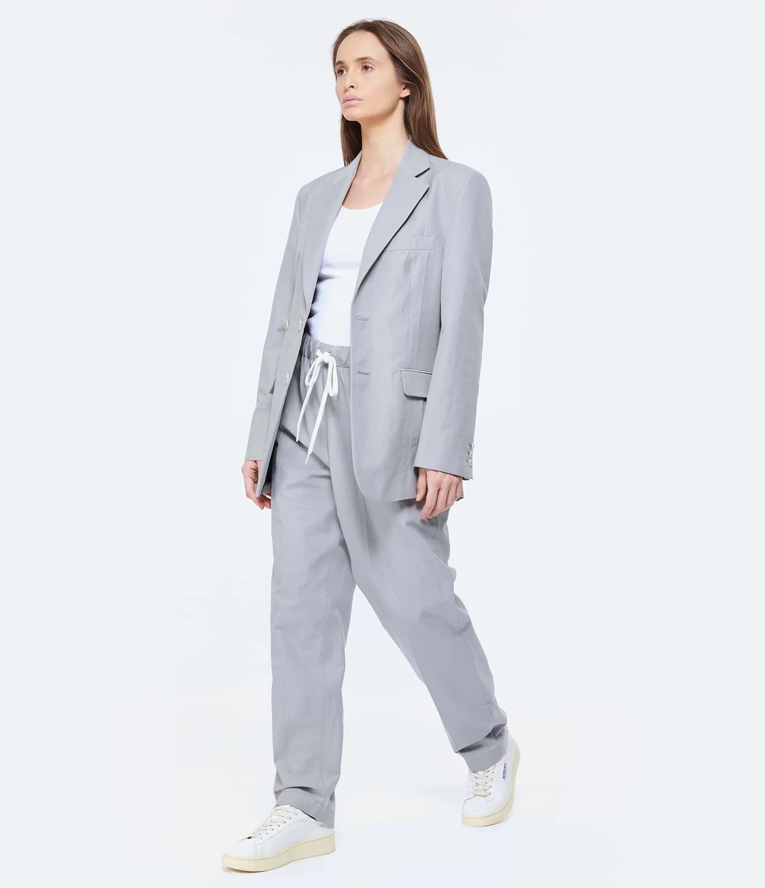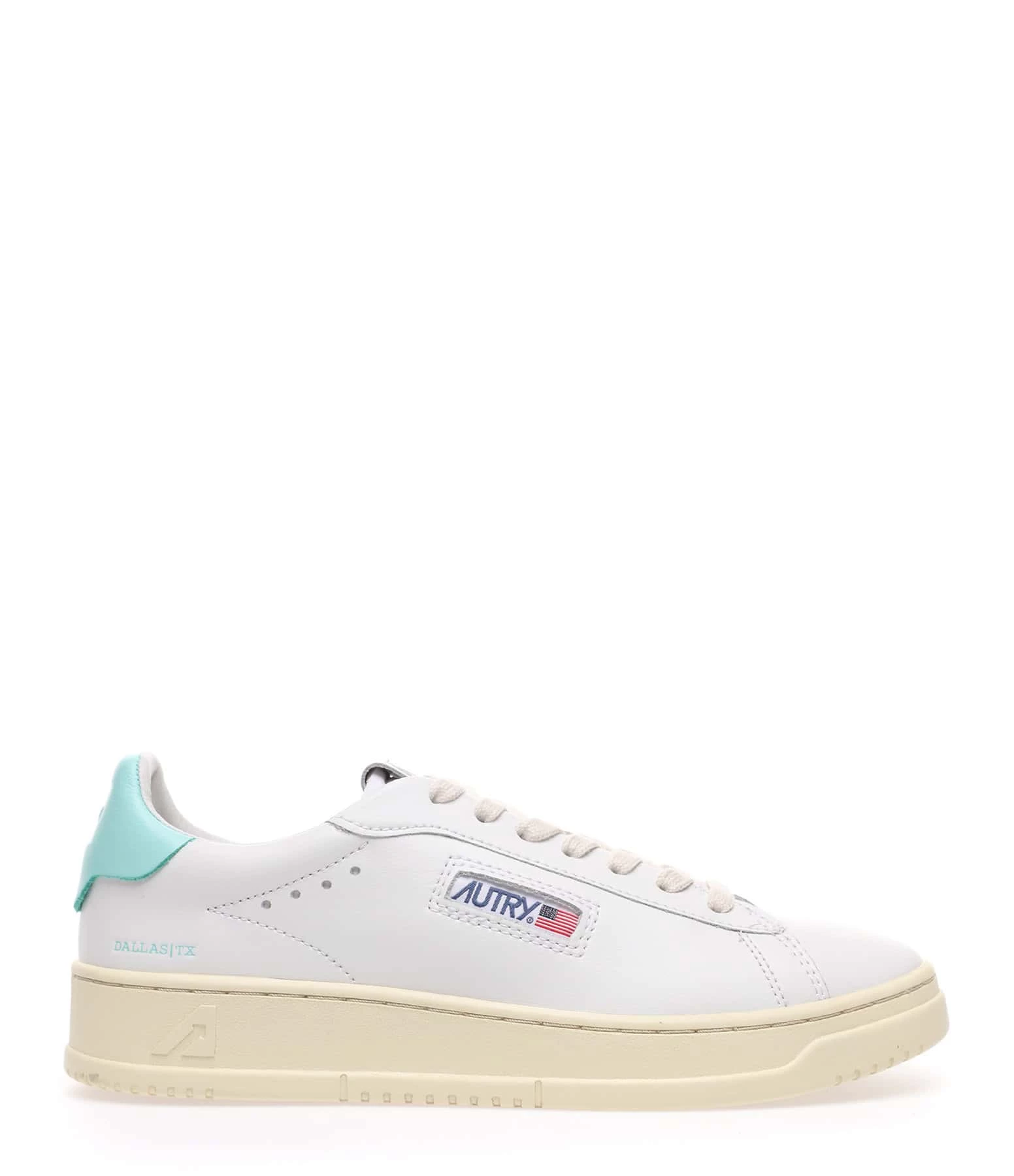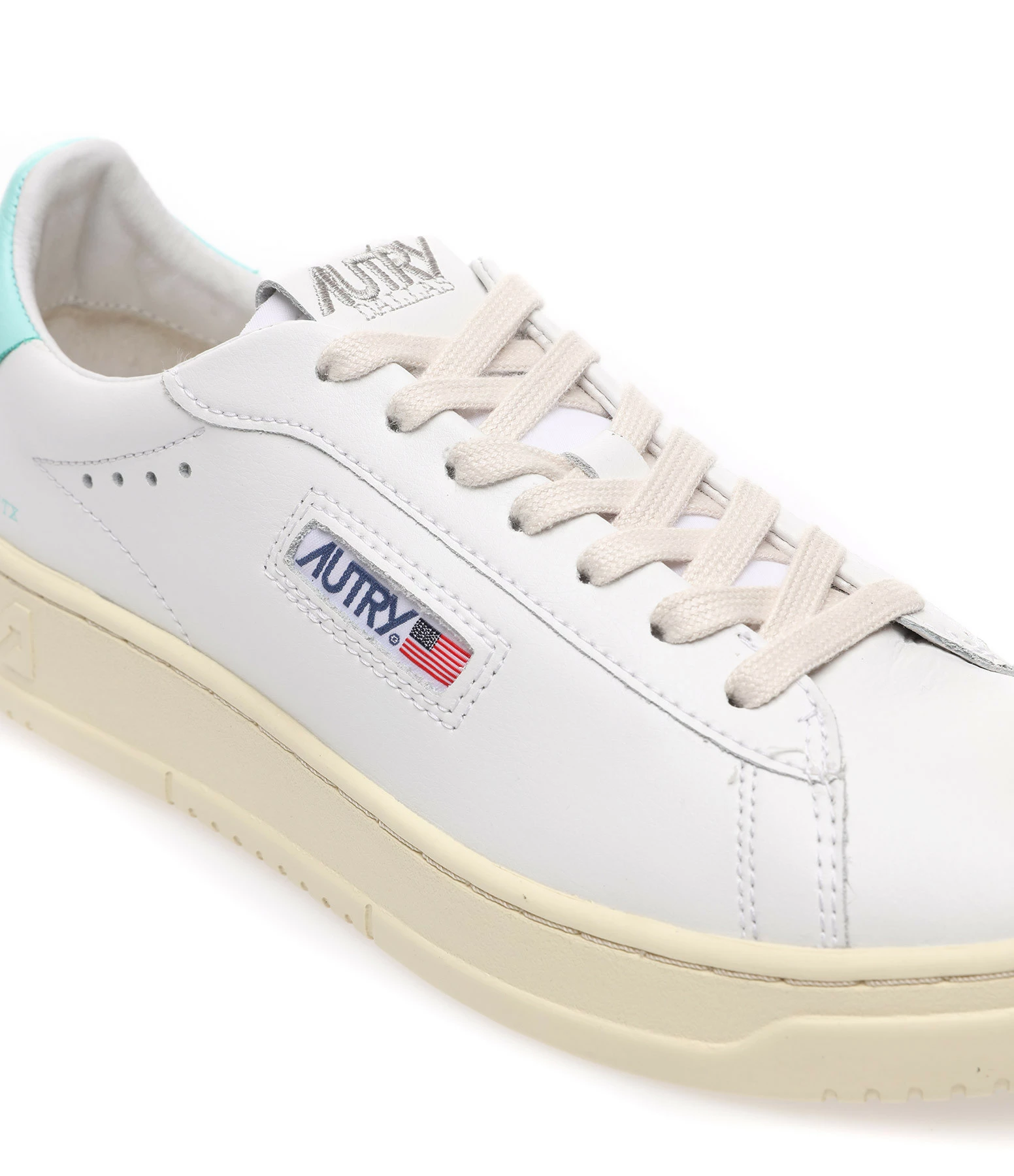 Baskets basses en cuir lisse blanc. Renfort talon en cuir turquoise. Lacets écrus. Logo brodé sur le côté extérieur.