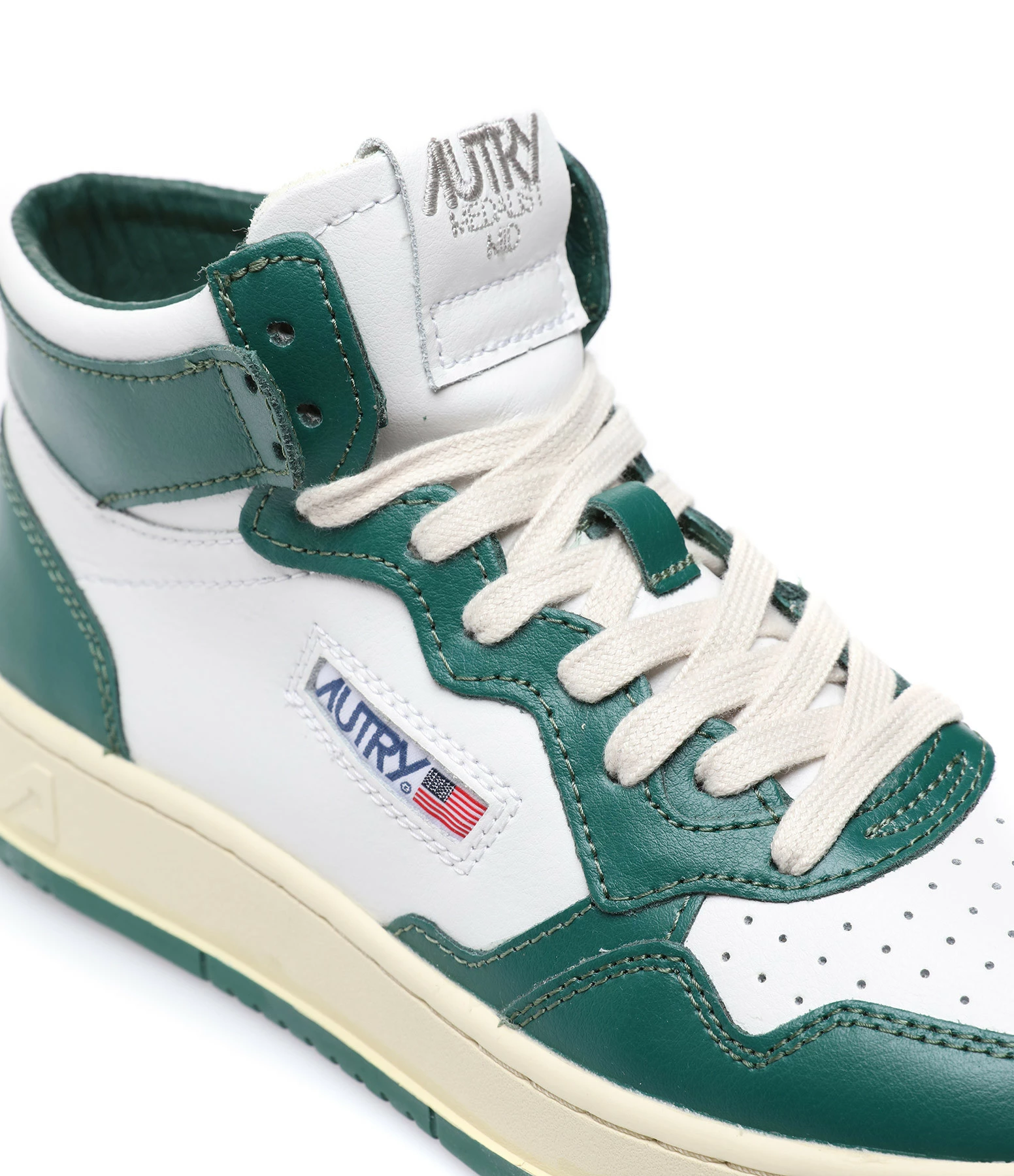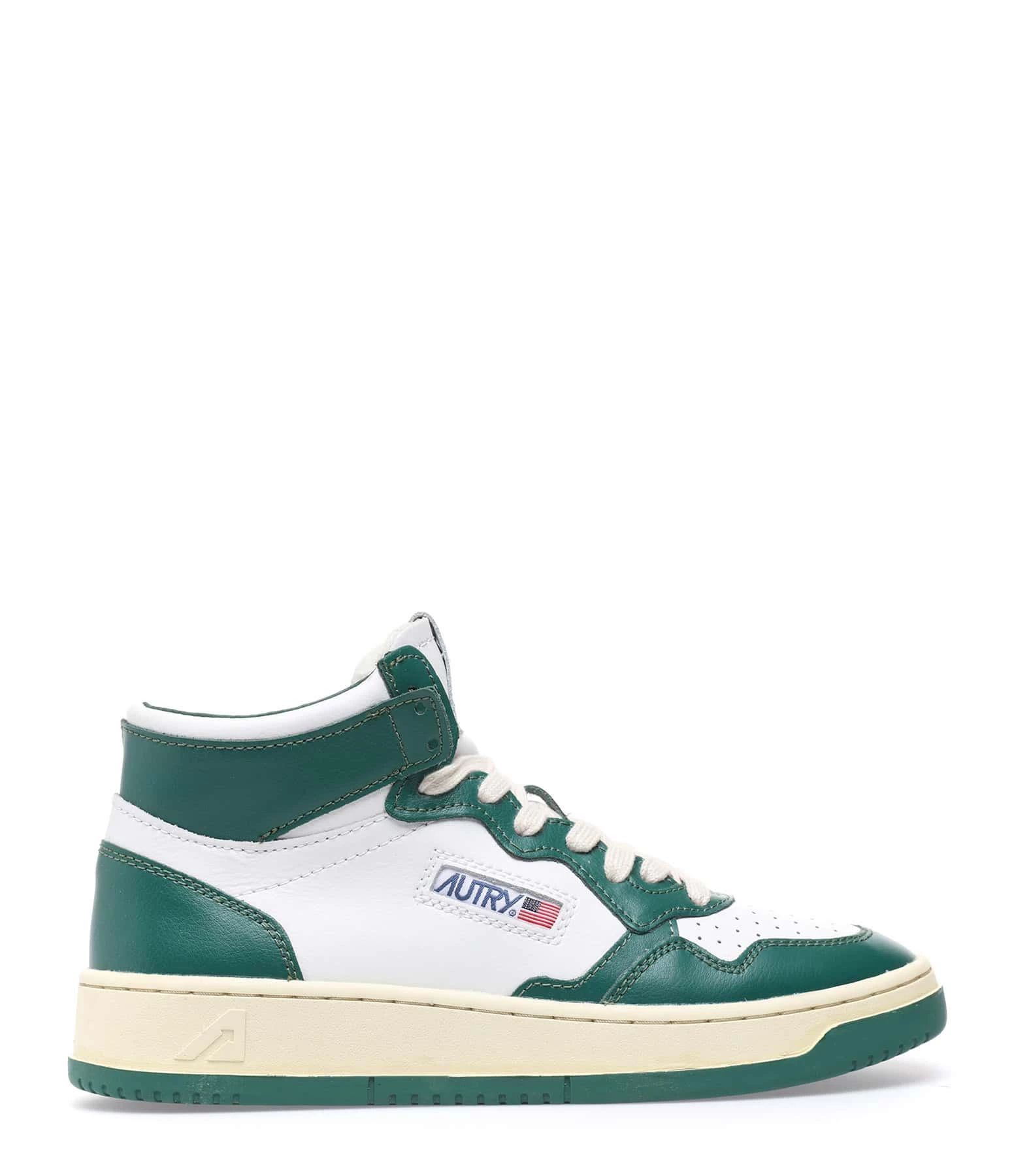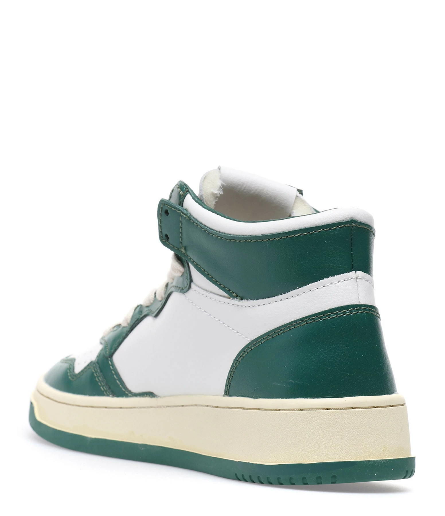 Baskets montantes en cuir lisse blanc et vert. Lacets écrus. Logo brodé sur le côté extérieur.