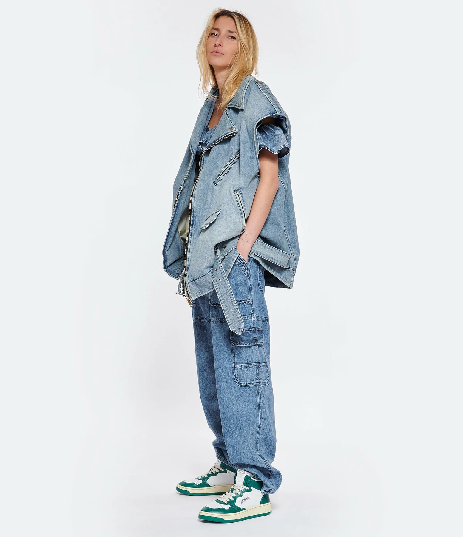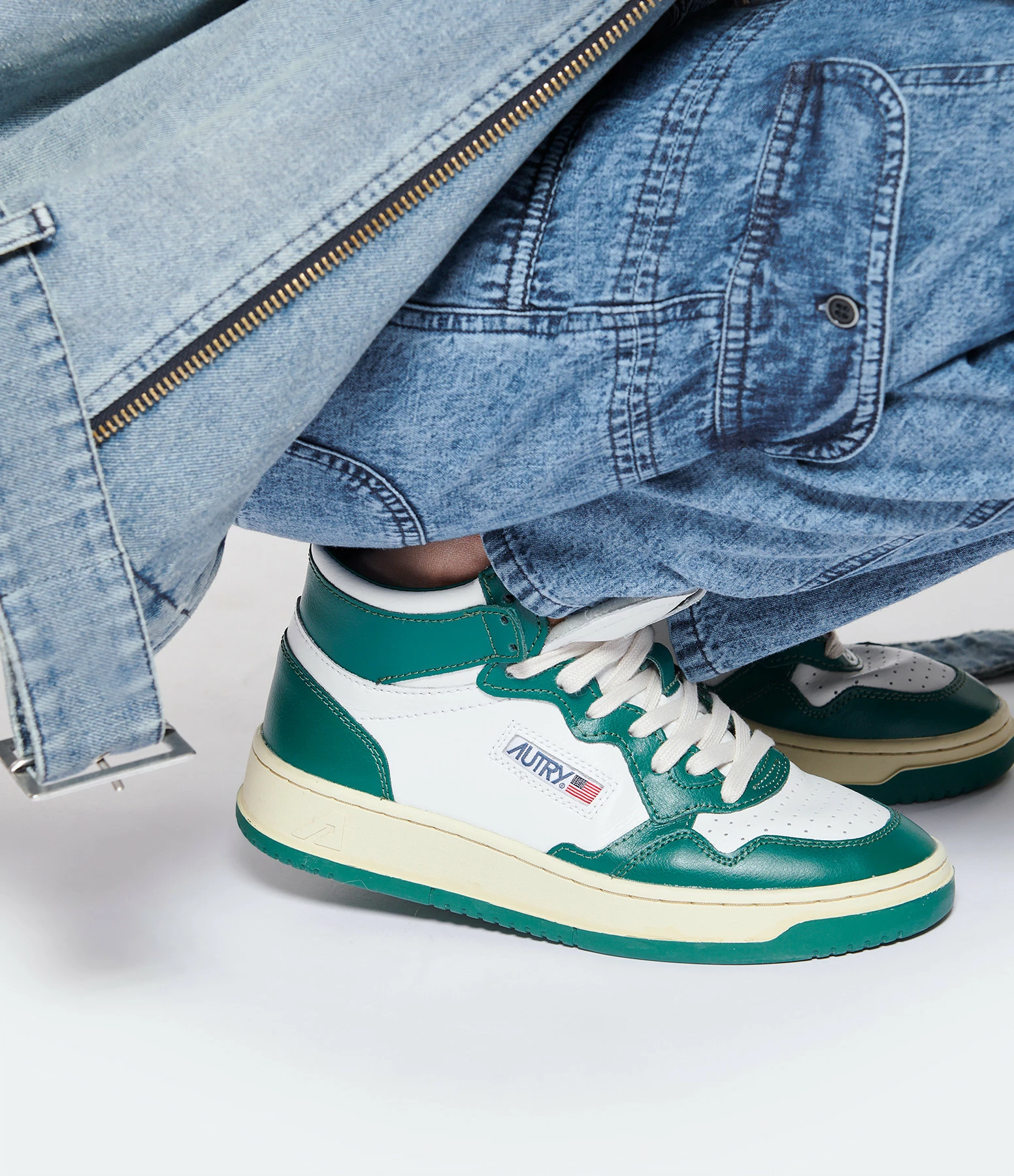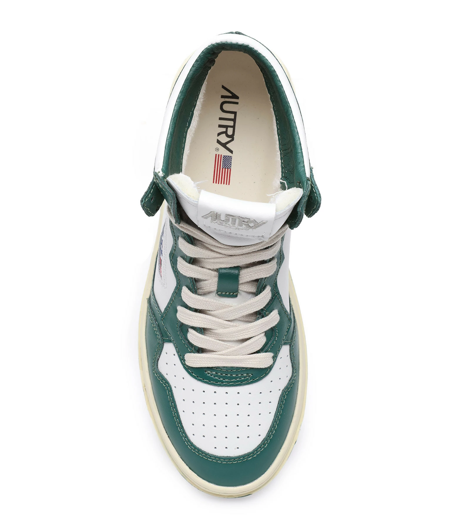 Baskets montantes en cuir lisse blanc et vert. Lacets écrus. Logo brodé sur le côté extérieur.