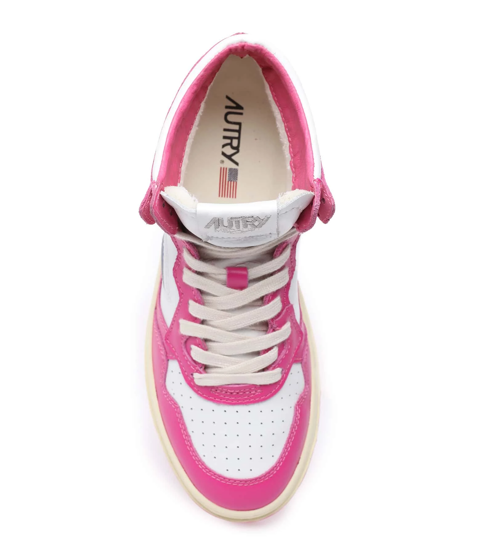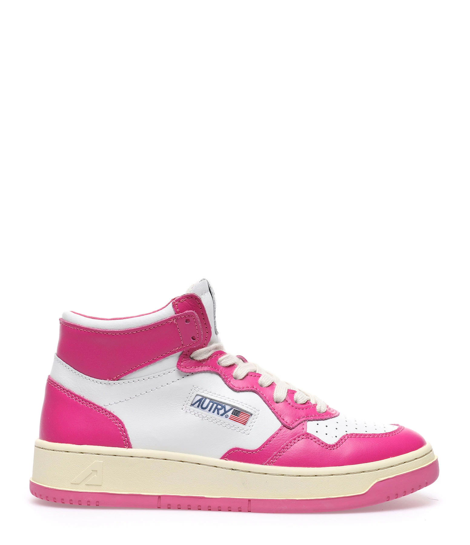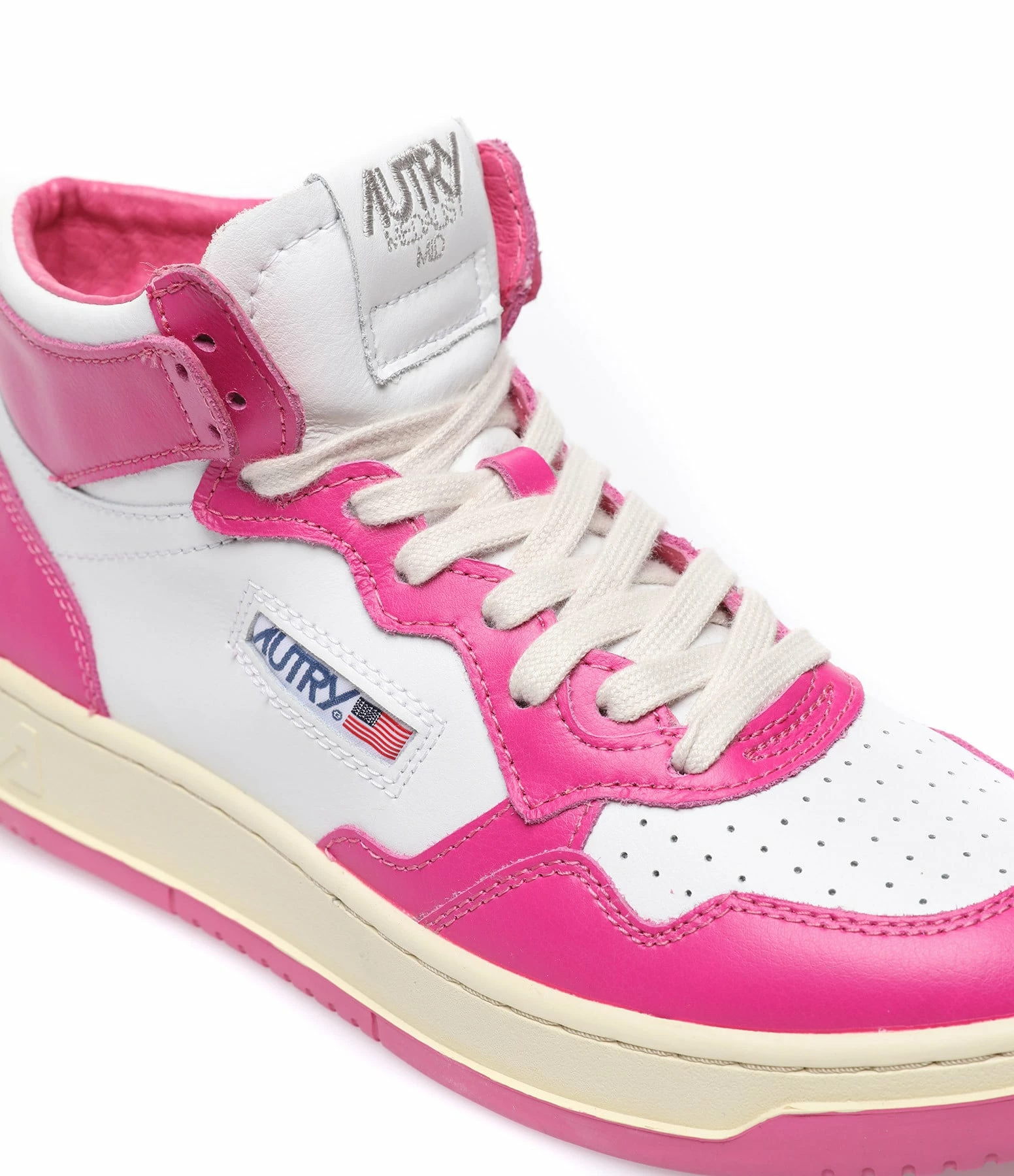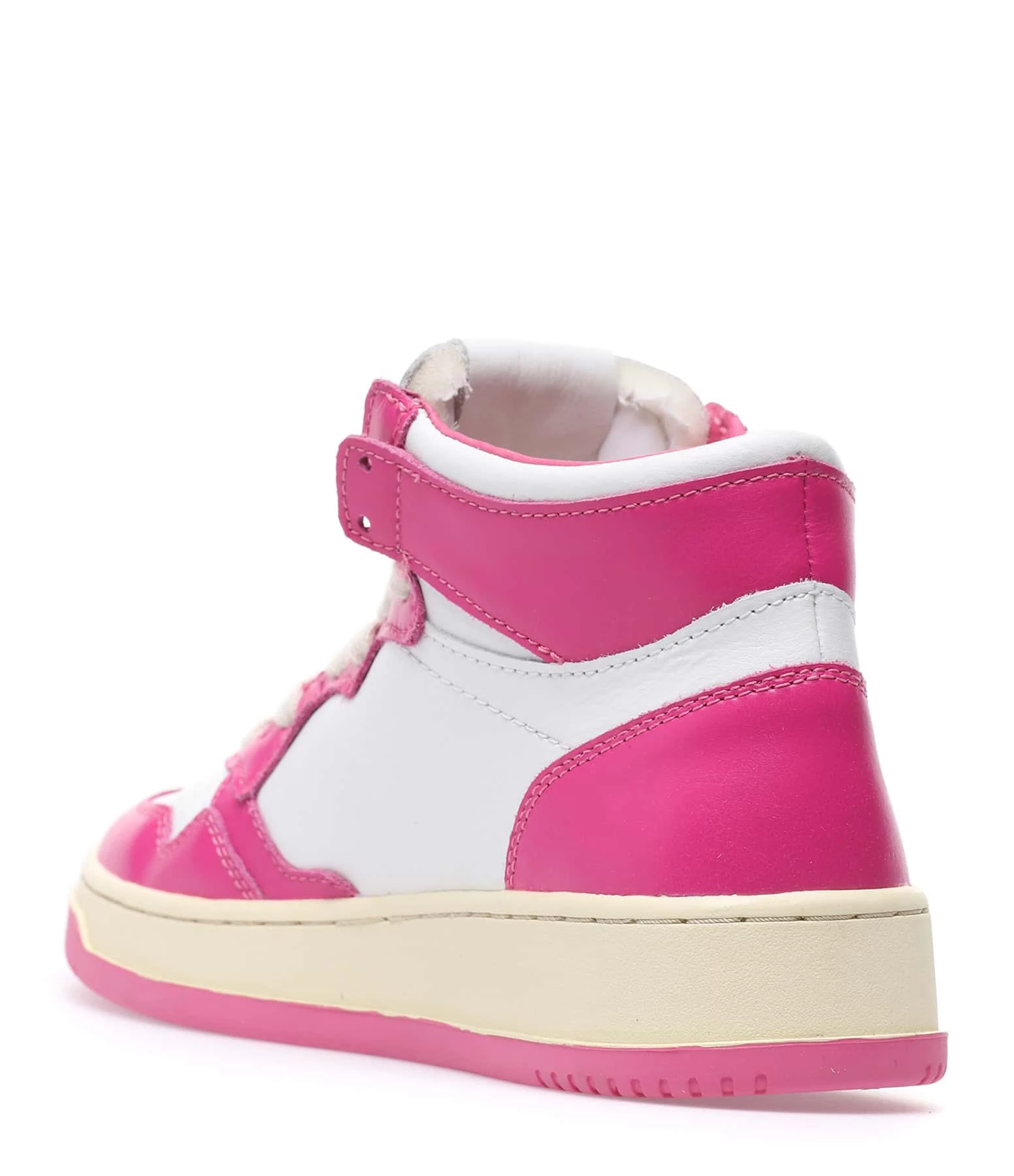 Baskets montantes en cuir lisse blanc et rose. Lacets écrus. Logo brodé sur le côté extérieur.