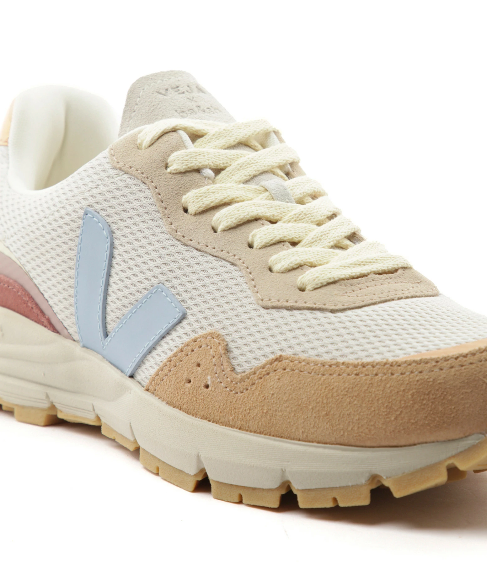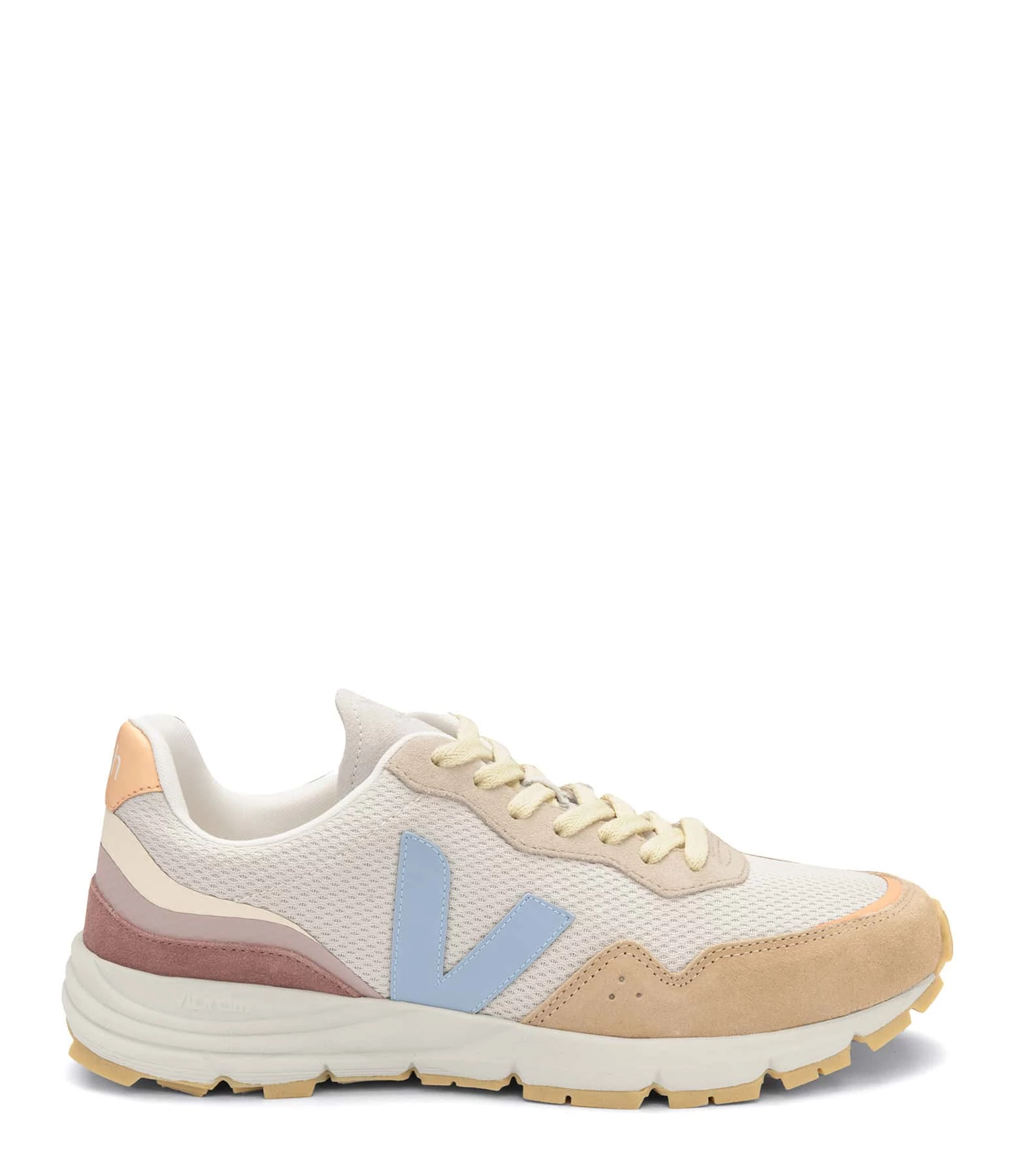 Baskets à lacets en toile multicolore. Lacets écru. Logo latéral “V” en caoutchouc bleu et semelle en caoutchouc beige. Ce modèle est fabriqué uniquement à partir de matériaux écologiques et durables.