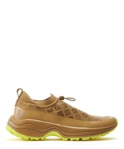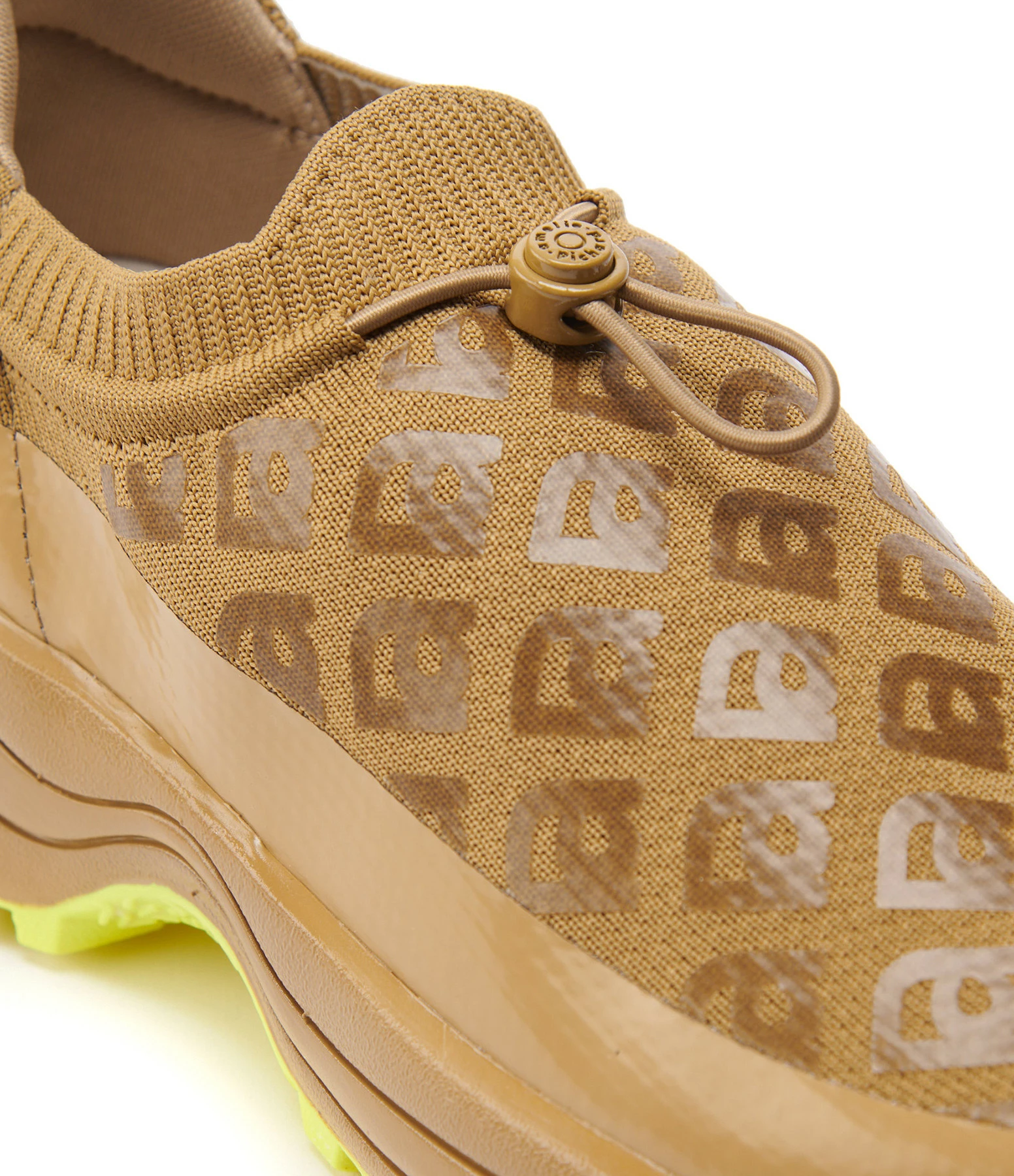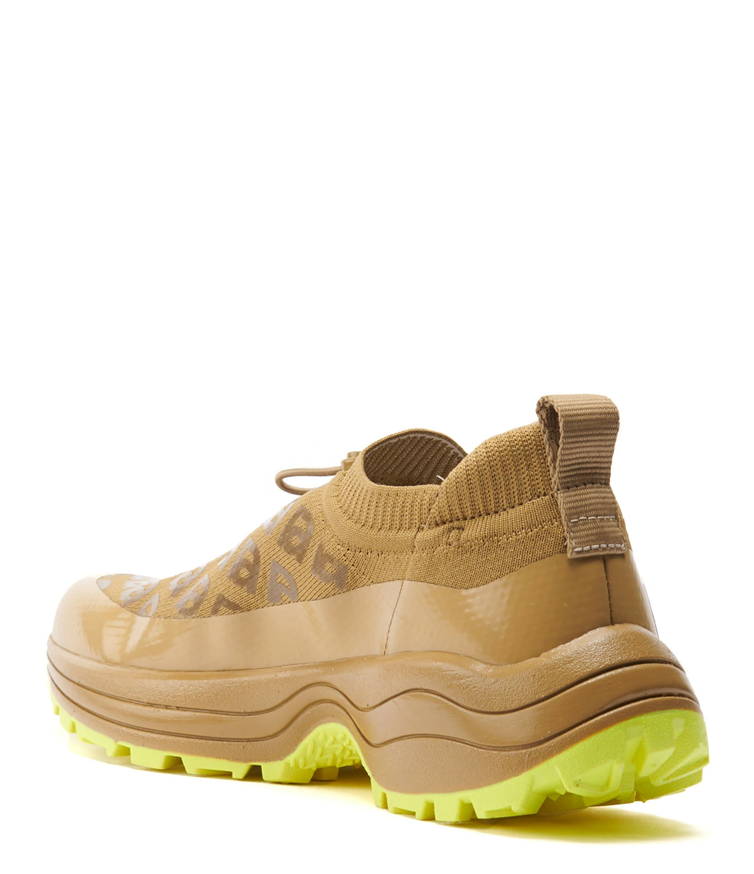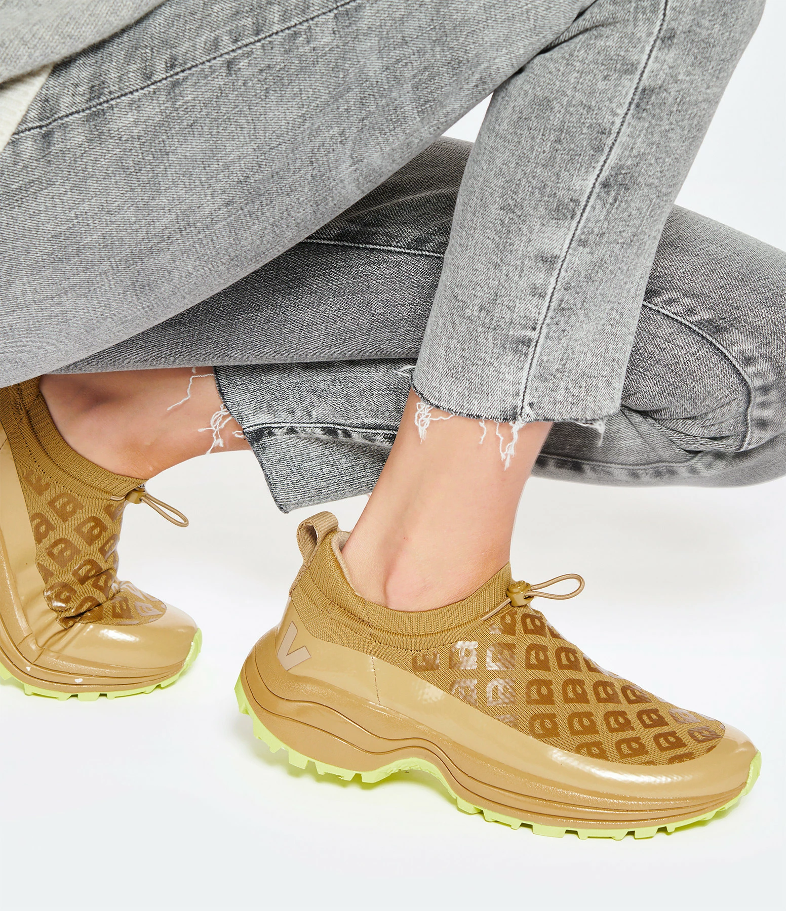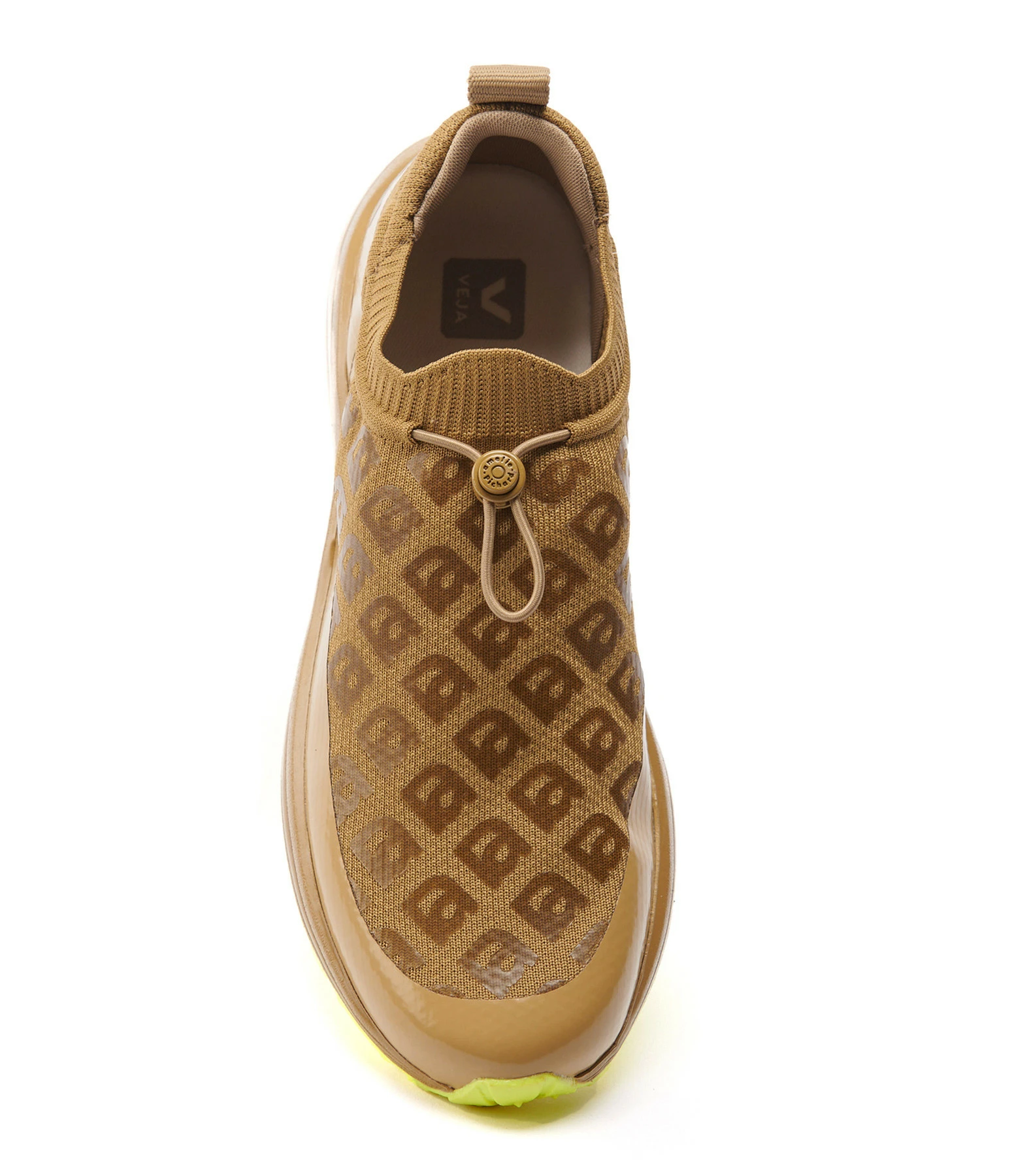 Baskets sans lacets en tissu V-knit marrons. Logo Amélie Pichard sur l’ensemble de la chaussure et logo “V” sur le côté. Semelle marron en caoutchouc sauvage d’Amazonie.