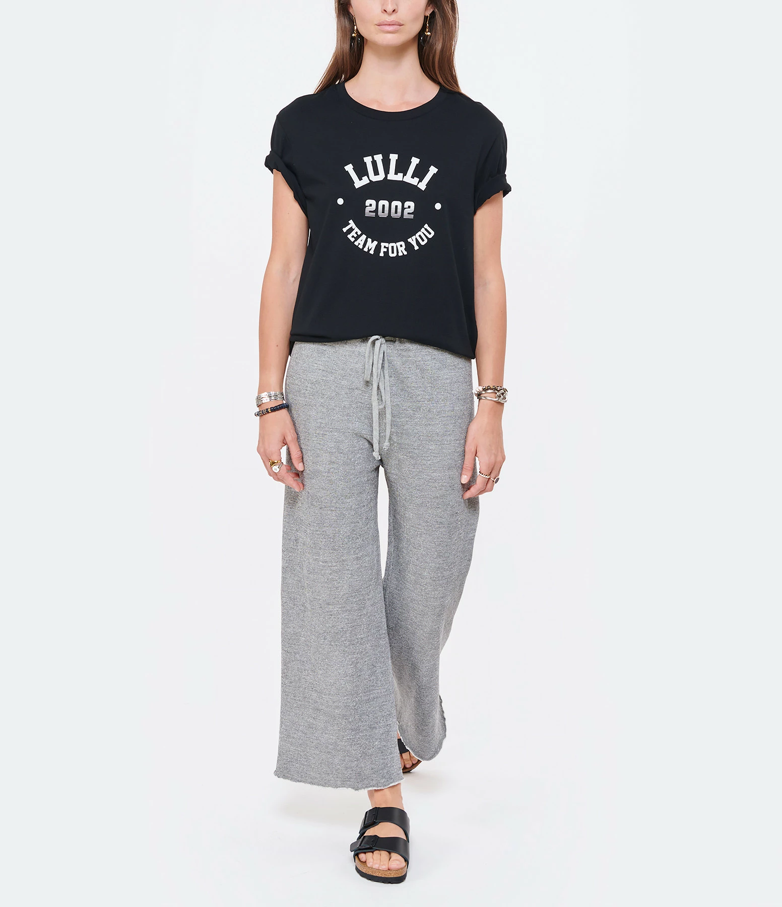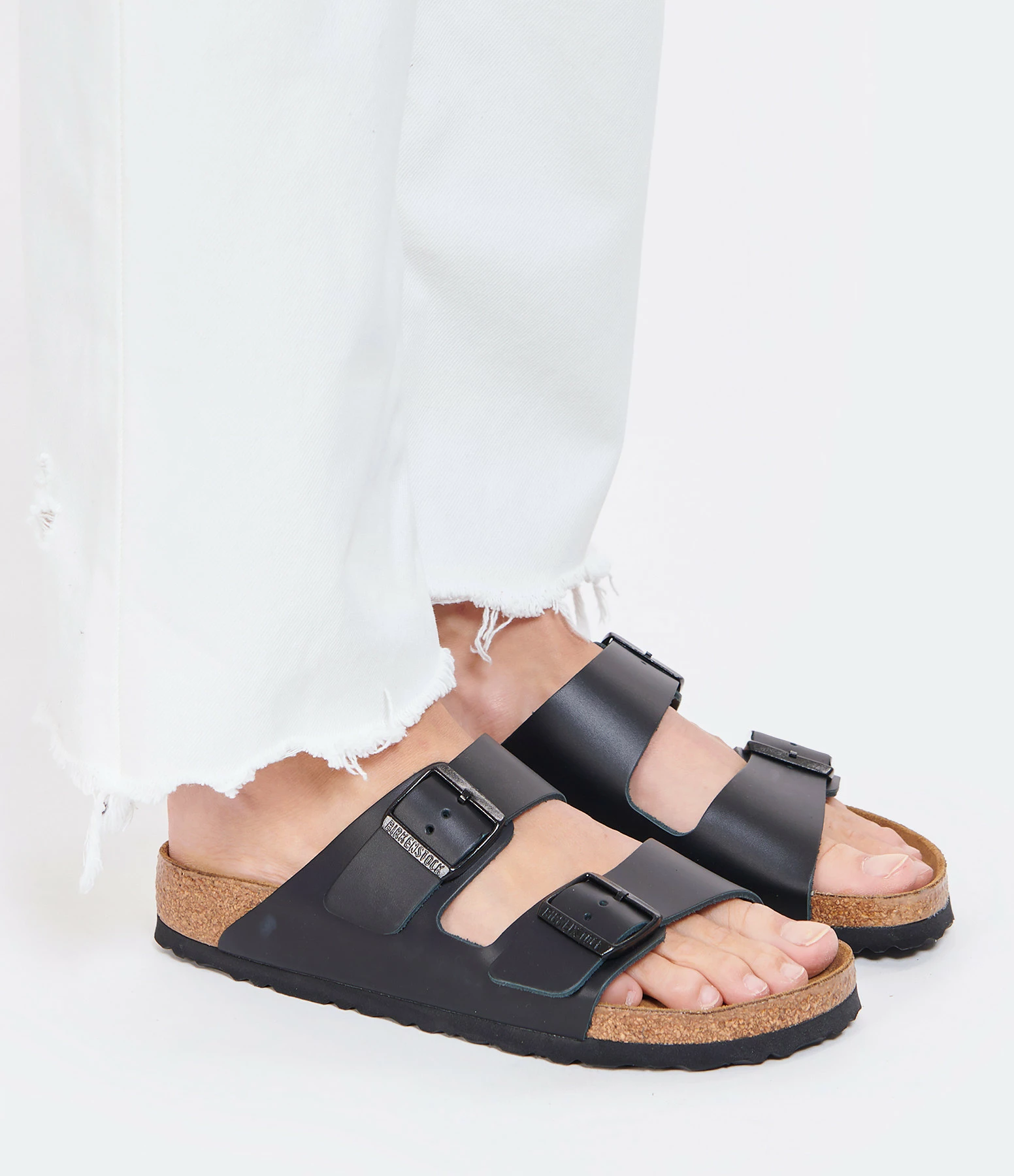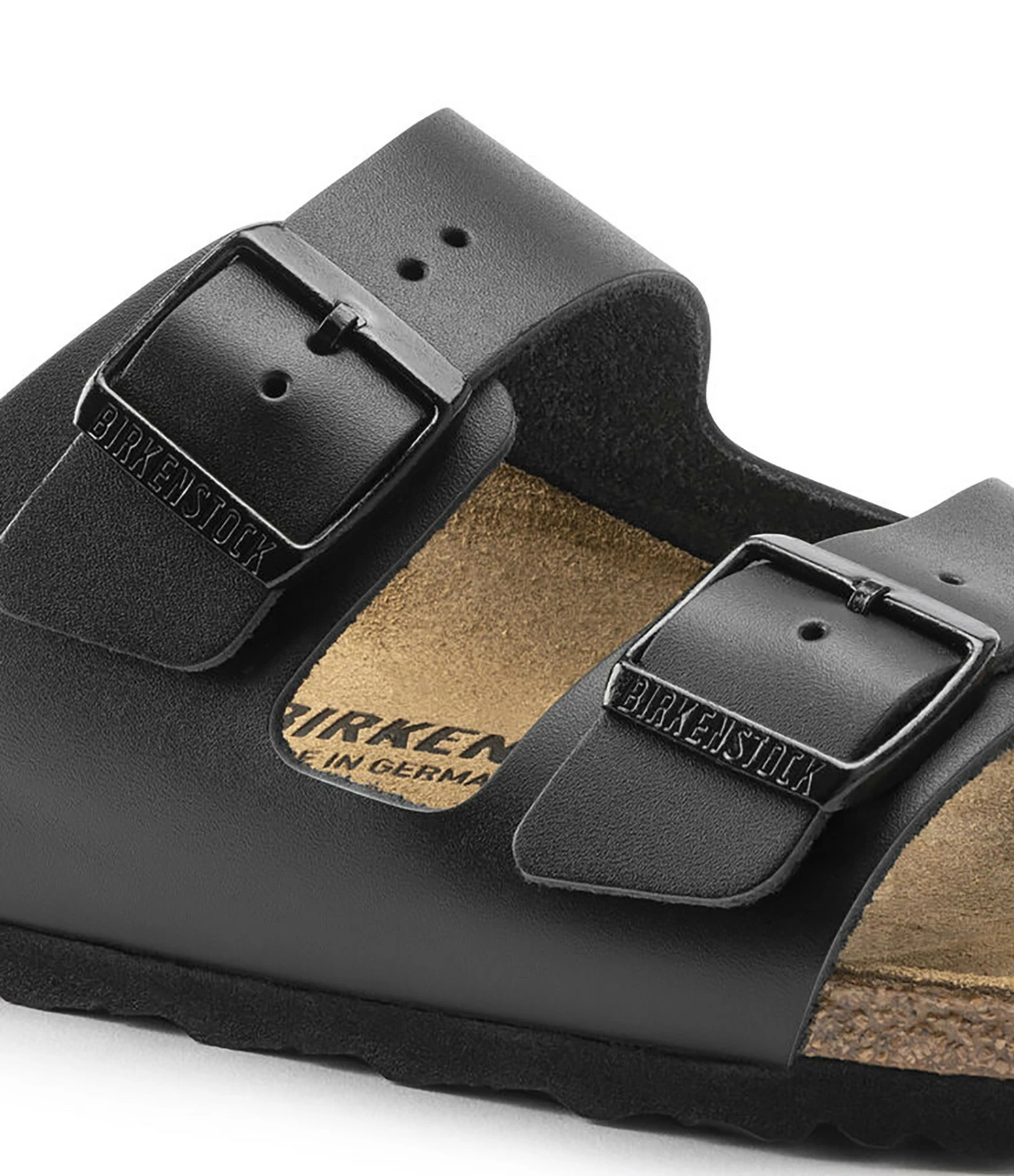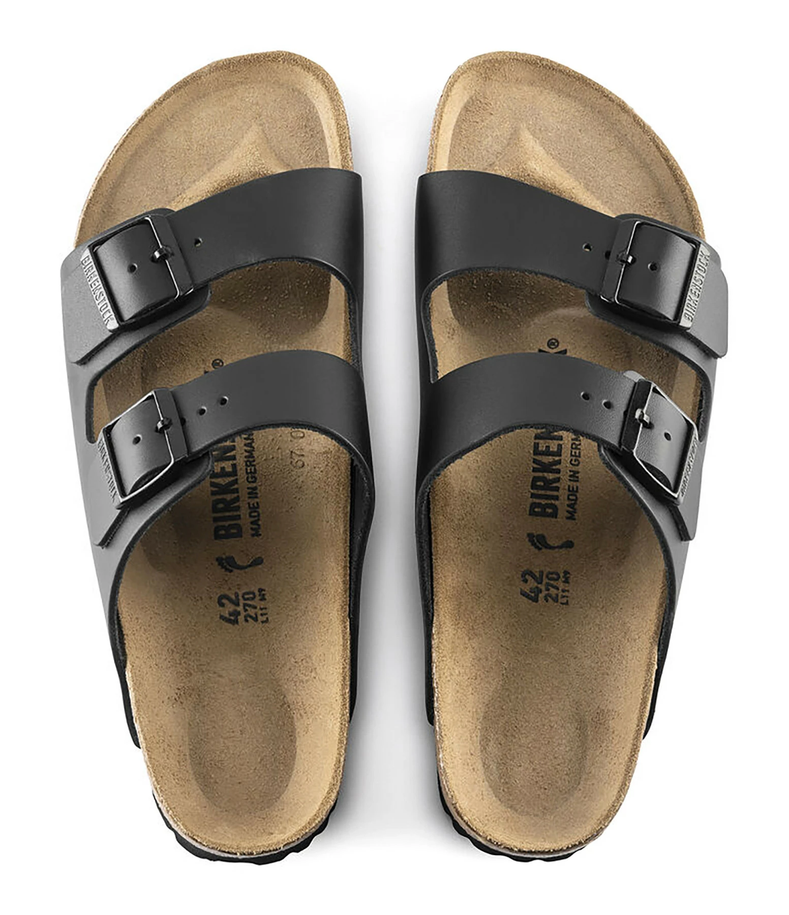 Sandales en cuir noir mat. Deux brides avec boucles métalliques noires. Lit de pied anatomique en liège et latex. Modèle étroit.