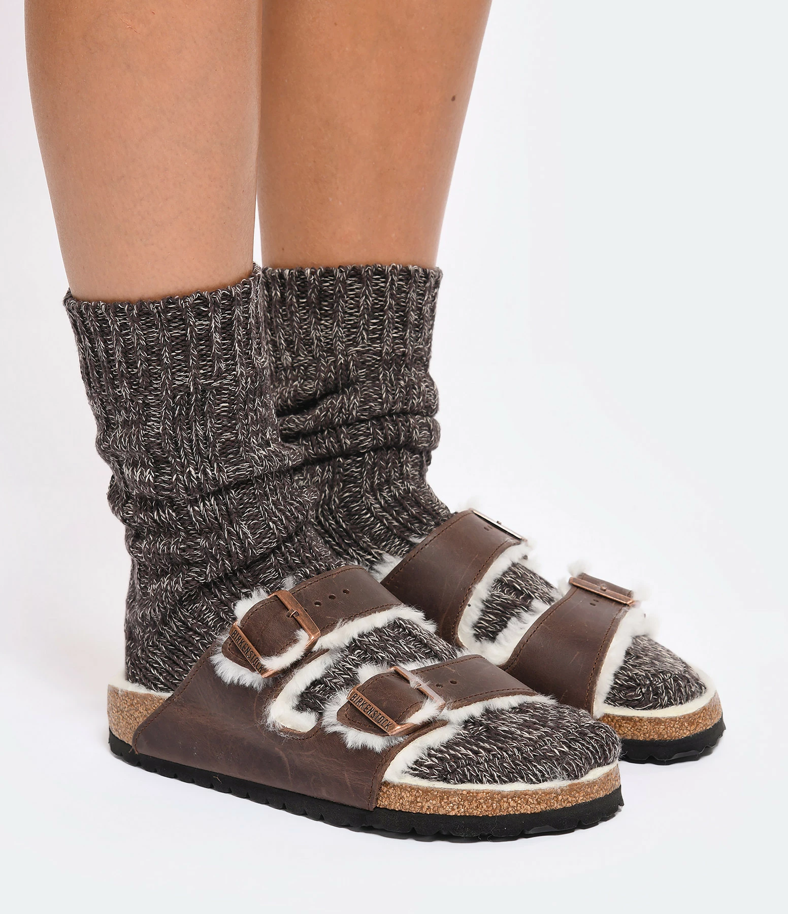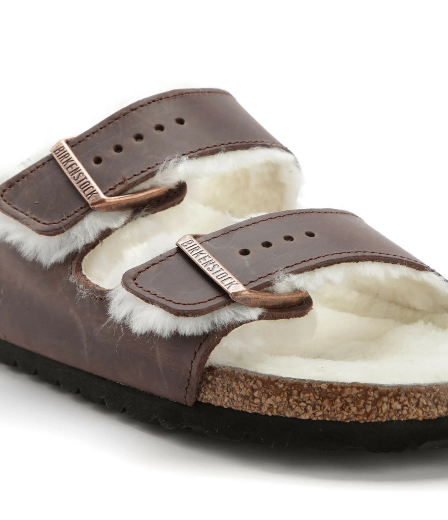 Sandales en cuir marron et intérieur fourrure. Deux brides avec boucles métalliques bronze. Lit de pied anatomique en liège et latex. Modèle étroit.