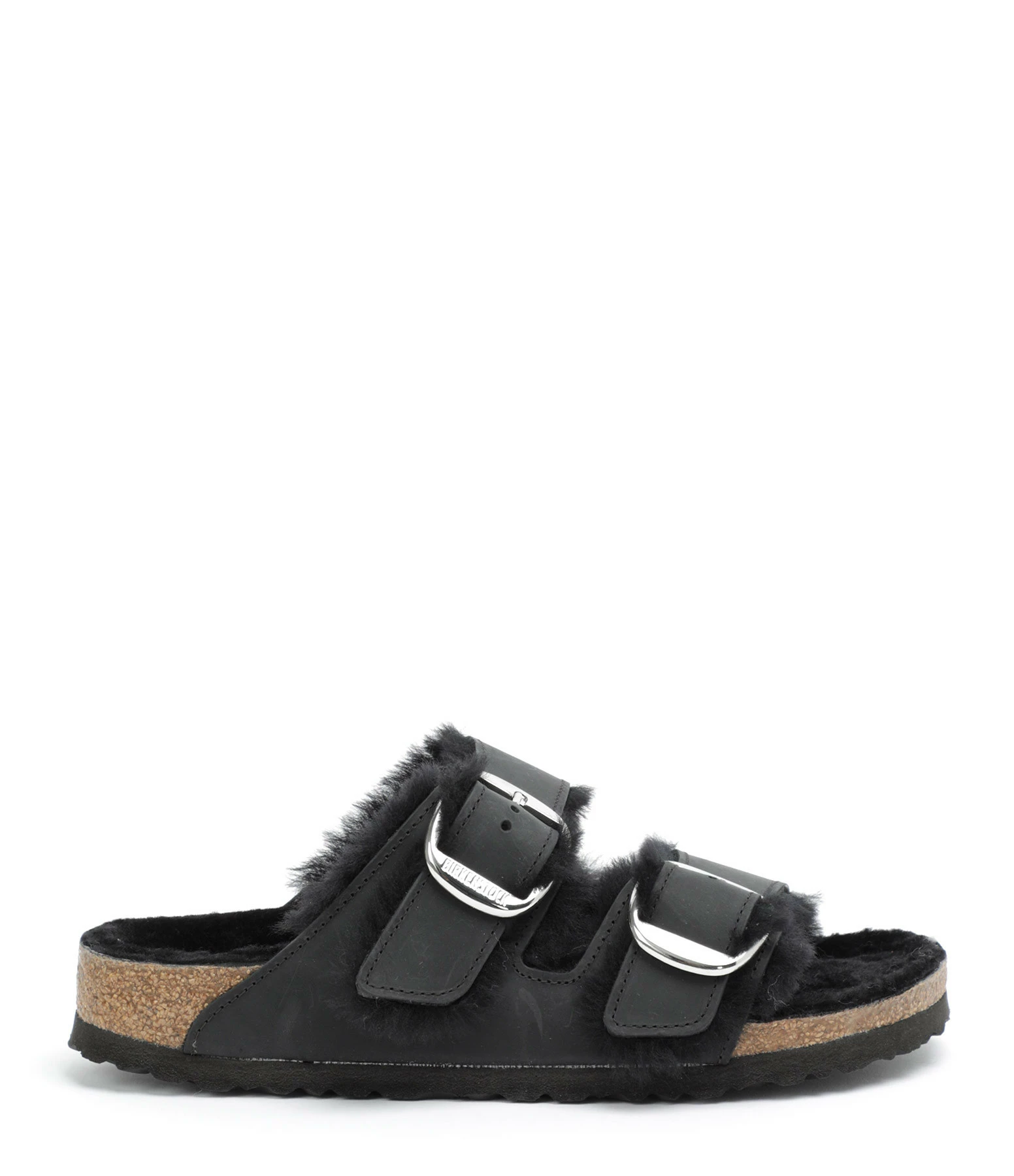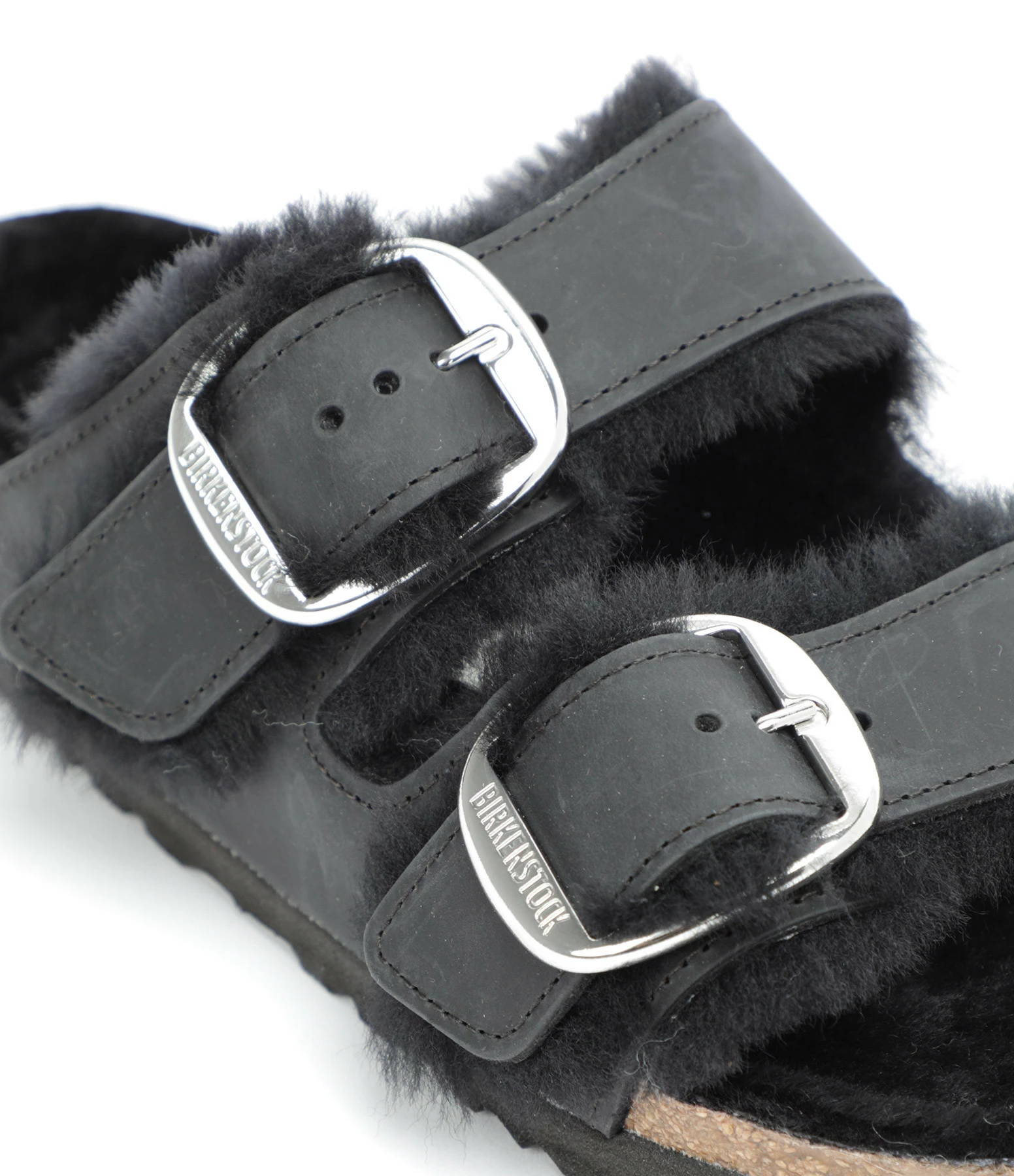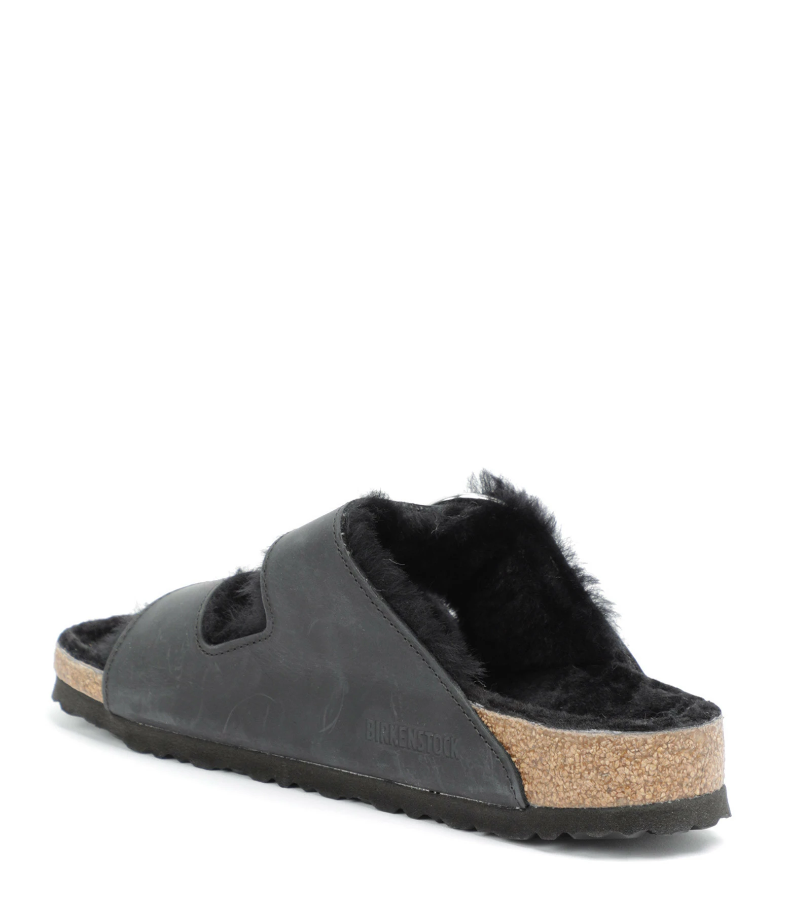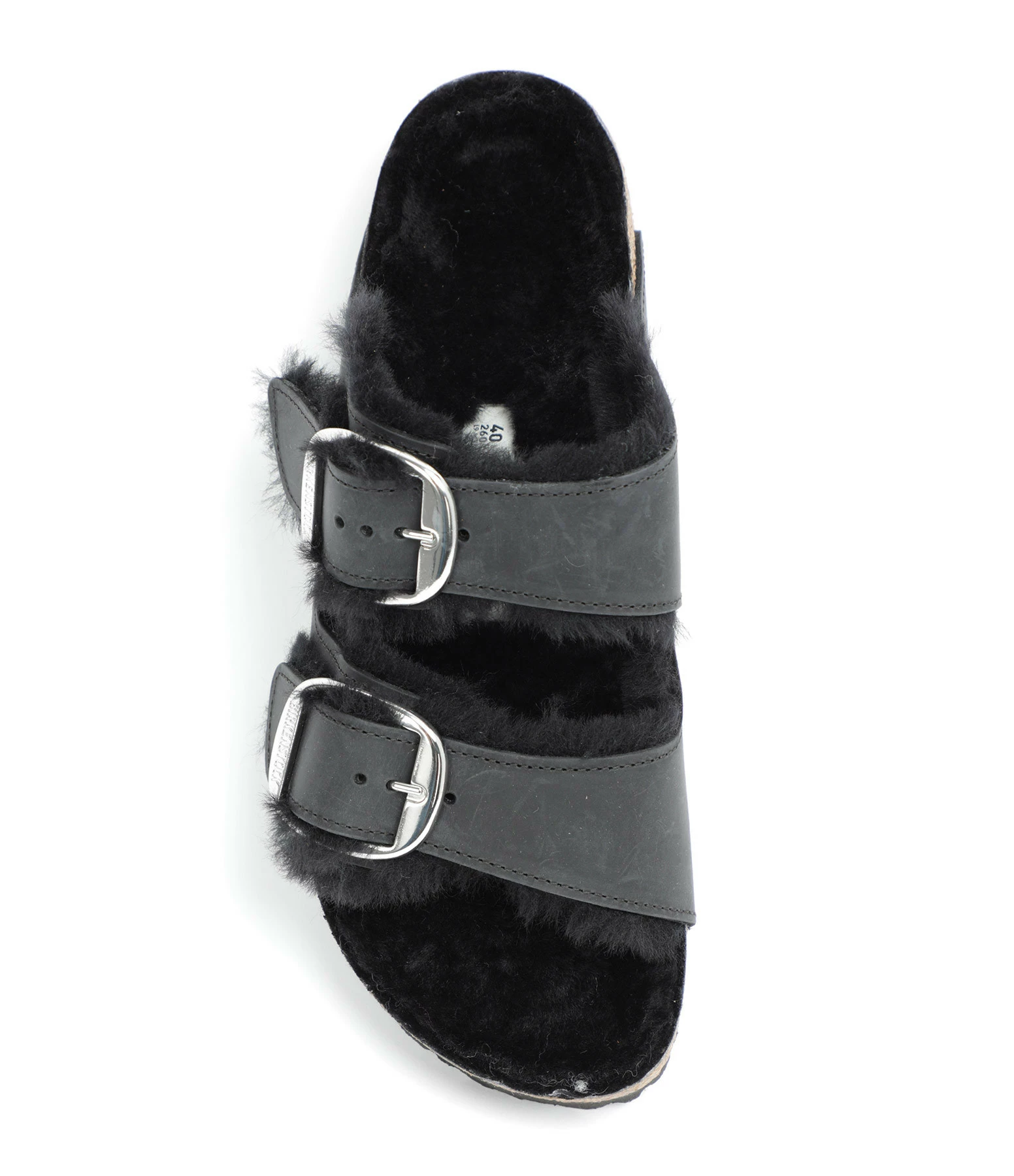 Sandales en cuir noir et intérieur fourrure. Deux brides avec boucles métalliques. Lit de pied anatomique en liège et latex. Modèle étroit.