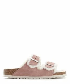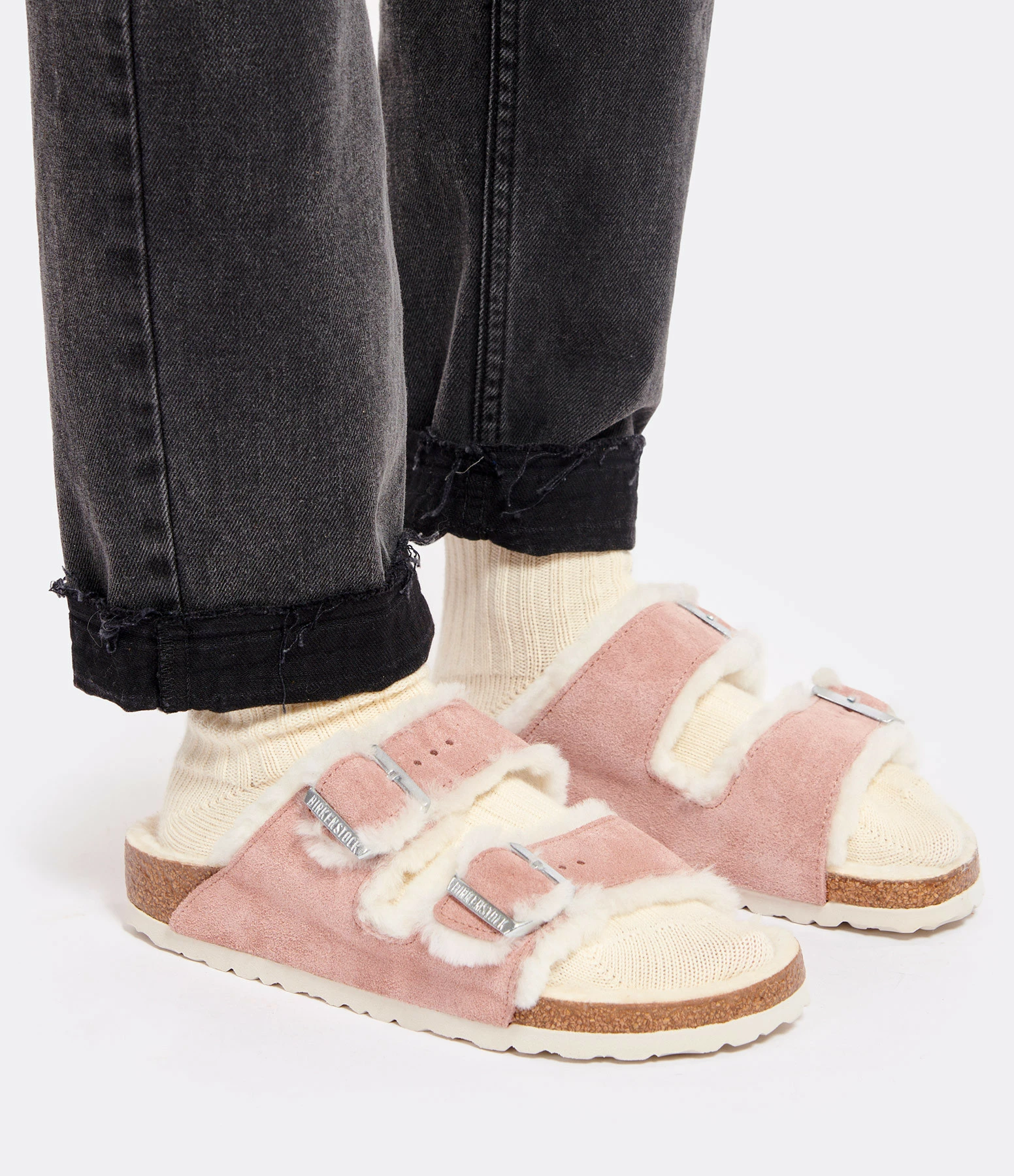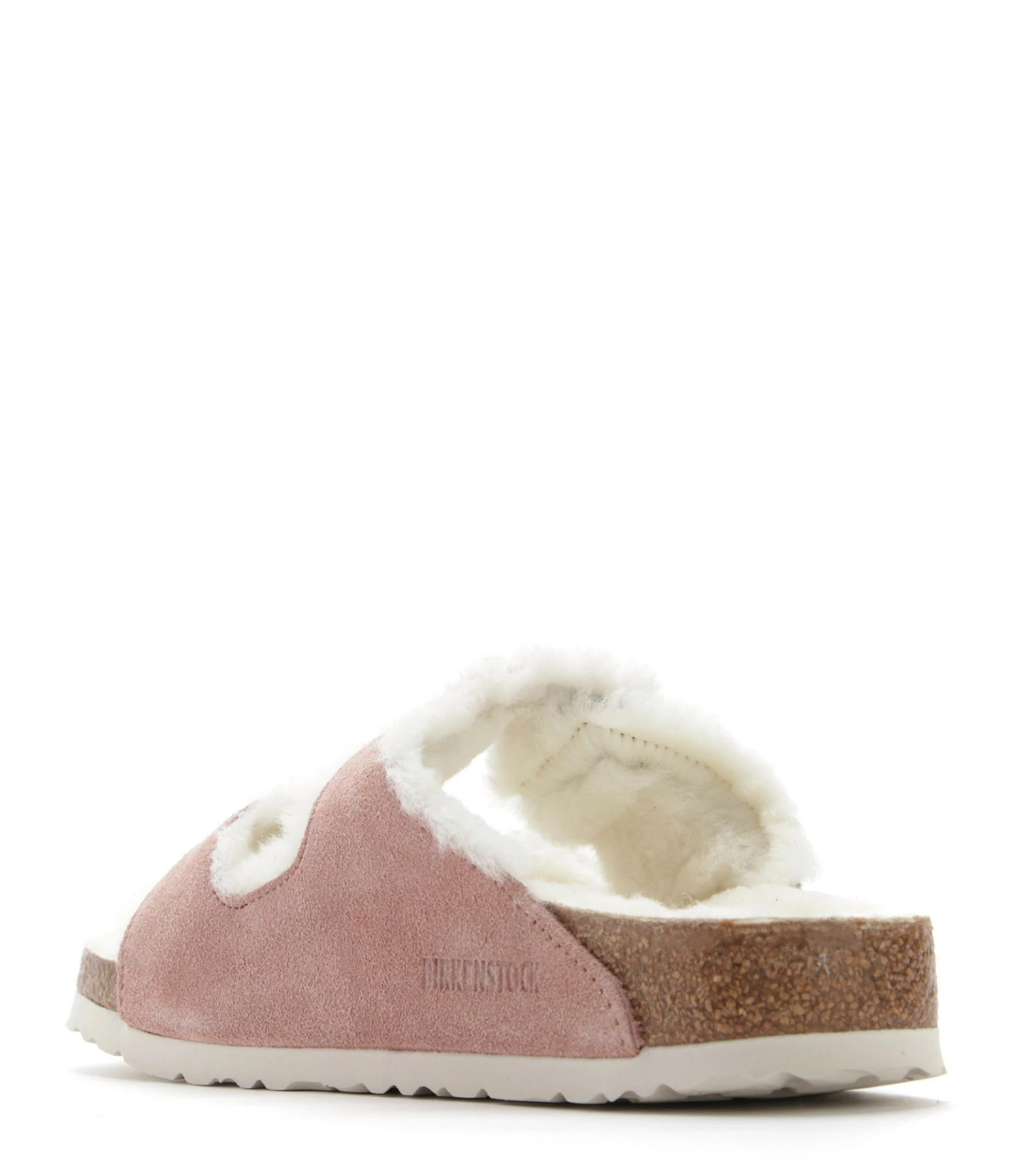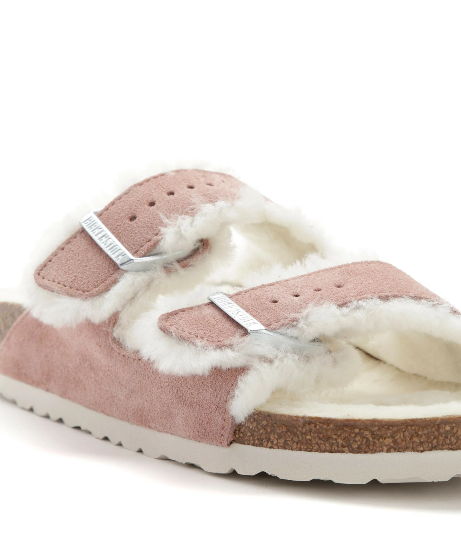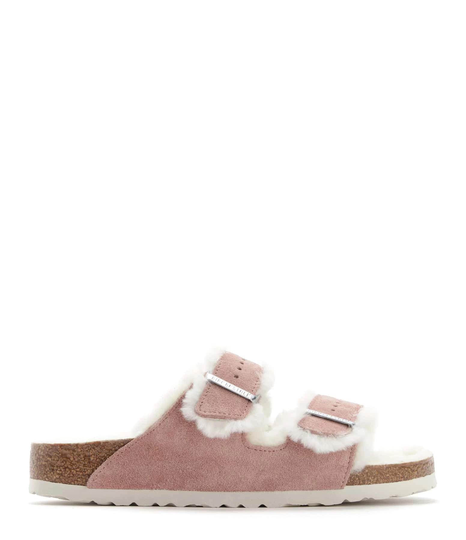 Sandales en cuir suédé rose et intérieur fourrure. Deux brides avec boucles métalliques. Lit de pied anatomique en liège et latex. Modèle étroit.