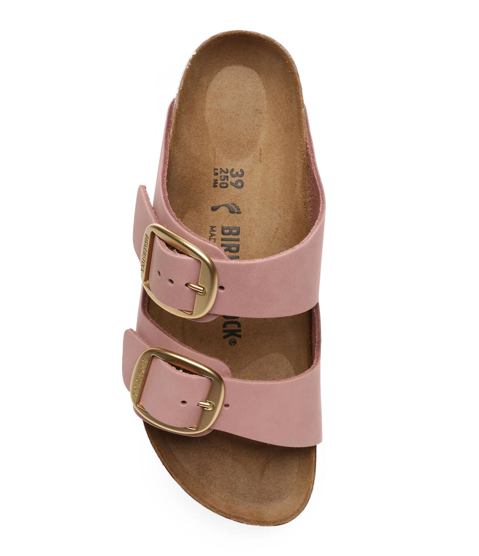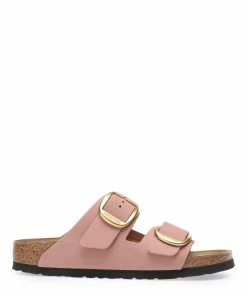 Sandales en cuir lisse rose. Deux brides avec boucles métalliques dorées. Lit de pied anatomique en liège et latex. Modèle étroit.